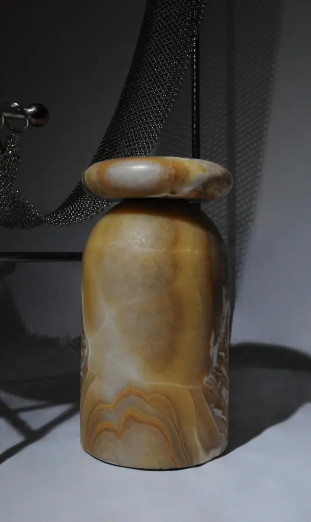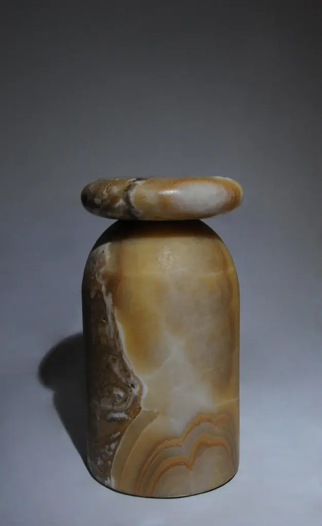 Cult stool/ side table; a hand sculpted stone from a Mexican marble and Mexican onyx conglomerate, remits to primal sculptural-architectural language while displaying materials in a modernist manner. The piece allows for the specificity of the material’s eccentric pattern formations to rein over its final appearance. Each edition; a unique piece.Working with rocks that are endemic to Mexico contextualizes the work at a geological level. Situating the pieces in a continuing and evolving historical narrative. Like taking part in an archeological exploration, working with native stones reveal a heritage of meticulous craftsmanship developed under the possibilities and limitations of local materials. When sculpting stone, you only get one chance to get things right. As each rock is different one must tailor form onto the material, in the way of discovering what each piece hides.Exhibited atLOVE HOUSE: New York (2023)TAGLE: Mexico City (2023) Transatlantico- Galerie Philia: Mexico City (2022) Collectible- Curated Section: Brussels (2022)Origins- MOVIMENTO: Milan (2022)