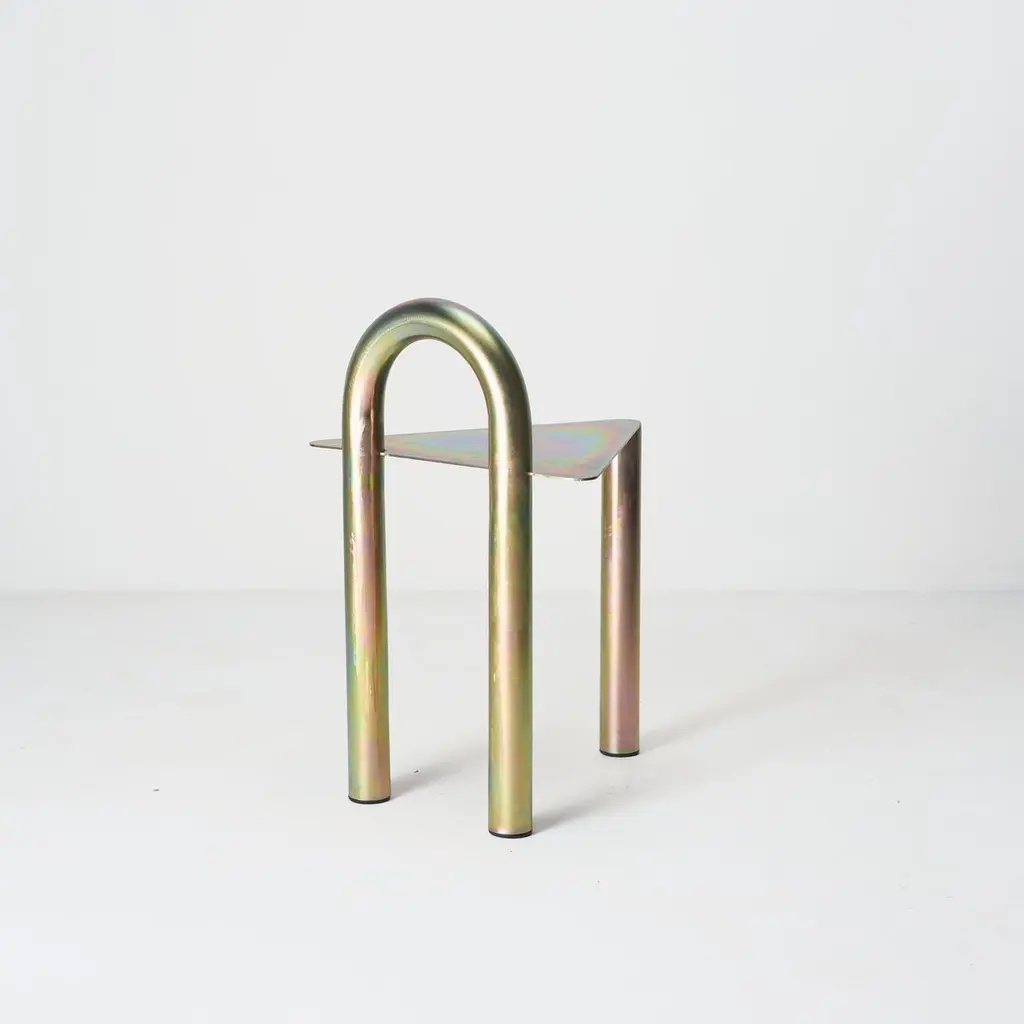 Curva Zincada stool by Cultivado Em CasaDimensions: 43 x 43 x 62 cm Materials: Zinc A common item in steel houses, the 180º curve is the starting point for the development of the collection. Using this element of industrial origin and organic format, we seek to create affable pieces, which transmit softness incorporated into the rawness of the material. In this version, we further reinforce its origin traces through yellow zinc plating, bringing to light this very common finish in the industry, but little appreciated outside of it.Cultivado em Casa is a creative studio, founded in 2014. With a particular interest in experimenting with materials and concepts, it travels through different design practices, exploring the relationship between objects and the space that surrounds us.