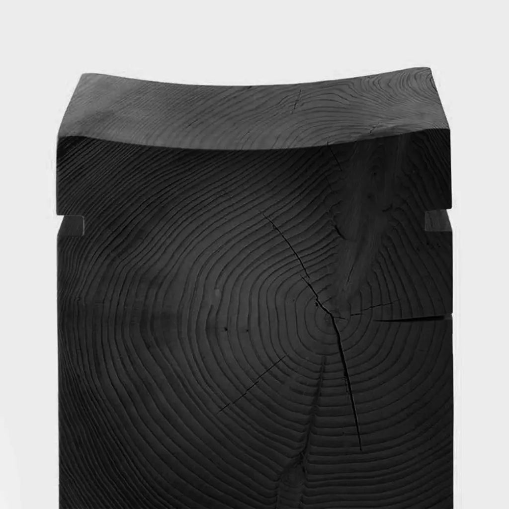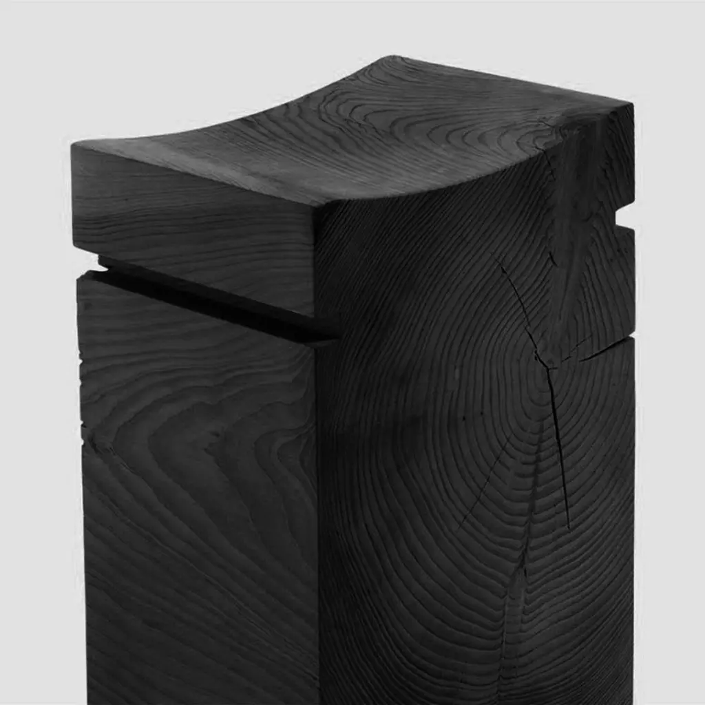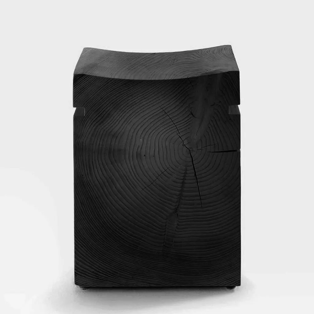 Stool Curvy High Burnt made in a block of natural cedar Trunk, in burnt wood finish. Treated with wax with natural Pine extracts. Solid cedar wood include movement, cracks and changes In wood conditions, this is the essential characteristic of Natural solid cedar wood due to natural settlement And different environmental conditions.