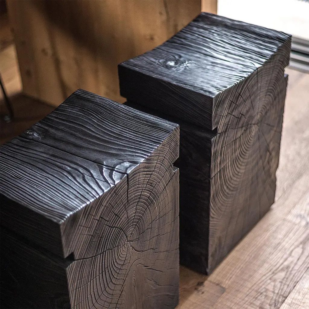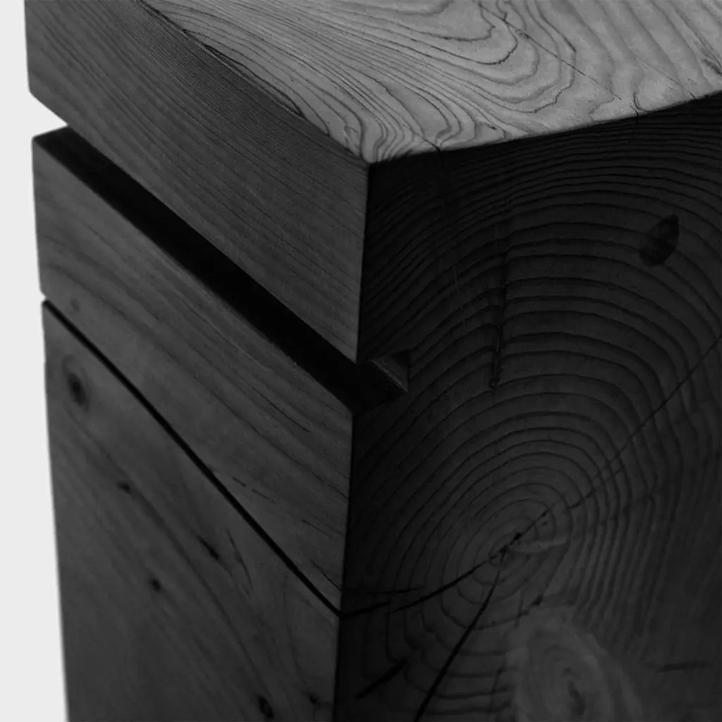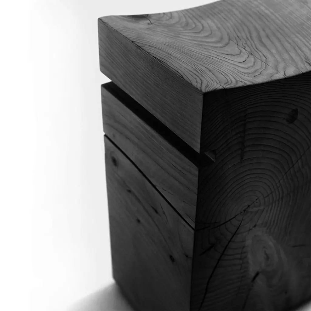 Stool Curvy High Burnt made in a block of natural cedar Trunk, in burnt wood finish. Treated with wax with natural Pine extracts. Solid cedar wood include movement, cracks and changes In wood conditions, this is the essential characteristic of Natural solid cedar wood due to natural settlement And different environmental conditions.