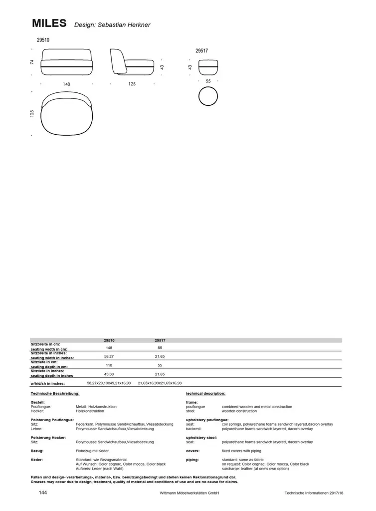 Available in many different upholstery materials.Free standing and free from conventions. In order to satisfy this longing and meet his own expectations, Sebastian Herkner simply created a new category of furniture: the Miles pouflongue is part footrest, part chaise longue and one thing above all else: a small, freestanding island for one or more people. A stage or a retreat, depending on its location. A place to rest, think, work or sleep. Whatever the imagination pictures. Its little brother, Miles footrest, can be placed next to it is as an object, or used in combination with fellow family members Miles lounge chair and Miles sofa. The pouflongue and footrest appear to float, as an island, on the surface, supported by invisible Teflon sliders. And so that they harmonise beautifully with the slightly more raised sofas and lounge chair, the piping is executed at the same level in all models. A treat for the eyes, and typically Wittmann: cleverly thought-through down to the very last detail.