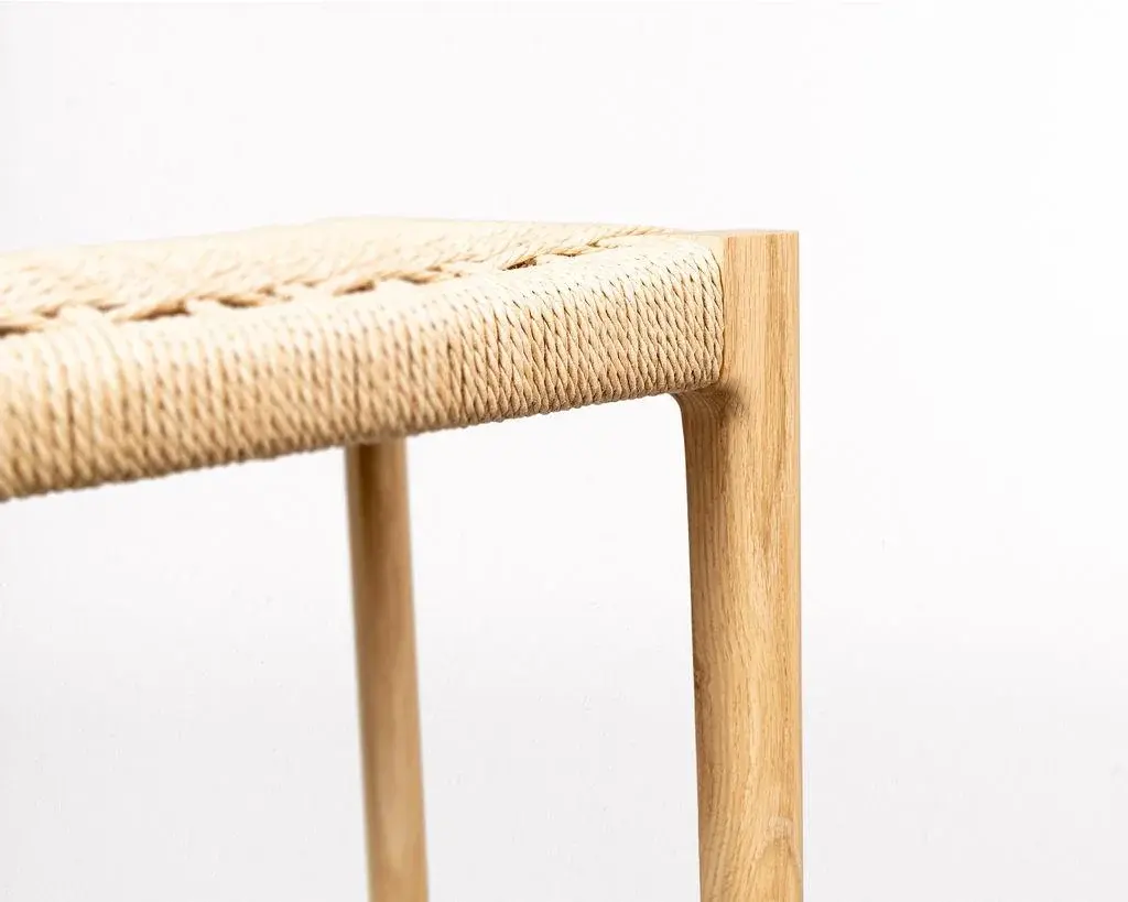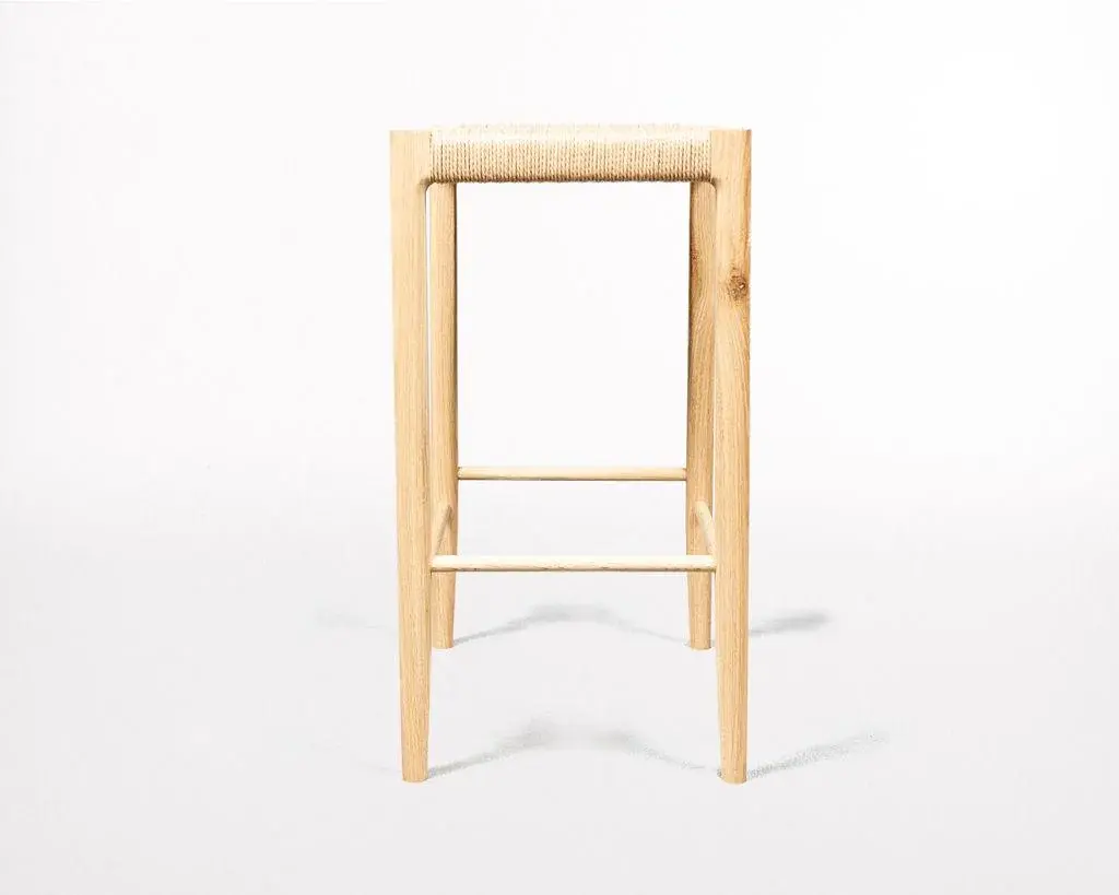 Papyri Stool in Walnut with Handwoven Danish Cord Featuring a mortice and tenon frame and handwoven seat, the Papyri Stool is artisan-crafted from recyclable paper cord, and sustainably harvested walnut. The seat features a continuous run of Danish paper cord woven around "L Shaped Nails" in a traditional binder-cane method of warped pairs. The stool frame is constructed with floating tenon joinery and each leg is hand-sculpted with spoke shave and file for flowing transition between frame and seat. The stool is finished with a 100% plant-based, hard-wax oil. Shown in White Oak + Natural Cord Finished with 100% plant-based, hard-wax oil