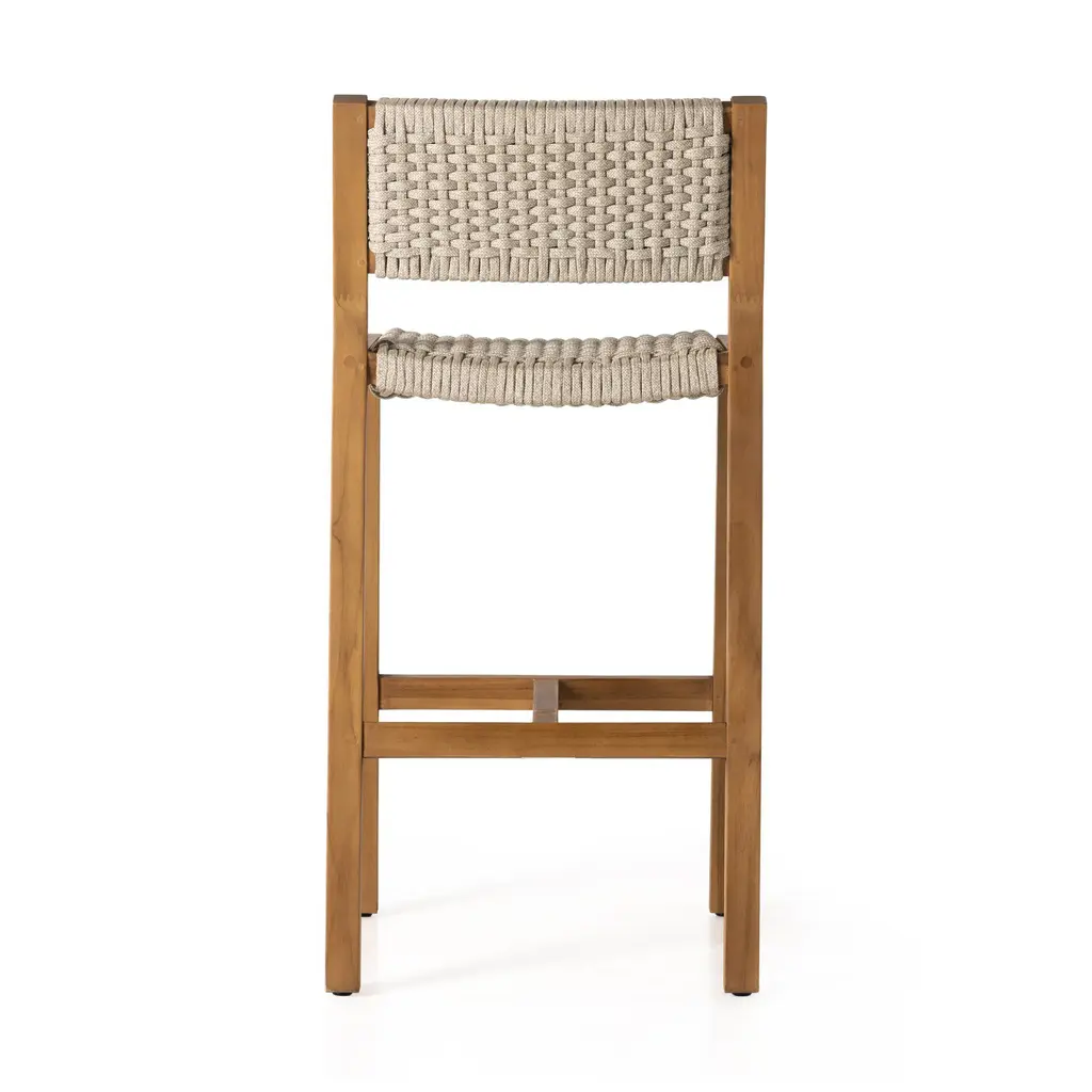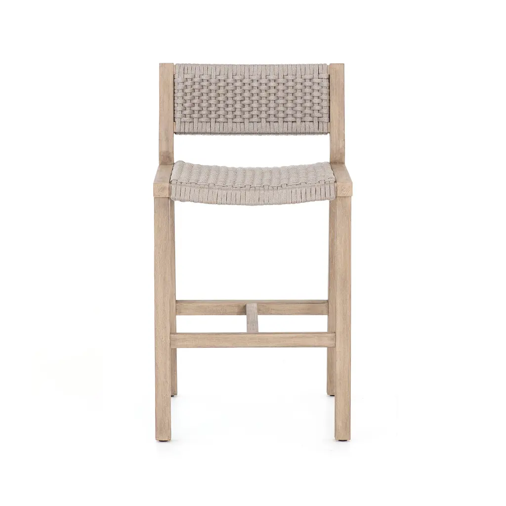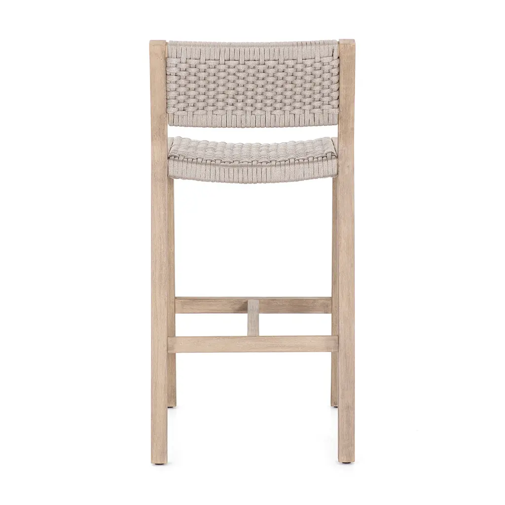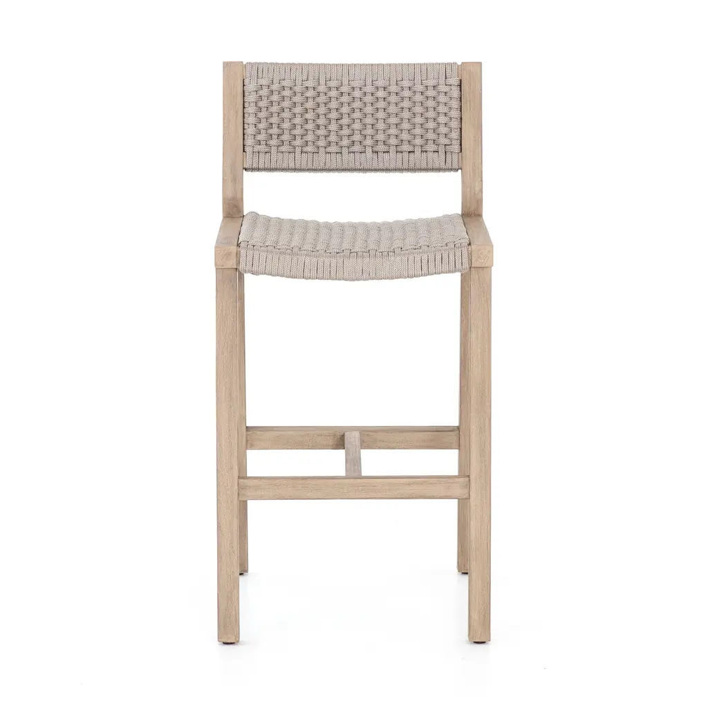 A textural take on outdoor styling, washed brown teak welcomes thick, handwoven rope seating in an inviting light grey. Safe for outdoor spaces. Cover or store indoors during inclement weather and when not in use. Features