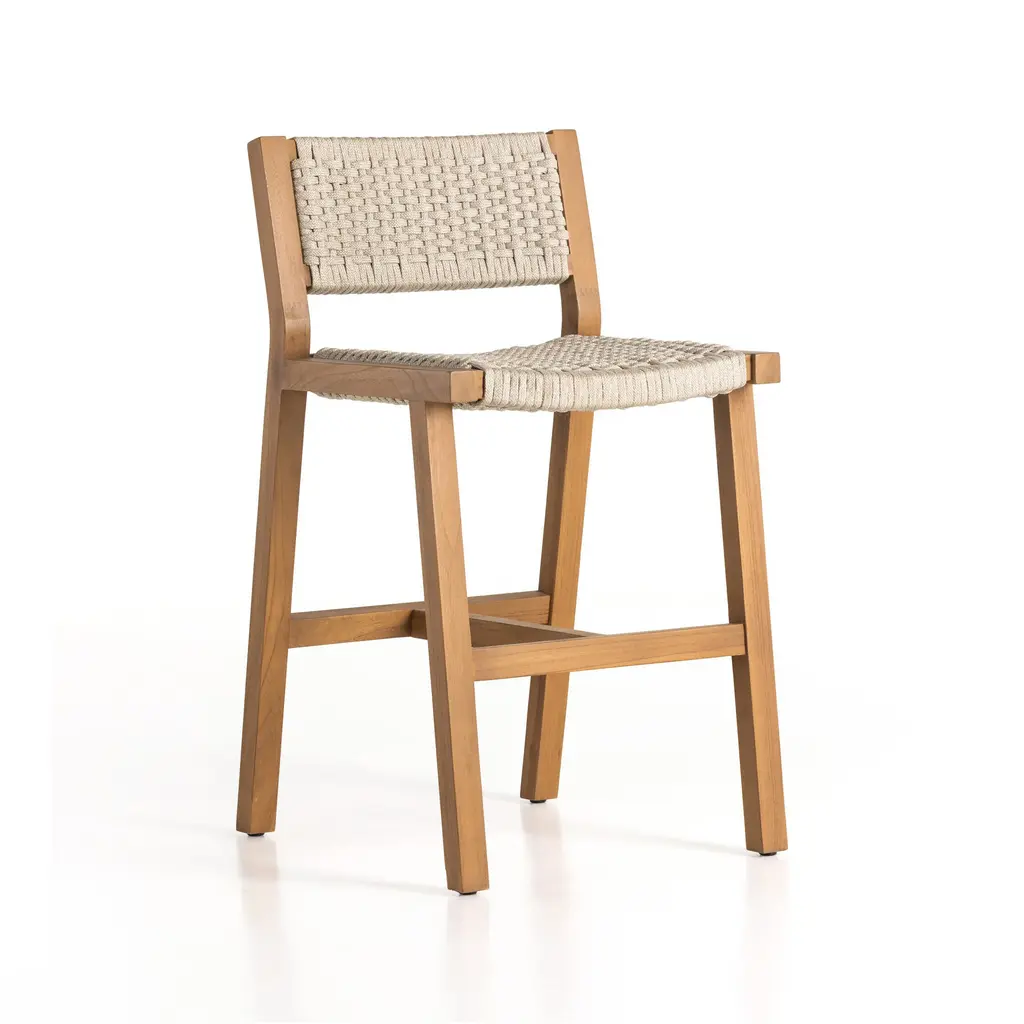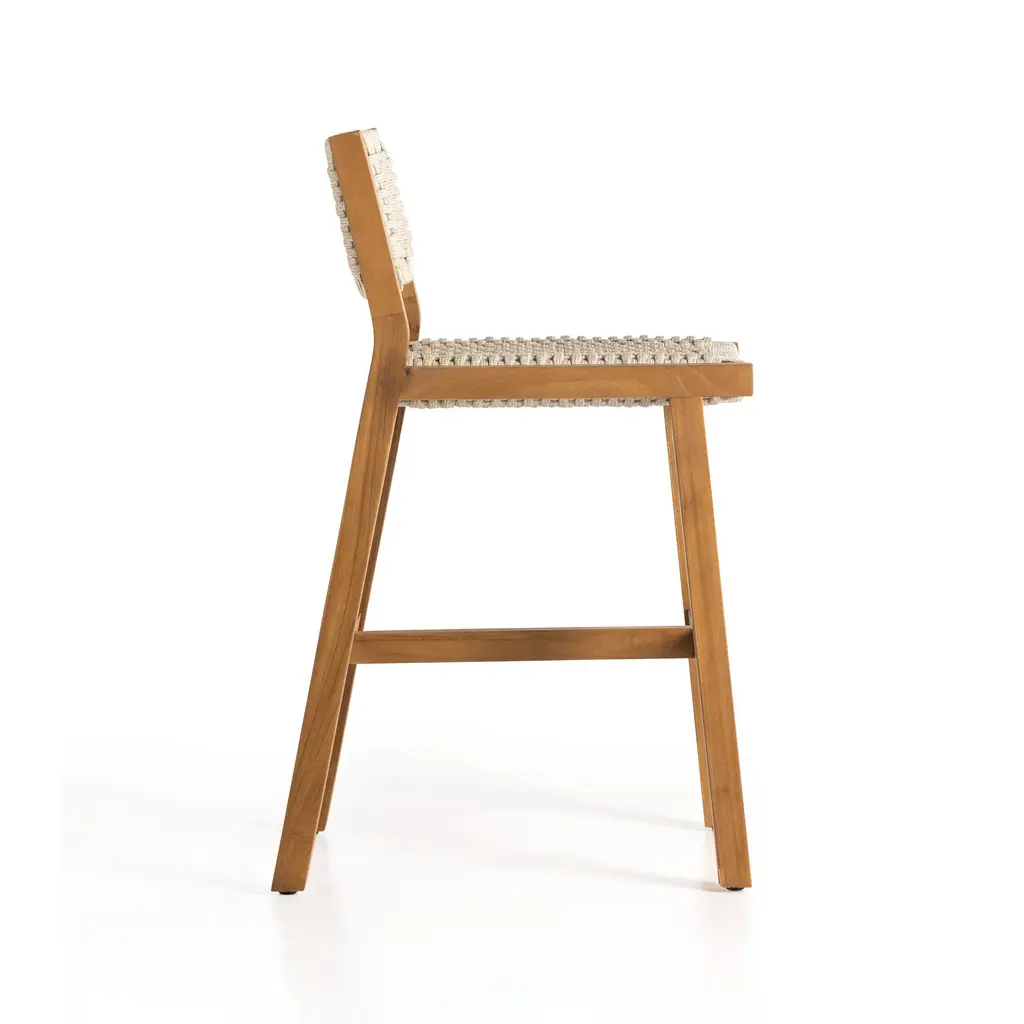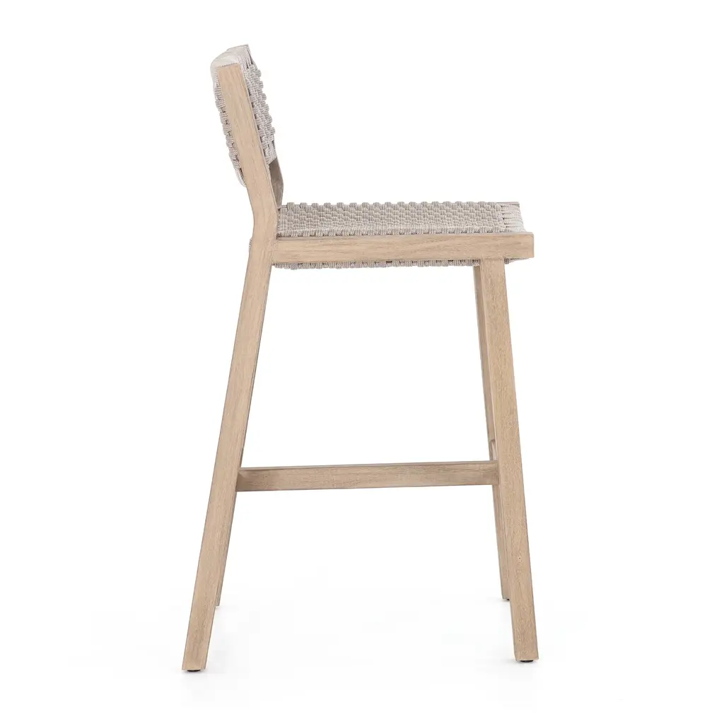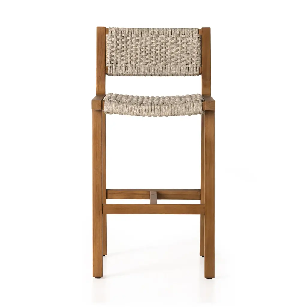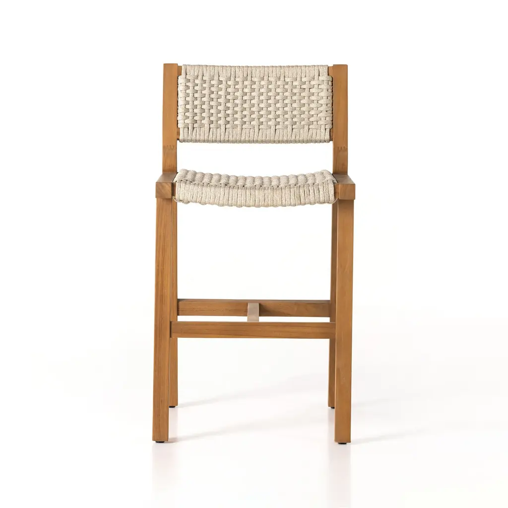 A textural take on outdoor styling, washed brown teak welcomes thick, handwoven rope seating in an inviting light grey. Safe for outdoor spaces. Cover or store indoors during inclement weather and when not in use. Features