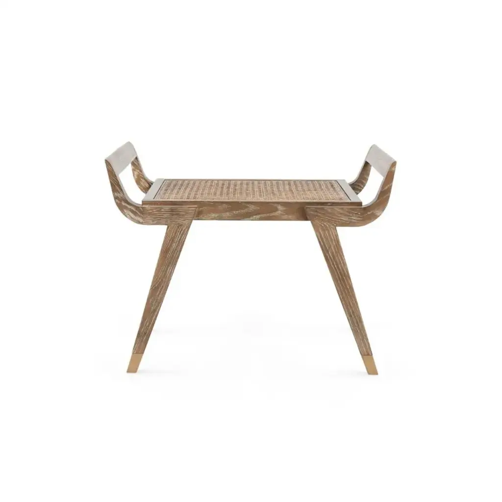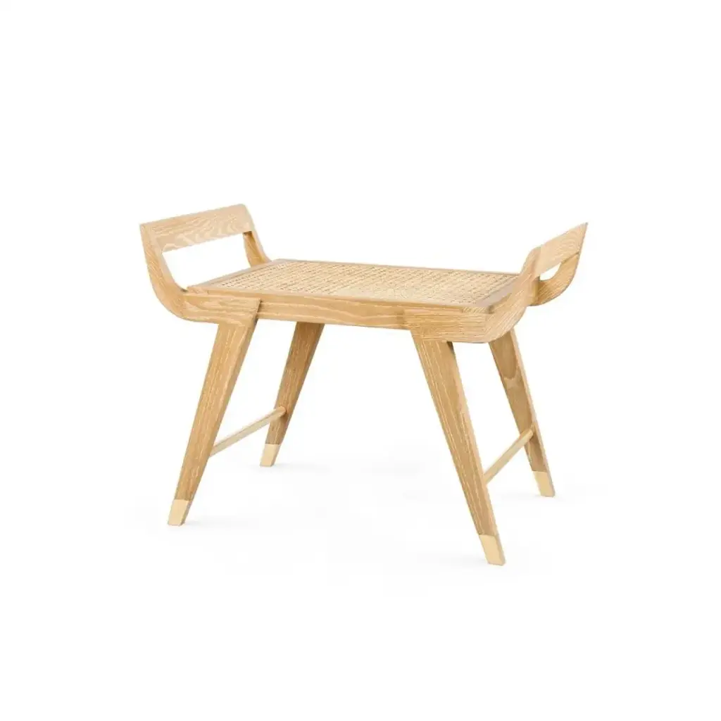 Crafted from oak with a cane seat stained to match the wood finish, the Delon Stool exudes timeless sophistication. Embellished with sabots for refinement and winged arms which make it easy to pick up and move, its design blends vintage charm with modern allure and practicality. Versatile and stylish, the Delon Stool complements entryways, hallways, the foot of a bed, or serves as seating at a casual dining table.
