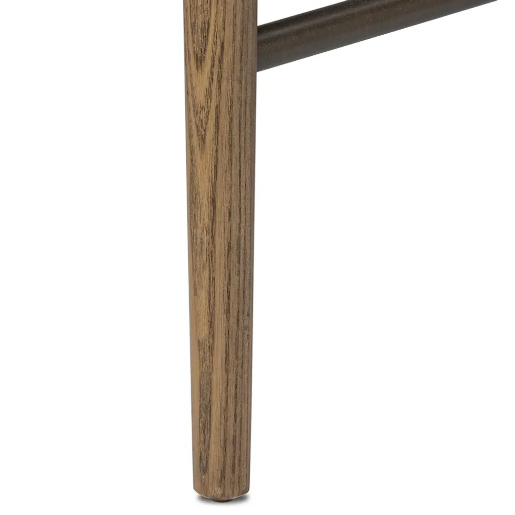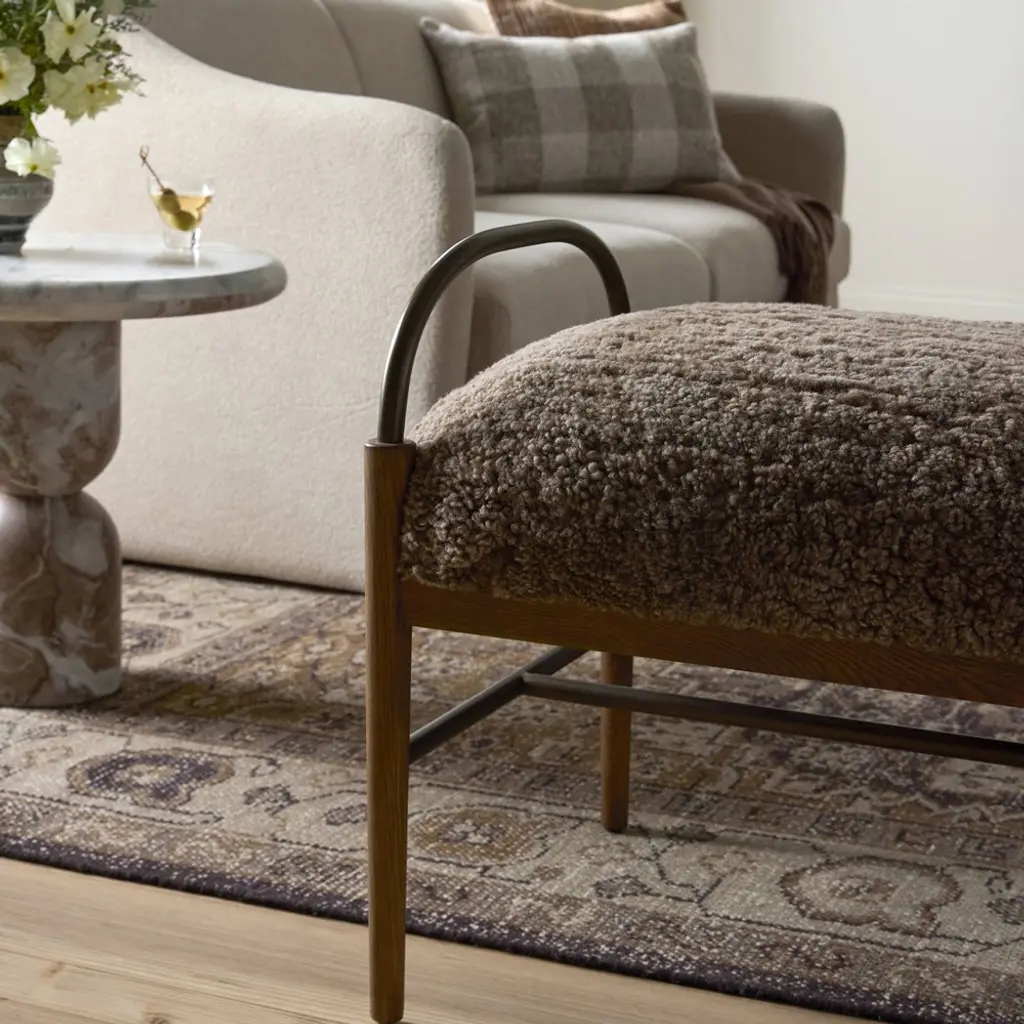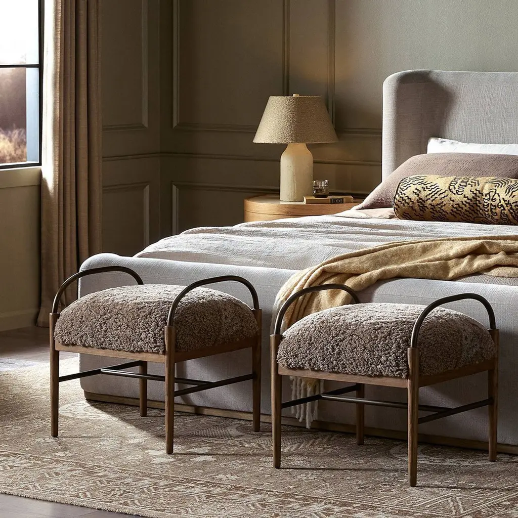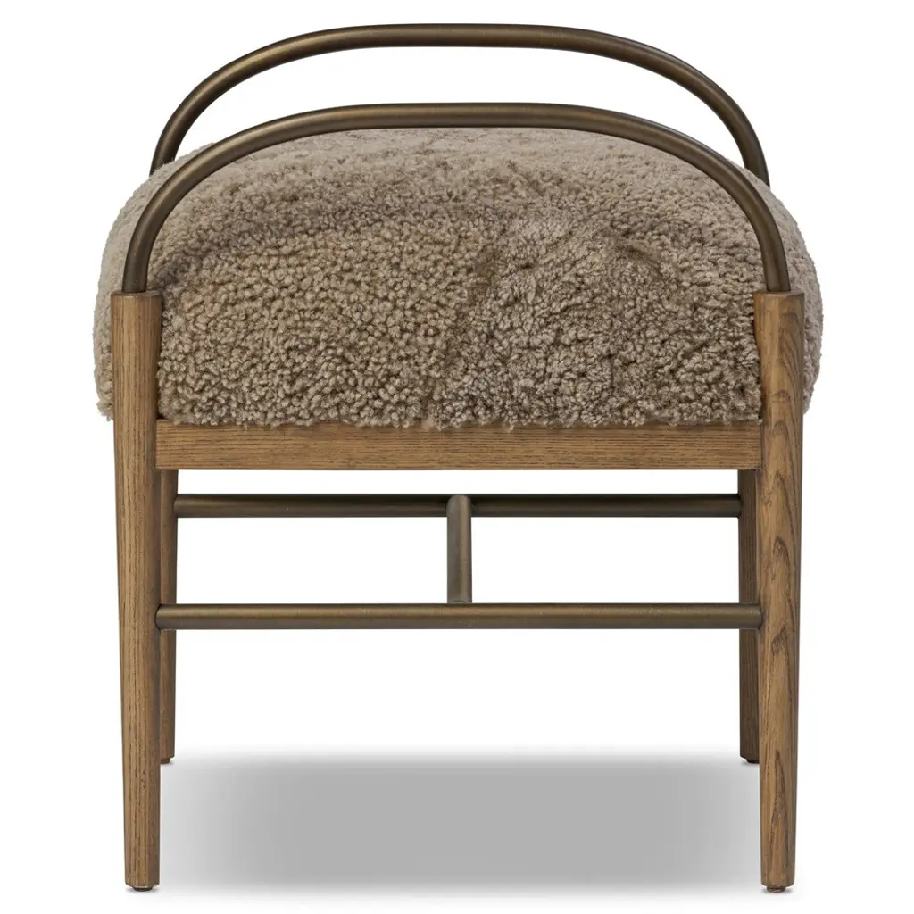 A design collaboration by Amber Lewis and Four Hands. Style this accent stool just about anywhere to create an extra surface or seat. Curved brushed iron arms and an H-shaped stretcher pair with amber ash legs for a distinct material blend. Soft shearling provides a tactile contrast and warm, inviting feel.