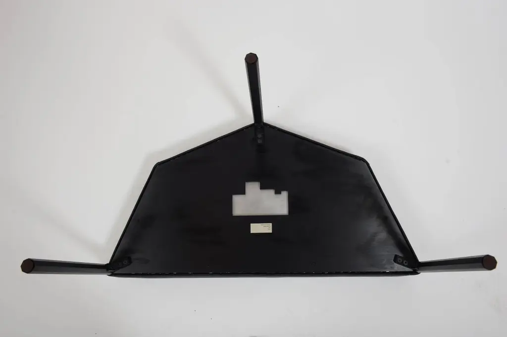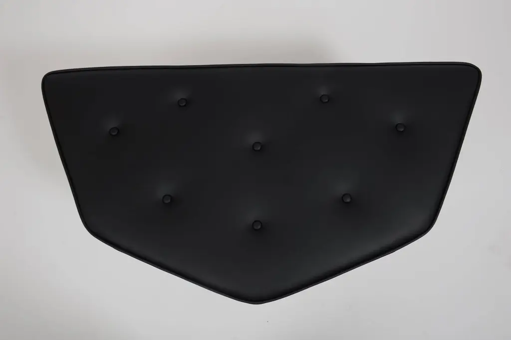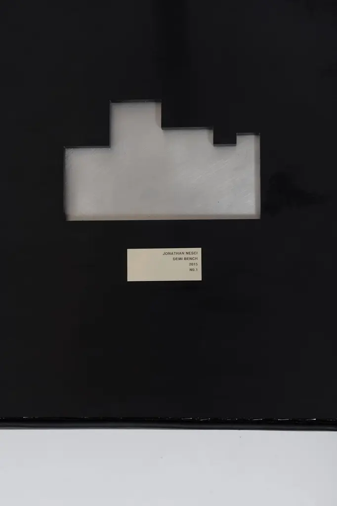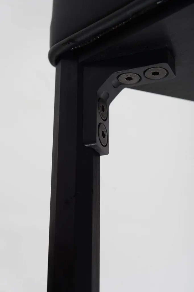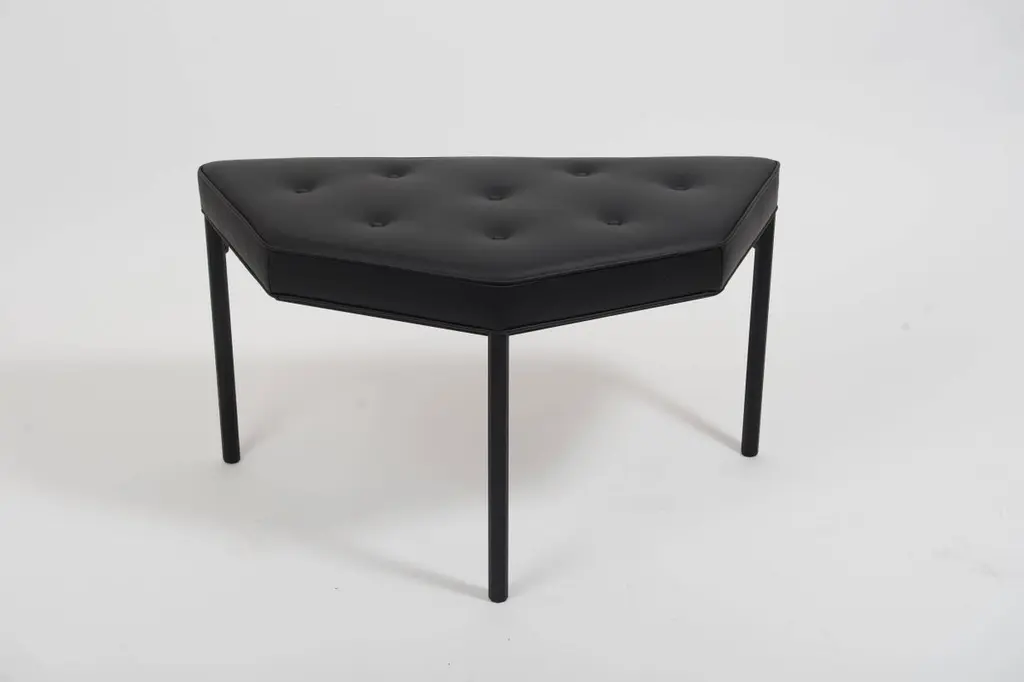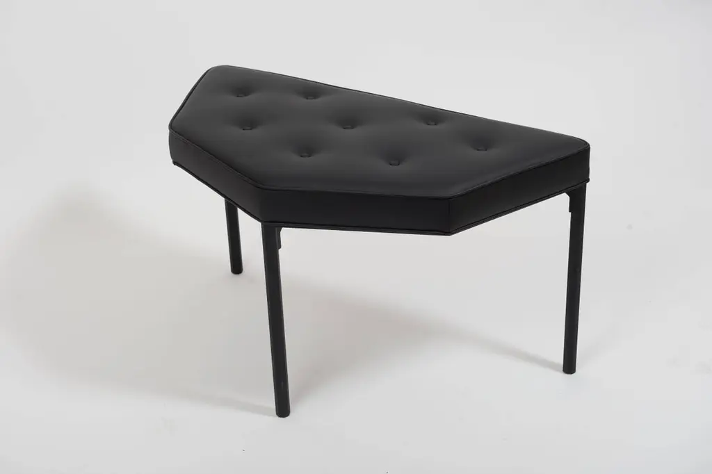 This half-octagon shaped stool is a modern take on the demilune vanity stool. Octagon-shaped legs are cnc-milled out of square aluminum solid bar, and hand brushed and anodized in satin black. Legs are connected via custom milled aluminum braces and leather wrapped wood top is connected to the aluminum base at the underside. Made originally for executive restroom of Cummins Engine Company in Columbus, Indiana with inspiration coming from octagon-shaped pillars found throughout Kevin Roche designed corporate headquarters.