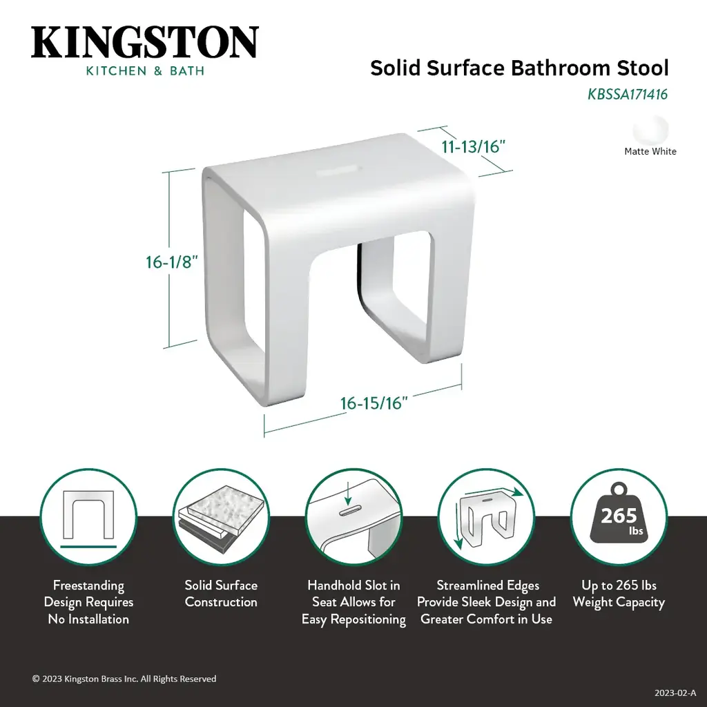 This Kingston Brass multi-purpose shower seat from the Descanso collection is crafted using White Stone, a mixture of granite, resin, and aluminum, making this piece non-porous and 100% water-resistant. Measuring at 16 inches, it offers the perfect height for bathers of all ages and can be used in and out of the shower. Because of its smooth curved profile it fits in just about any modern decor scheme. It features a rectangular cut-out on the seat making it convenient to move as needed. It also allows for water to drain, keeping the seat free of any water pooling in its surface.FeaturesFabricated from solid surface white stoneCorner cube seatFreestanding installationOverall dimensions: (L)16-5/16" x (W)11-13/16" x (H)16-1/8"Corrosion-resistantDesigned for long-lasting durability