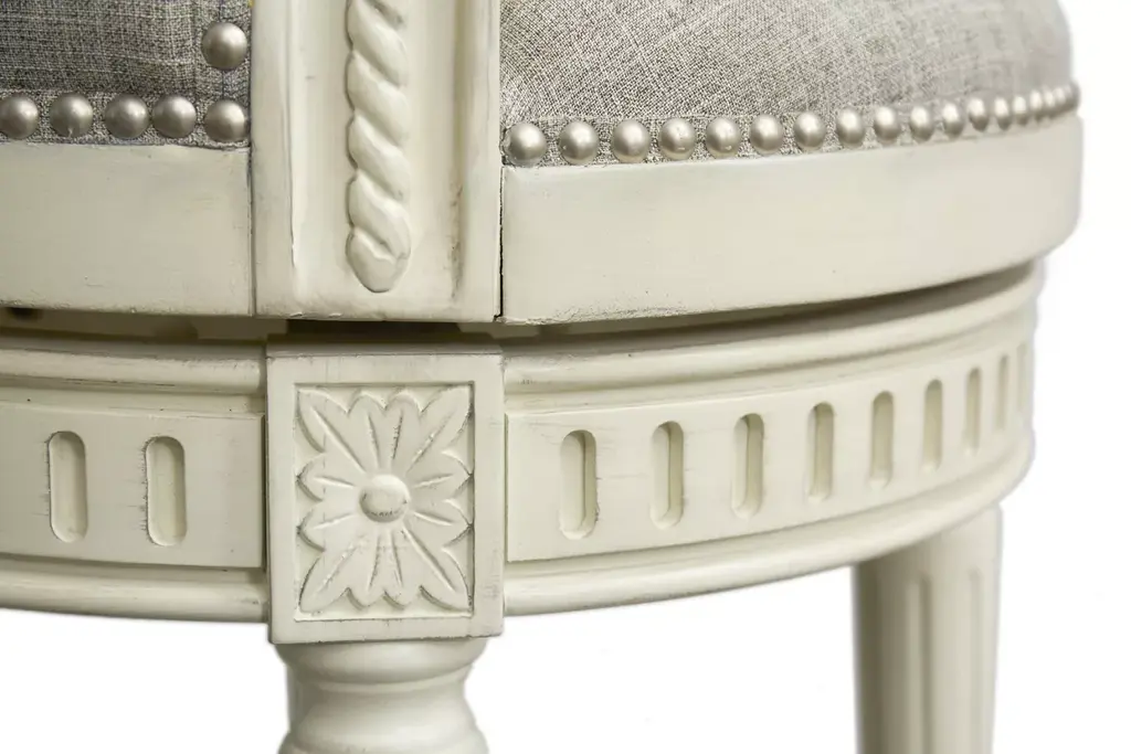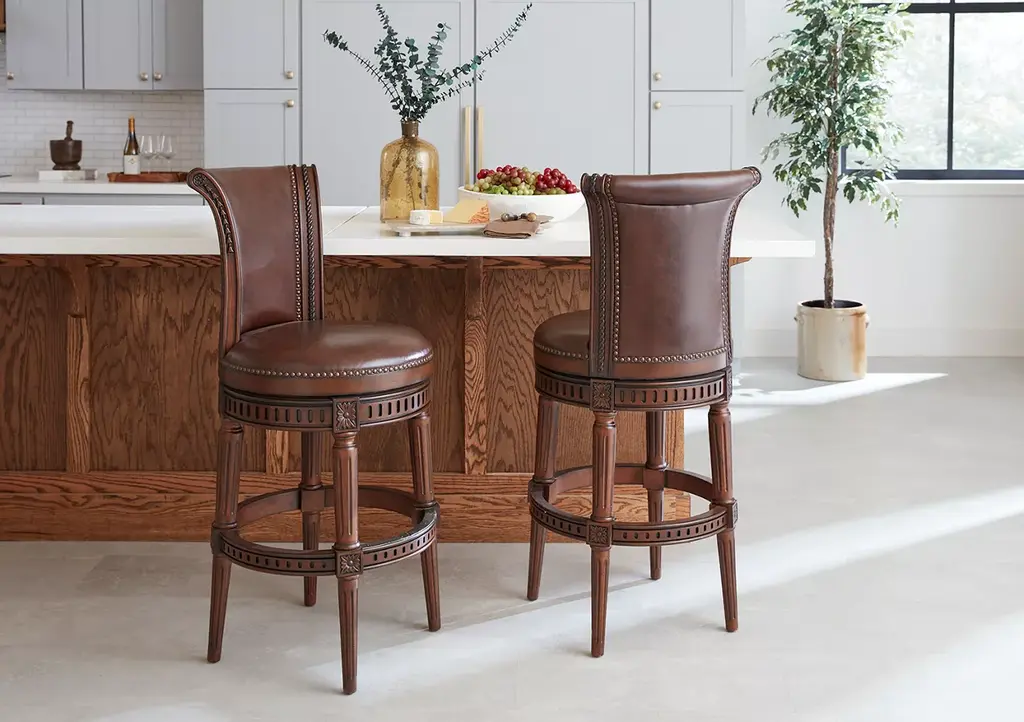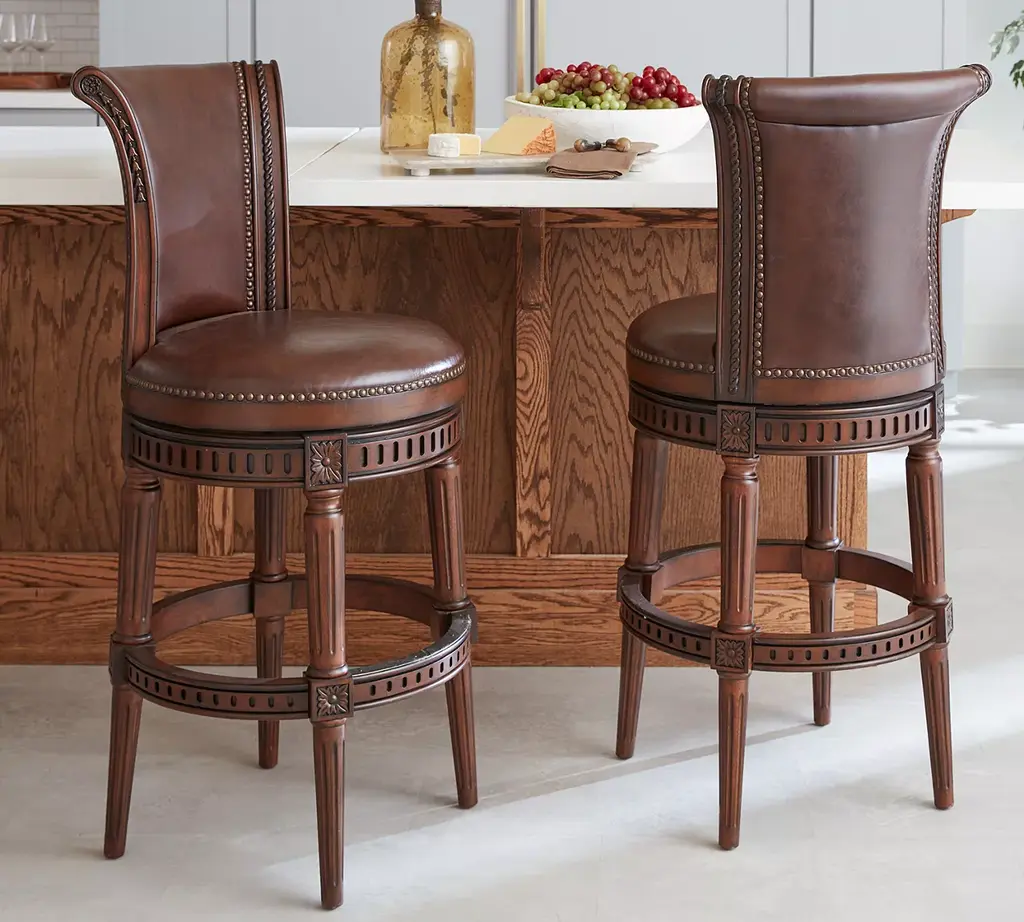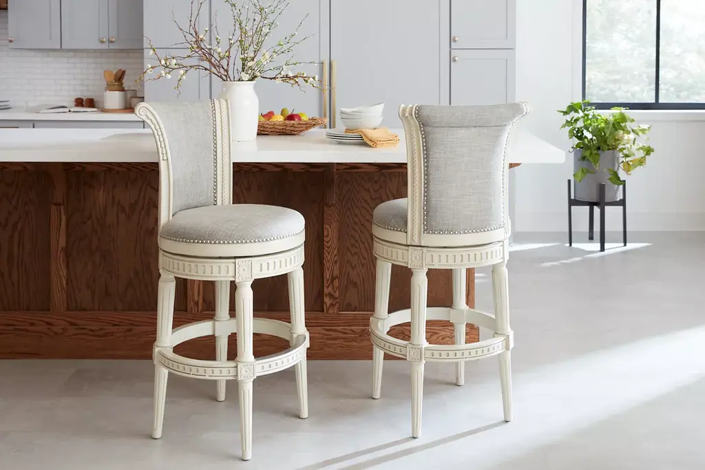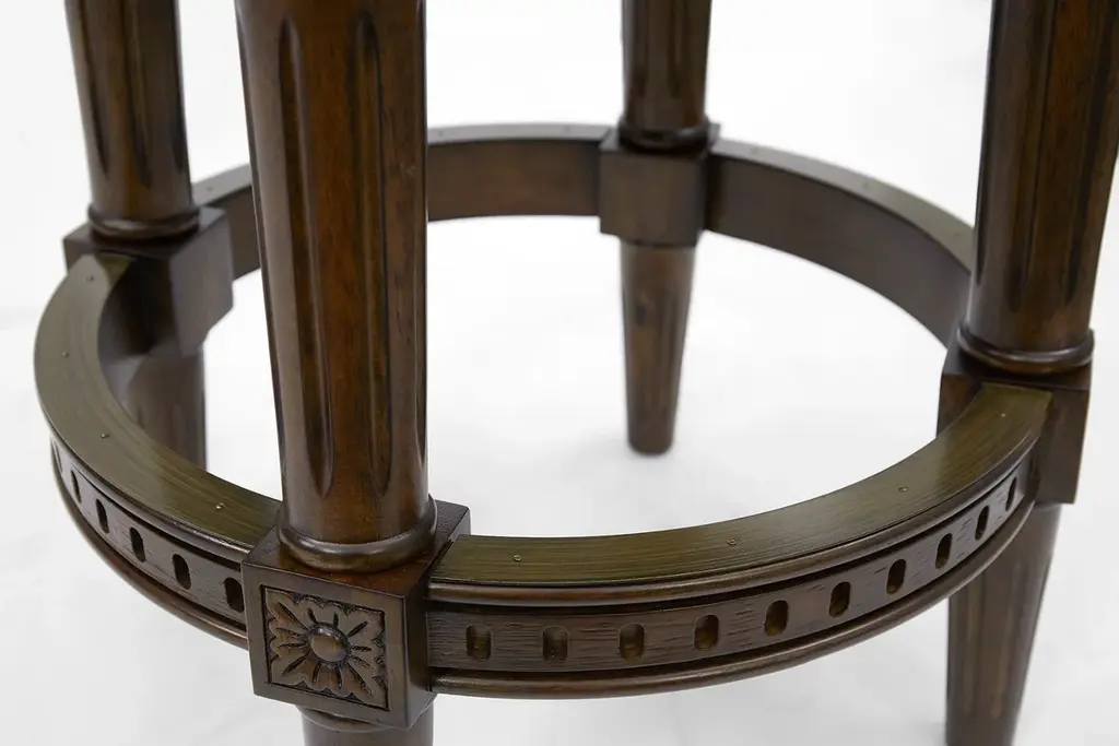 Recreate the experience of a lavish evening out with our Draper counter-height stool. Your choice of a distressed walnut or allegro grey finish will complement plush upholstery, luxurious nailhead trim and medallion inlays for elegance paired with casual comfort.