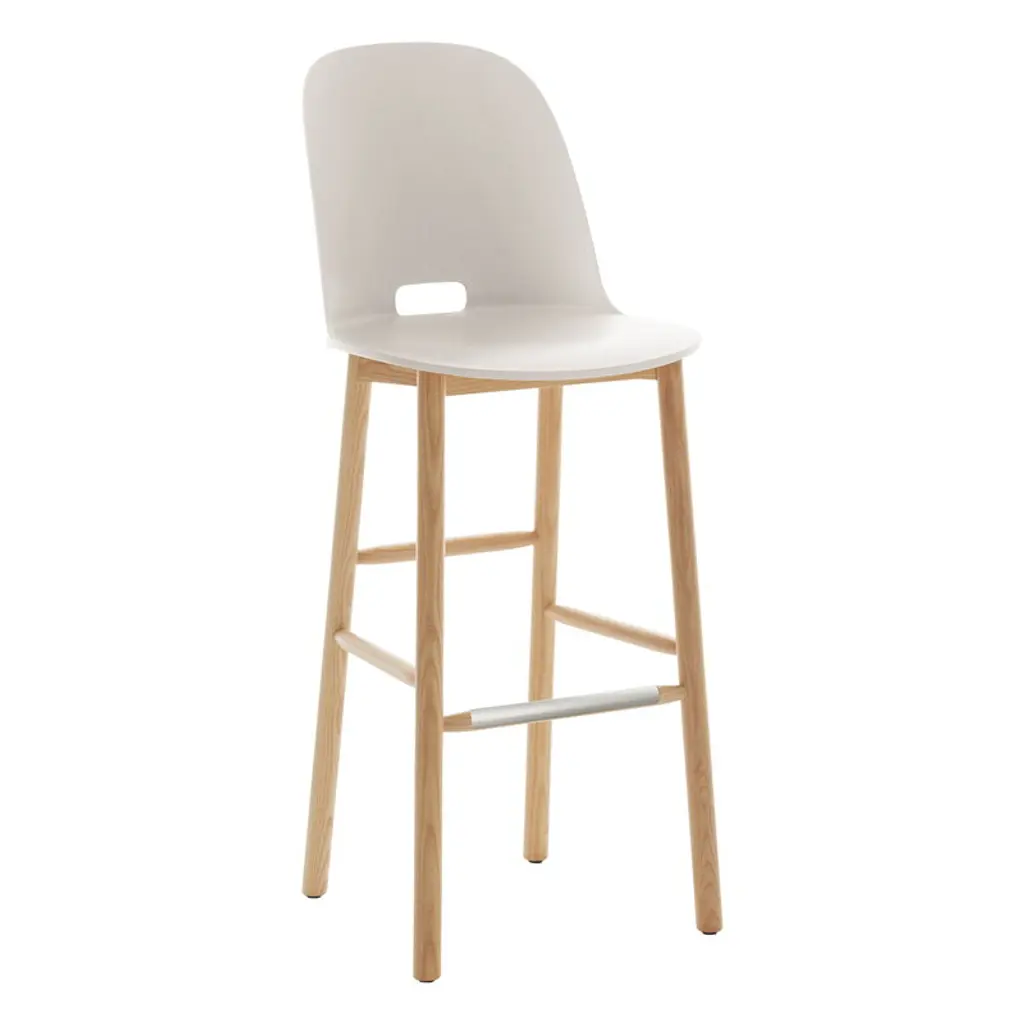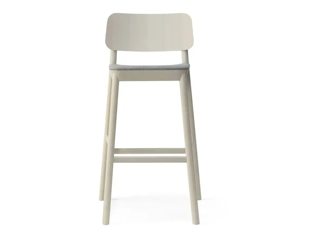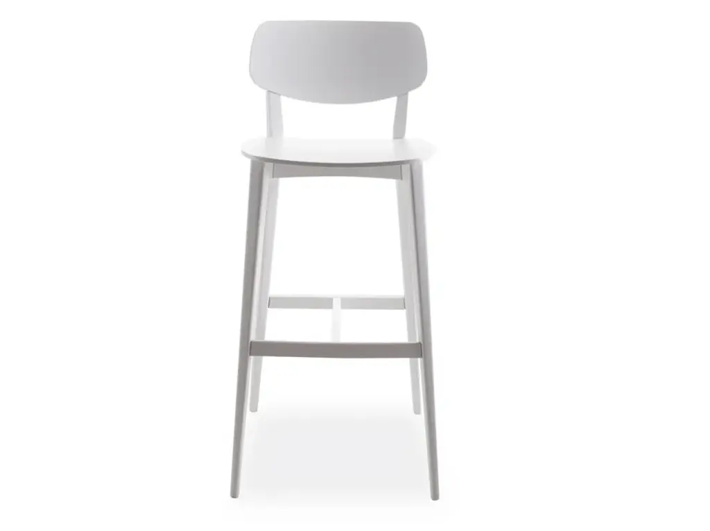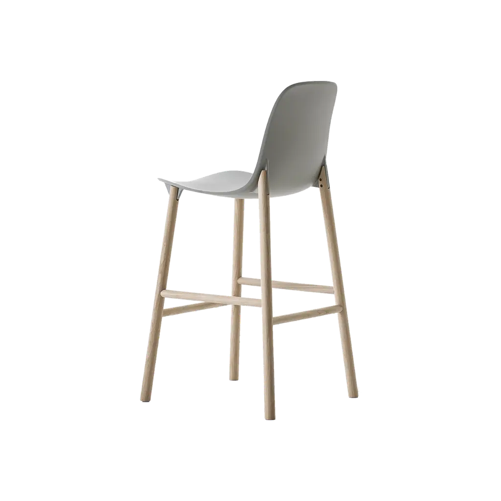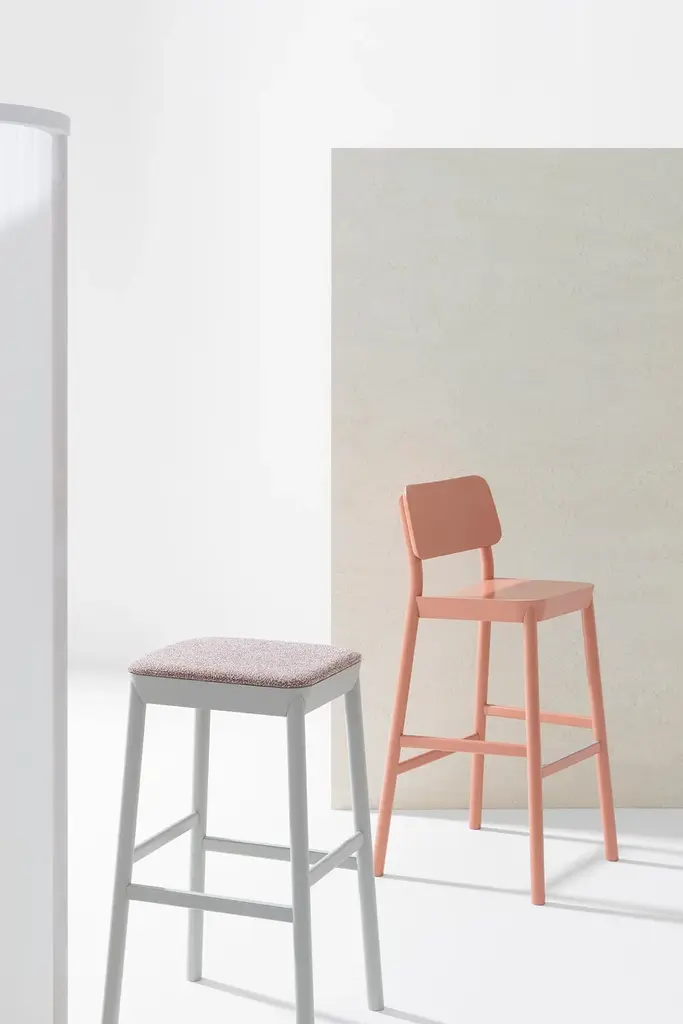 Drum 076 is a high stool with a backrest, featuring a beech wood frame.Drum is a collection faithful to the material wood and is distinguished by the quality craftsmanship that defines the chair, lounge chair, stools in three heights, and tables in various sizes.A distinctive feature is the flared seat—thick yet tapered, like the tabletop.In both the chairs and the stool with a backrest, the rear legs extend to support the curved plywood backrest, tapering and inclining slightly.