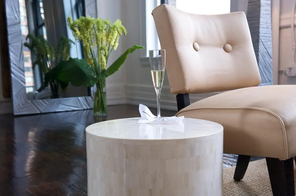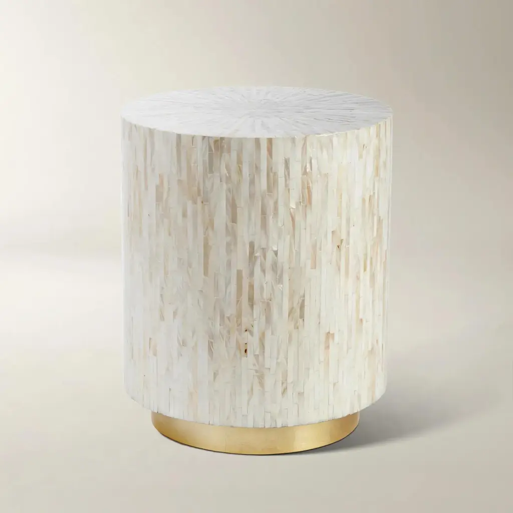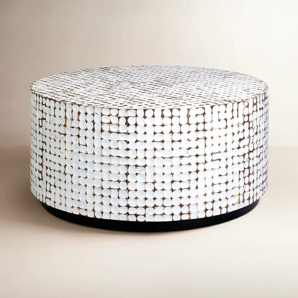 The Serenity Drum End Table/Stool stands as a tangible testament to life's finer pursuits. It isn’t just a piece of furniture; it's a narrative meticulously carved in wood and narrated in bone.From its inception to its final manifestation, every detail of this marvel whispers sophistication. At its core lies wood, shaped and transformed with precison. But what crowns this foundation is nothing short of mesmerizing: hundreds of hexagonal bone chips, each curated and placed with precision. These bone chips, with their natural hues and luster, converge to weave a tapestry—a visual symphony, The Drum's versatile nature allows it to grace your space either as a repository for your cherished books and trinkets or as a stool where you might perch, lost in thought. And its presence? It doesn't scream; it soothes, emanating an aura of tranquility that beckons you to pause and appreciate.Seeking a more personalized touch? Tailor its size to fit snugly in your chosen nook or opt for a drawer that replicates your unique sense of style.Drum End Table/Stool isn’t just a functional object—it conveys a message That true beauty lies in details, in stories handcrafted and told through time.Size: 16" diameter x 16" heightSize: 41.12 cm diameter x 41.12 cm height.