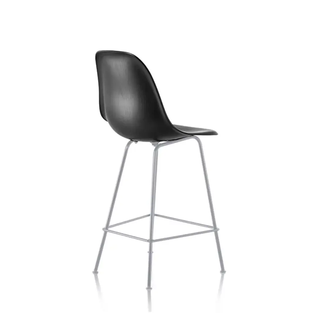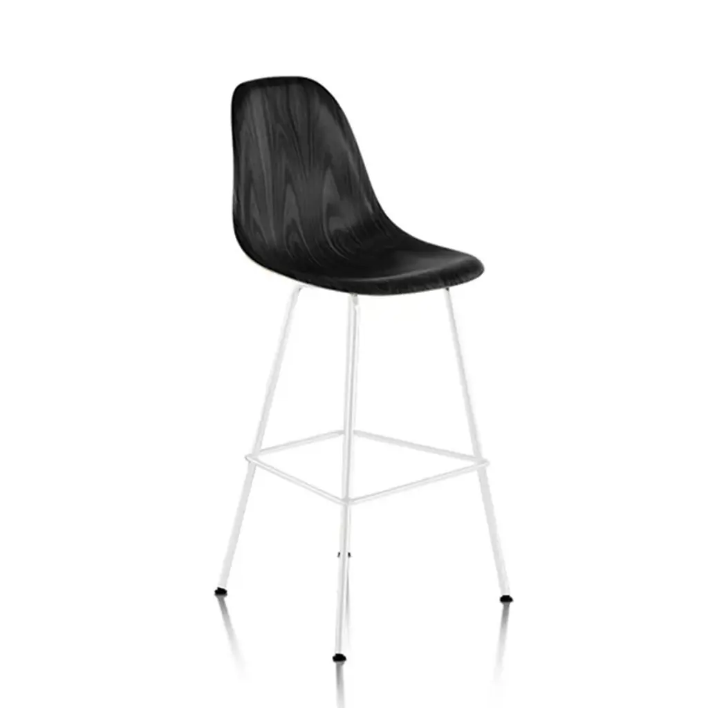 Belly up to the bar with the sleek modern form of the Eames Molded Wood Stool by Herman Miller. Based on the timeless design created by famous married design team Ray and Charles Eames, it uses a tall metal tube base with a footrest brace partway up its length to securely hold the sleek seating upright. Using a 3-D Veneer molding process to create a one-piece wood shell as the Eamses intended, the seat’s slim surface is curved into a robust design offering steady rest amid casual surroundings.