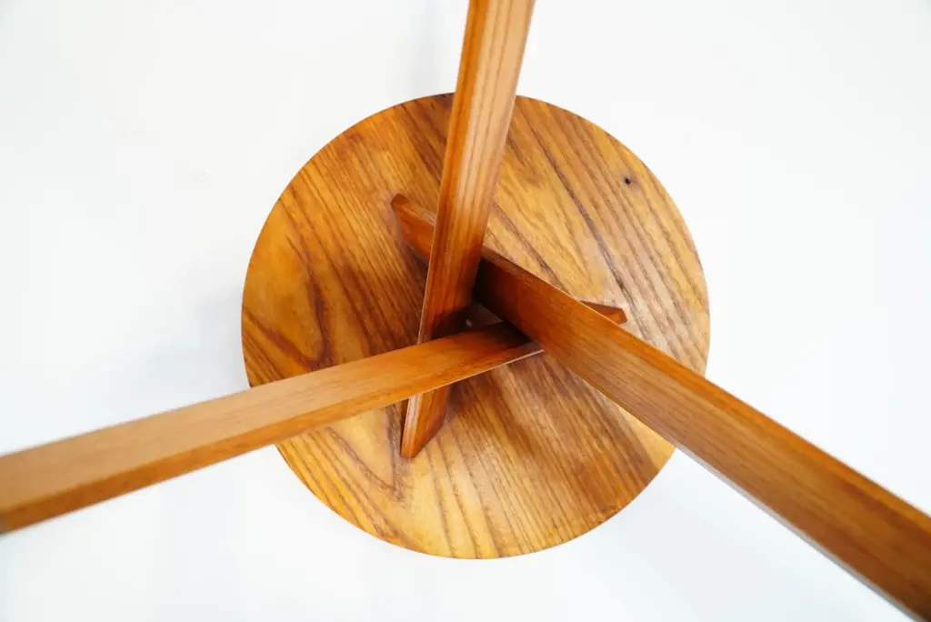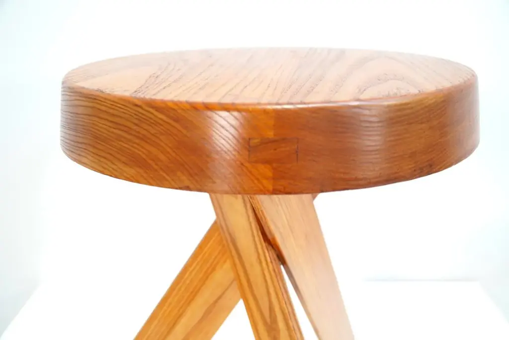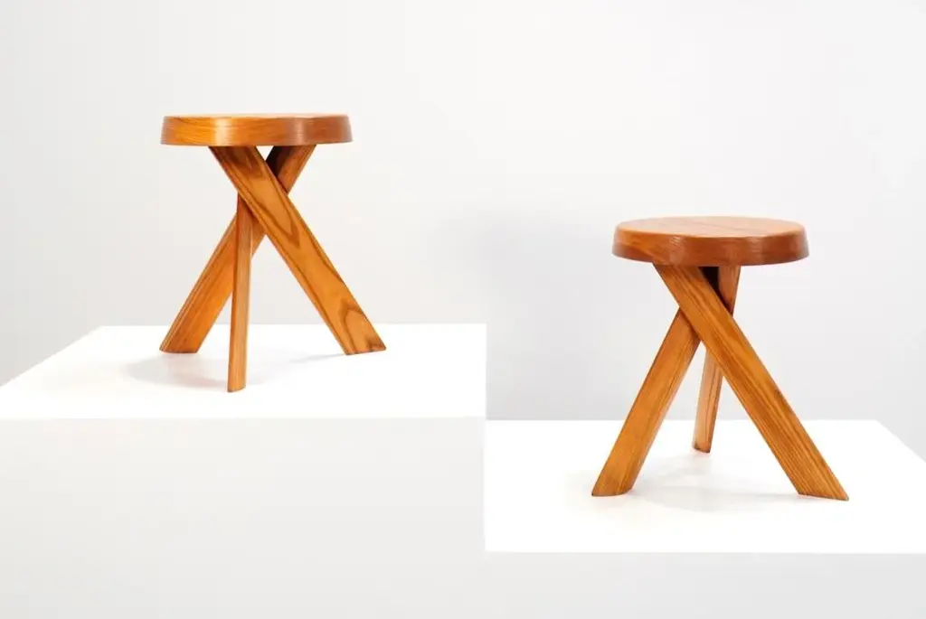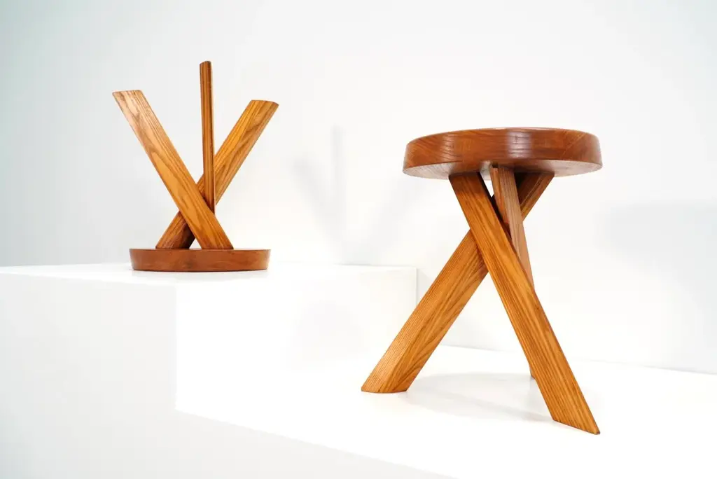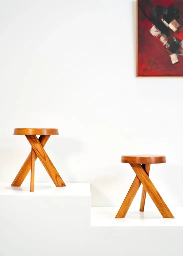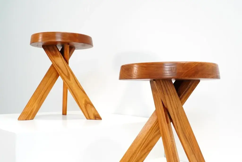 These early edition stools by pierre chapo, crafted from solid elm wood in 1970s france, feature robust seats with a nice natural veining and three interlocking legs. The joints along the seat's edge are signature elements of chapo's style. Its base, composed of three angled legs, provides both stability and a dynamic aesthetic. Their beautiful form show chapo's delicate taste and the architectural power present in his work. both stools are in excellent condition and have acquired a nice patina over the years, making them among the most sought-after pieces today. pierre chapo (1927-1987) was a french designer born into a family of artisans in paris. Initially aspiring to be a painter, he shifted to architecture after an apprenticeship with a ship's carpenter. He graduated from the école nationale supérieure des beaux-arts in paris in 1958. Chapo traveled extensively in europe and the u.s., visiting frank lloyd wright's studio, which greatly influenced him. Upon returning to france, he established his studio in clamart and opened la galerie chapo in paris, featuring his work and that of other renowned artists, including isamu noguchi. Chapo received a gold medal from the city of paris in 1960 for his craftsmanship. influenced by le corbusier, charlotte perriand and the bauhaus, chapo's modernist designs emphasized wood craftsmanship, evident in pieces like the s11 chair and the godot bed, commissioned by playwright samuel beckett. In 1967, he won the bronze medal at the salon des artistes décorateurs and moved to gordes, where he continued his work and his teaching. Diagnosed with als in 1983, chapo passed away in 1987. Today, he is remembered for his exceptional pieces, renowned for their incredible attention to detail. I have official proof of authenticity such as vintage catalogs, designer records, or other literature sources and take full responsibility for any authenticity issues arising from misattribution