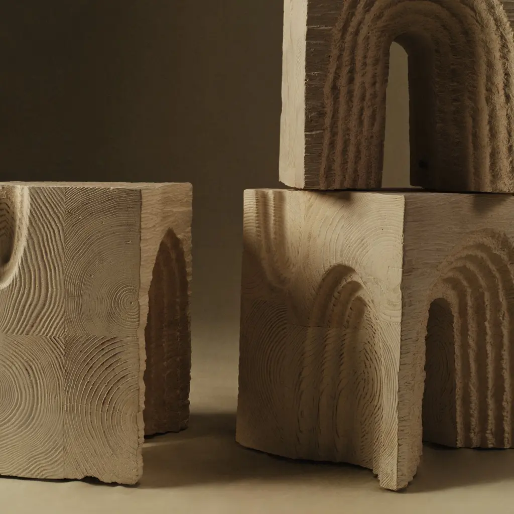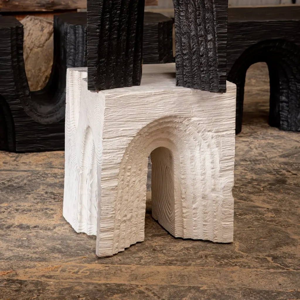 Featuring arched forms carved from a single monolithic mass of wood, the Echo Stool blurs the lines between modern art and functional décor. This sculptural stool or table is created by a local LA artisan from solid Douglas Fir and features a heavily hand-sculpted texture. Celebrating the unique qualities of wood, the Natural Finish accentuates its rich grain texture and warm tones while an Ivory Gesso finish exudes an air of timeless elegance, with its pristine white surface adding a touch of sophistication to any interior. An Ebonized Douglas Fir finish brings a sense of drama and depth into any interior with its deep, dark hue. This piece is available in either a Ivory Gesso, Natural or Ebonized Douglas Fir finish. Hand crafted in our Los Angeles workshop.