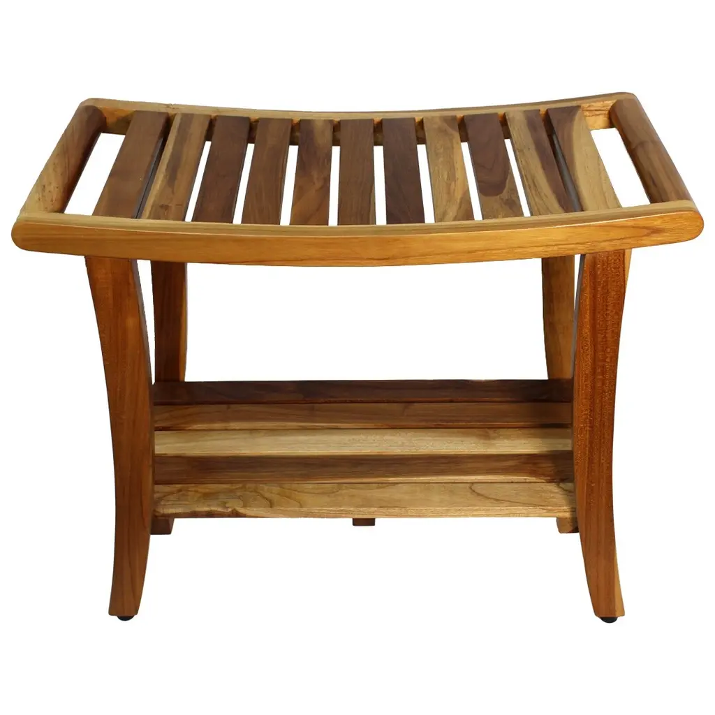 EcoDecors brings the natural elegance of sustainably sourced teak wood into your home, perfect for creating an inviting and functional space. Our proprietary finishing techniques enhance the natural color variations and beautiful grain patterns of certified plantation-grown teak, resulting in a piece that's not just furniture but a statement of style. Handcrafted in small rural workshops in Indonesia, the EcoDecors Harmony teak wood shower stool effortlessly blends into any interior setting, providing versatile uses for sitting, storage, and display. Measuring 30 inches in length and 24 inches in height, this bench features a spacious storage shelf that seamlessly merges form and function. Thoughtfully designed with foot leveling pads, it adapts to minor slopes in shower floors, ensuring both safety and stability. The two-tier design maximizes storage for toiletries, towels, and other essentials, making your space more organized and functional. Water-resistant and durable, this teak stool is not limited to bathrooms—it enhances any room with its timeless appeal. EcoDecors unites sustainable materials with purposeful design, elevating your home with both beauty and functionality. EcoDecors harmonizes sustainable craftsmanship with refined design, enhancing your interiors with furniture that speaks to both style and practicality. Features: Extended Height Sophisticated Accessibility: The 24-inch height, combined with LiftAid handles, offers easy transitions between sitting and standing. This design prioritizes comfort and accessibility, making it ideal for bathrooms that cater to users of all ages and needs. Compact Durable Design Ergonomic Elegance: The EcoDecors shower bench features a sloped comfort seat. Its sleek and compact design fits beautifully into tight spaces, making it a versatile addition that enhances the aesthetic and utility of your bathroom or any other room. Adjustable Height Foot Stability and Versatility: Designed with adjustable height foot pads, this teak bench provides stability on uneven surfaces, such as sloped shower floors. Non-skid rubber pads protect your floors from scratches. Superior Solid Teak Premium Material Selection: Crafted from certified, plantation-grown teak, this bench offers superior durability in moisture-rich environments. Teak's inherent resistance to water and wear makes it an exceptional choice for bathrooms, surpassing the longevity and appeal of other natural woods like bamboo. Women-Owned Design with Purpose: Proudly provided by a certified woman-owned company, this teak shower bench reflects a dedication to quality, craftsmanship, and community support. Our mission is to enhance your living spaces with designs that are as thoughtful as they are beautiful, promoting both functionality and aesthetic appeal. Safety Reliable Support: The LiftAide arms offer dependable support, ensuring safe transitions between sitting and standing. The robust under-mount structure adds an extra layer of stability, making this bench a secure choice for any bathroom setup. Maximum Weight Built to Last: Designed to support up to 250 lbs, this teak bench provides reliable durability and strength, making it suitable for various users while maintaining its elegant appearance and functionality. Designed to Fit: With dimensions of 30 inches in length, 14 inches in depth, and a seat height of 24 inches, this bench is perfectly sized to fit comfortably in a variety of spaces, offering both practical support and a touch of sophistication. Effortless Assembly: Setting up your new teak bench is simple and stress-free, with clear instructions and all necessary tools included. This thoughtful design ensures you can quickly enjoy the added beauty and functionality of this elegant piece.