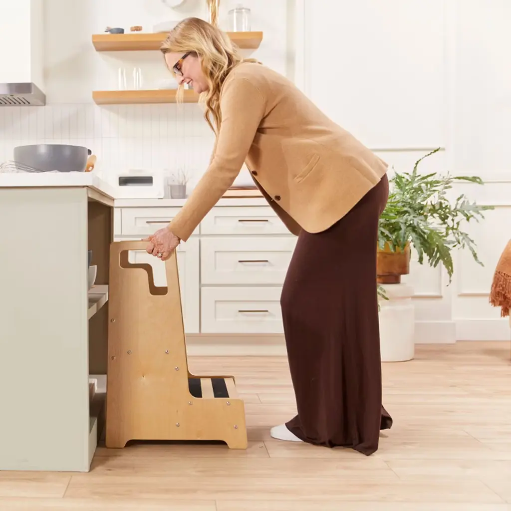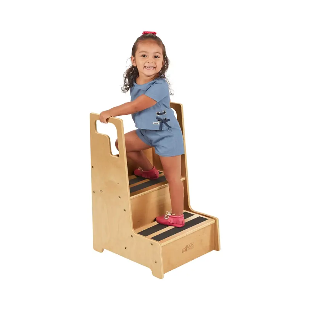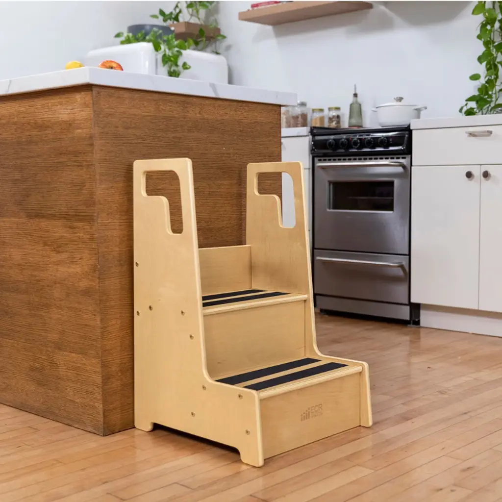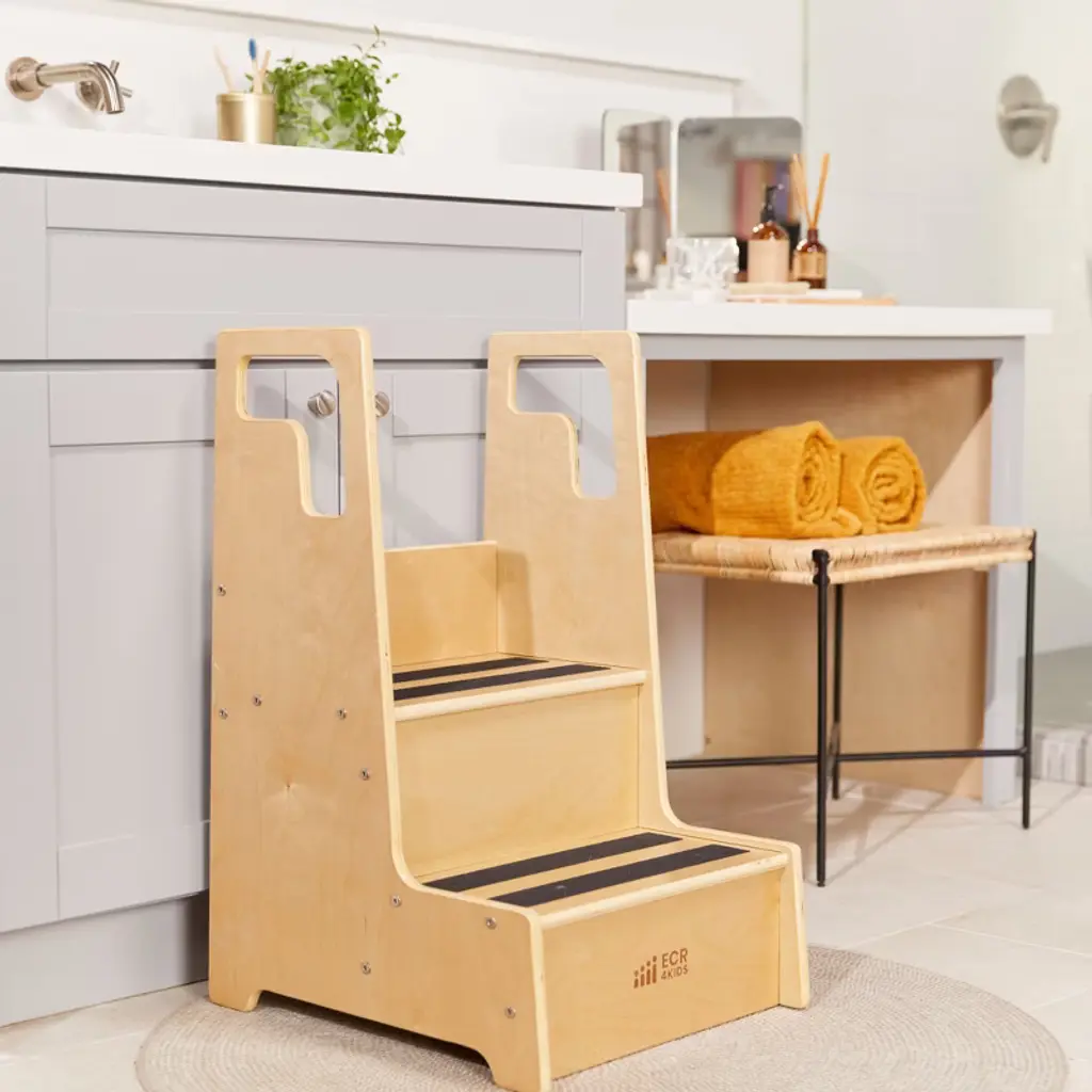 Give little ones a boost with ECR4Kids Reach-Up Step Stool. The wooden stool features a two-step design to help kids reach toys, books, or items on a countertop. Two safety rails keep children secure and stable as they climb up and down the stairs. A non-slip grip helps to prevent little ones from slipping and sliding. Promote independence by allowing kids to enjoy the accomplishment of safely reaching for that faraway item. Creating daily routines for children encourages them to gain confidence with everyday tasks. The children's step stool is ideal for use in the kitchen for reaching the countertop to cook, wash dishes or pretend play. Use in a bathroom to wash hands and brush teeth. The cut-out handles make the lightweight step stool easy to carry from room to room depending on the intended life skill a little one is practicing. Constructed from sustainably harvested birch plywood with a durable finish sealing the wood surface and resisting scratching. A UV inhibitor helps furniture resist ultraviolet light and yellowing. Natural birch plywood is extremely durable and will hold up to everyday use in daycares and preschools, great for the home. The natural grain complements any space.