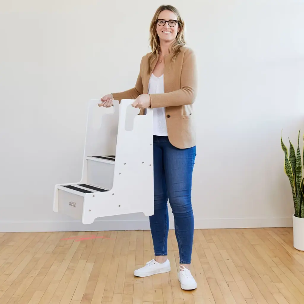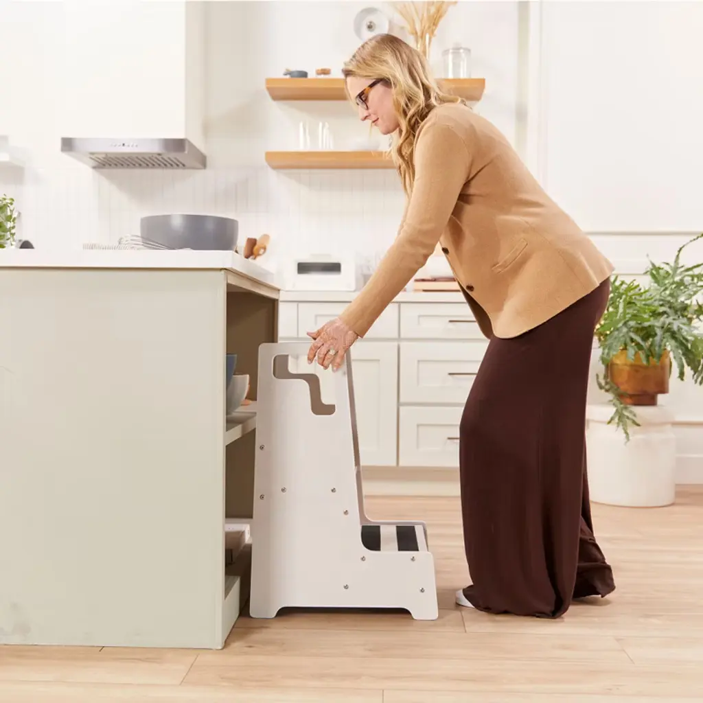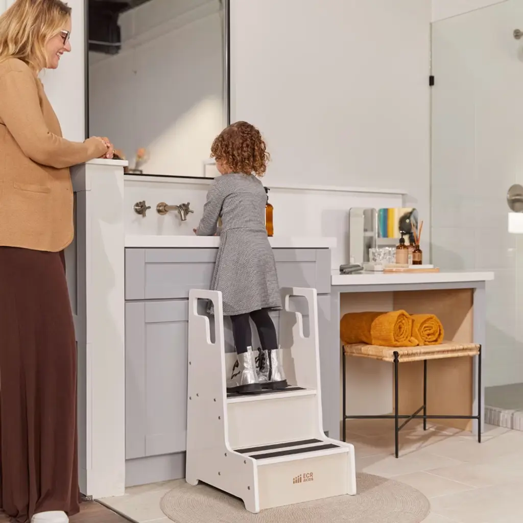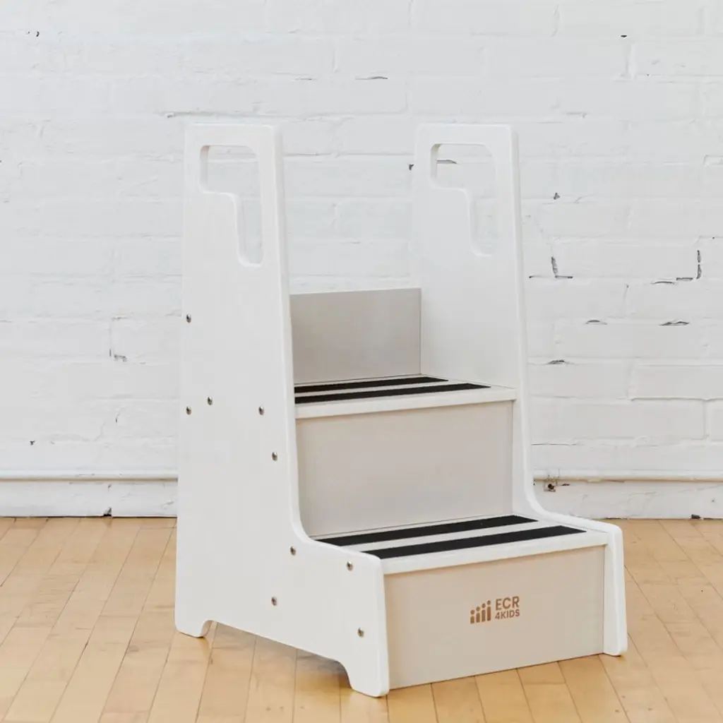 Give little ones a boost with ECR4Kids Reach-Up Step Stool. The wooden stool features a two-step design to help kids reach toys, books, or items on a countertop. Two safety rails keep children secure and stable as they climb up and down the stairs. A non-slip grip helps to prevent little ones from slipping and sliding. Promote independence by allowing kids to enjoy the accomplishment of safely reaching for that faraway item. Creating daily routines for children encourages them to gain confidence with everyday tasks. The children's step stool is ideal for use in the kitchen for reaching the countertop to cook, wash dishes or pretend play. Use in a bathroom to wash hands and brush teeth. The cut-out handles make the lightweight step stool easy to carry from room to room depending on the intended life skill a little one is practicing. Constructed from sustainably harvested birch plywood with a durable finish sealing the wood surface and resisting scratching. A UV inhibitor helps furniture resist ultraviolet light and yellowing. Natural birch plywood is extremely durable and will hold up to everyday use in daycares and preschools, great for the home. The natural grain complements any space.