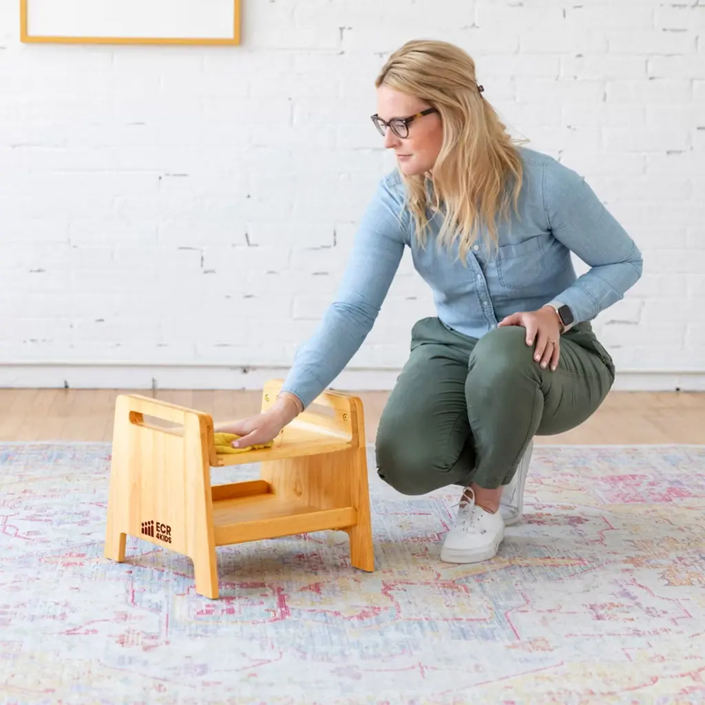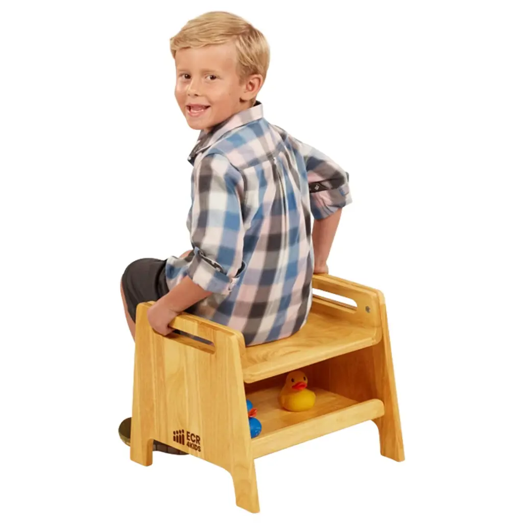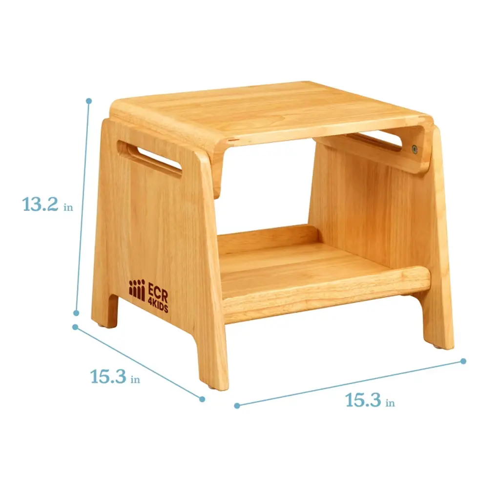 The ECR4Kids Sit or Step Stool is a 2-in-1 seat and step stool with convenient storage underneath. Use the kids’ bathroom stool to reach the sink to brush your teeth and wash your hands. Take it into the kitchen for a boost to help reach the countertop. Use it next to a bookshelf to offer children access and to select their favorites story. Place in a bedroom for little ones to put on socks and shoes. The versatile furniture can be assembled in two height options for different uses. The lightweight design has cut-out handles for easy transportation from room to room, offering a self-help “do it myself” solution. The footprint of this children's step stool is ideal for small spaces including daycares, apartment homes, and smaller playrooms. A shelf underneath offers storage for small items and features raised edges to prevent supplies from rolling out. Constructed from rubberwood with a durable finish sealing the wood surface and resisting scratching. A UV inhibitor helps furniture resist ultraviolet light and yellowing. Pair with ECR4Kids hardwood furniture to complete the set; sold separately.