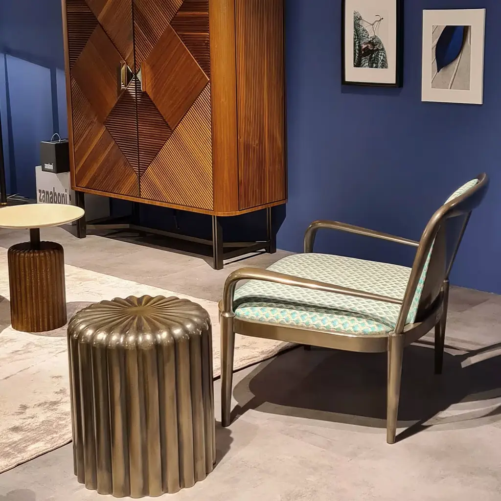 Providing a practical occasional seat without renouncing glamour defines this stunning low stool. Fashioned of wood, it stands out for the dynamism of its fluted texture, which is emphasized by a bronzed-casted metal finish for a plush statement. This precious bronzed version is a limited-edition design also featured in a walnut-stained counterpart.