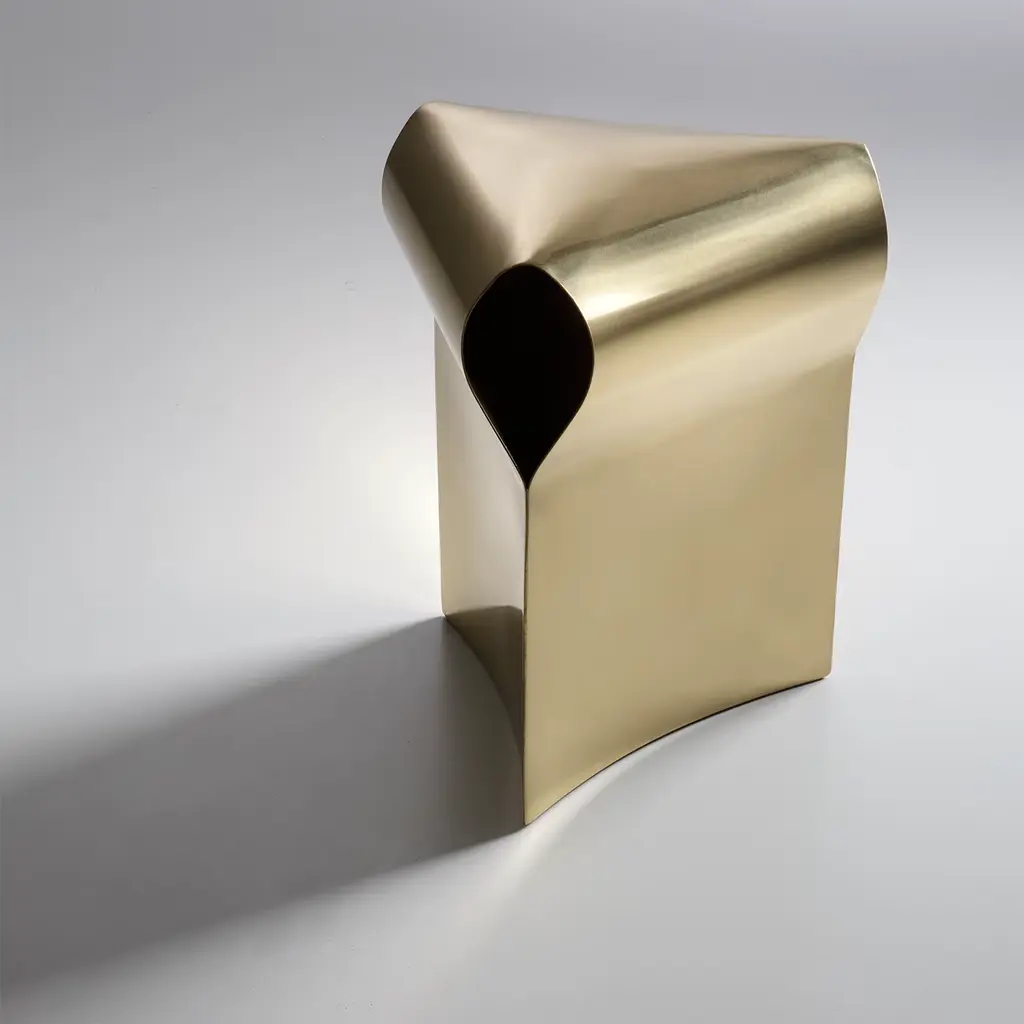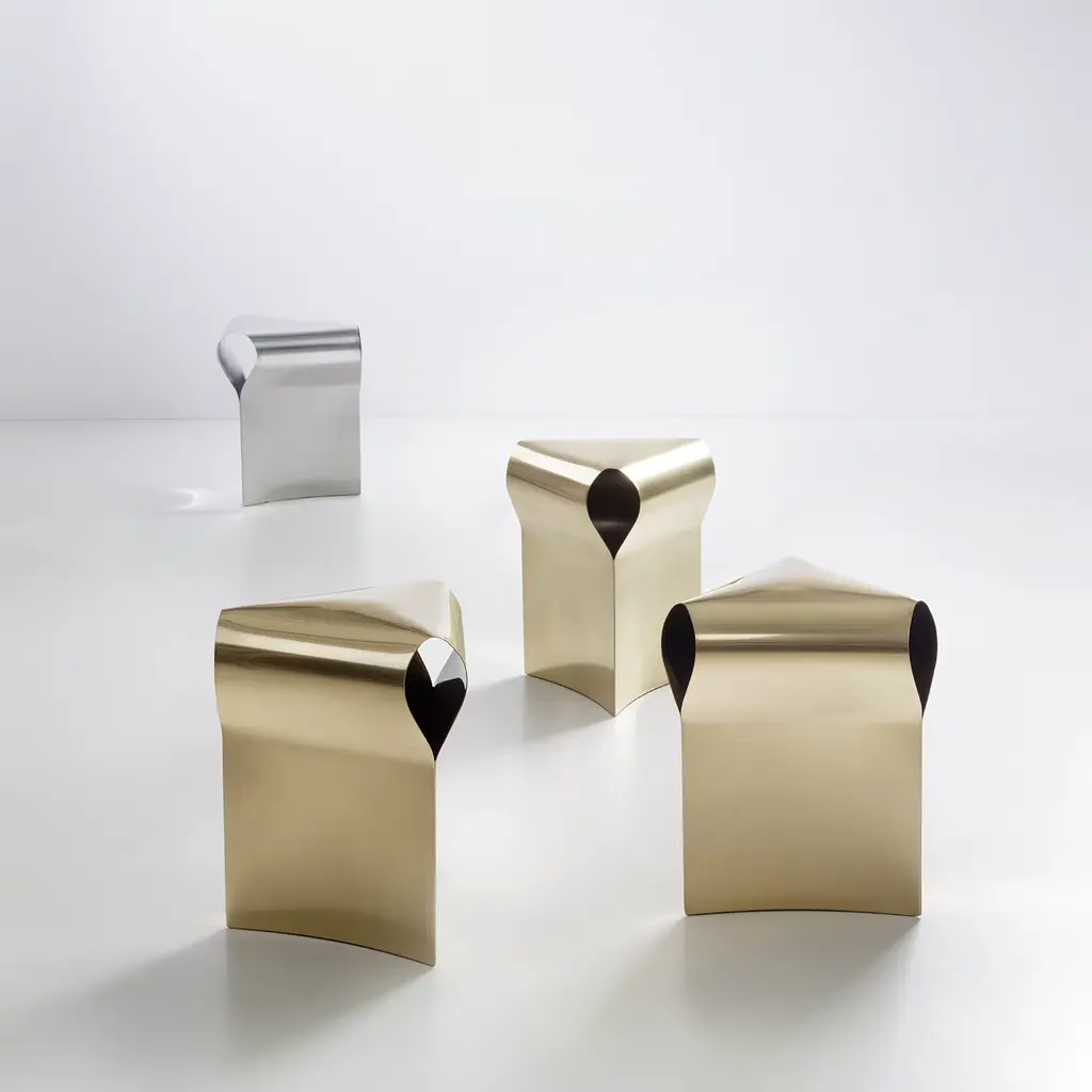 More than just a piece of furniture, the Efesto stool is a sculptural statement for the home that showcases the brand’s exceptional craftsmanship. Crafted from curved and bent sheet metal, the stool is made from polished brass, hand-shaped and hammered to form a distinctive triangular cross-section with no mechanical joints. This fusion of technical expertise and the inherent qualities of polished brass transforms the stool into a sophisticated design piece, elevating any space it occupies.