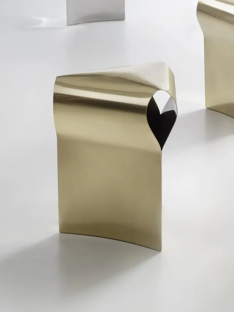 Efesto Stool by De CastelliDimensions: W 36 x D 42 x H 45 cmMaterials: Polished BrassOther versions are available, please contact us for any request.More than mere furniture, the Efesto stool is a sculpture for the home which exalts the brand’s manufacturing capabilities: by curving and bending sheet metal, brass is manually shaped and hammered to create its unique triangular cross section. The polished finish further highlights its sinuous shape. Entirely without mechanical joints, Efesto’s ability to support heavy weights is created through its meticulously designed structure. Technical savoir-fair and the intrinsic qualities of brass elevate it beyond a functional object to a unique, sophisticated design piece.DE CASTELLI“HARD COUTURE”Faithful to its decision to reinstate the special role of metal in design and experimentation, De Castelli infuses artisan ideas and workmanship into industrial processes, leading to entirely original results. The encounter with design inspires an approach to materials founded upon respect for their potential, be it hidden or obvious, which emerges slowly in a collection of pieces that, despite being part of a series, remain unique.Unique not only for the hand that has created them, but also for the singular cultural path that focuses on the aesthetic (and not just practical) value of the primordial material with which De Castelli shapes living spaces.A BESPOKE APPROACHEach object, even in the repetition of form, is a creative act in and of itself, one that incorporates a heritage of constantly-evolving expertise and research. The equation that relegates ‘cold’ metals to the margins of furnishing projects is thus overturned, bringing iron, brass and copper, in their infinite variations and finishes, to the centre of an entirely renewed stage, allowing them to finally shine with their own light.SUSTAINABILITYDe Castelli has always been committed to making the entire production cycle increasingly sustainable, aware that metal, the material with which its business identifies itself, is precious and must be treated with care, without waste.PEOPLE FIRSTThe wide spaces of the De Castelli headquarters in Crocetta del Montello (TV) allow those who work to enjoy environments where order, cleanliness and safety are always maintained and guaranteed. An attitude of attention and respect for people that has led to the shared ethical code.