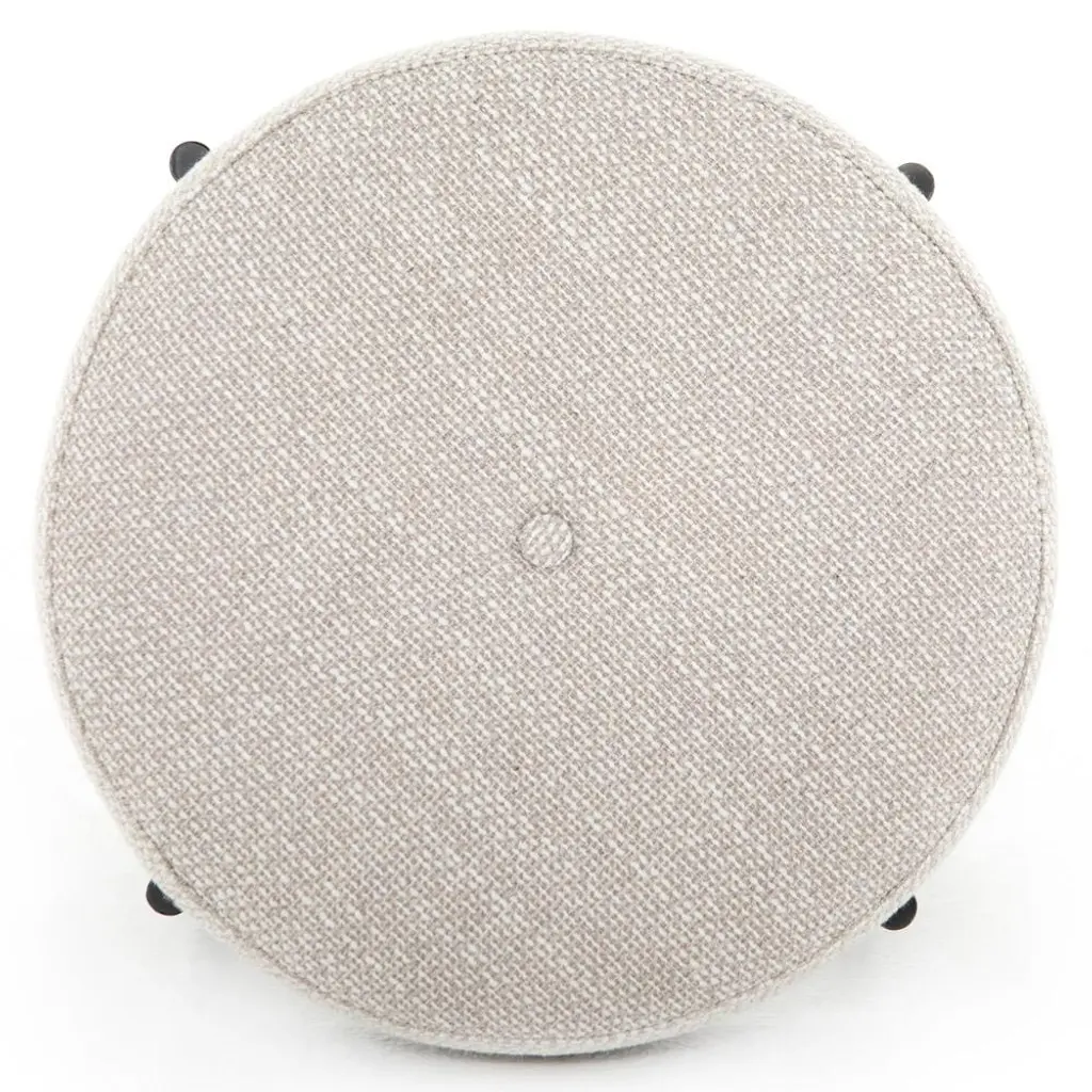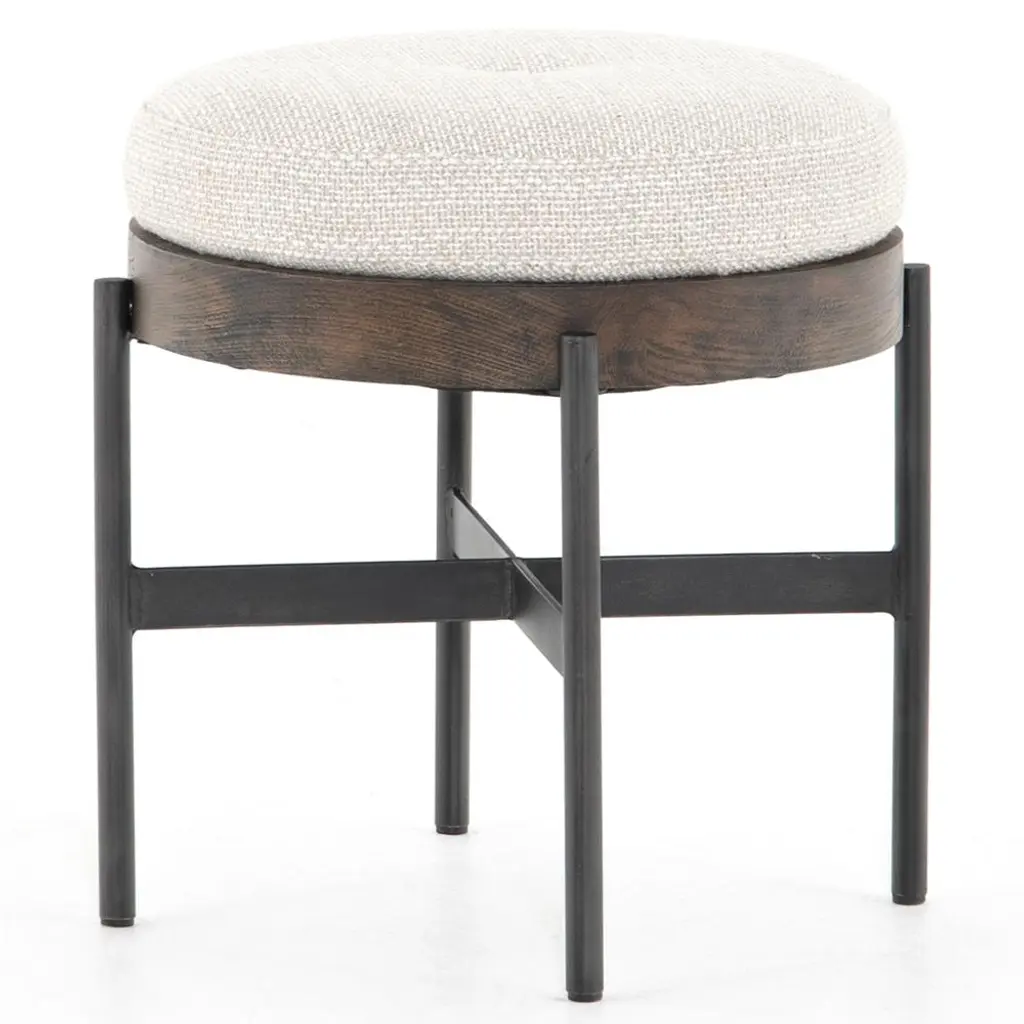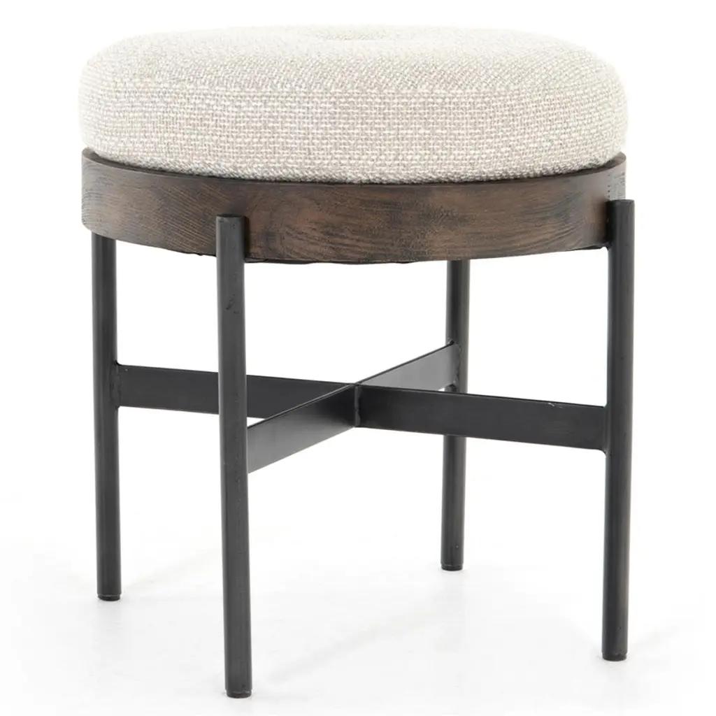 Neutral hues and lively textures make for an inviting mix of materials on the small Eliza stool. A cross base of gunmetal-finished iron supports the beautifully rounded brown beech wood frame. Topped with wheat-colored performance upholstery, this versatile piece can be used as additional seating or as a plush take on a side table.