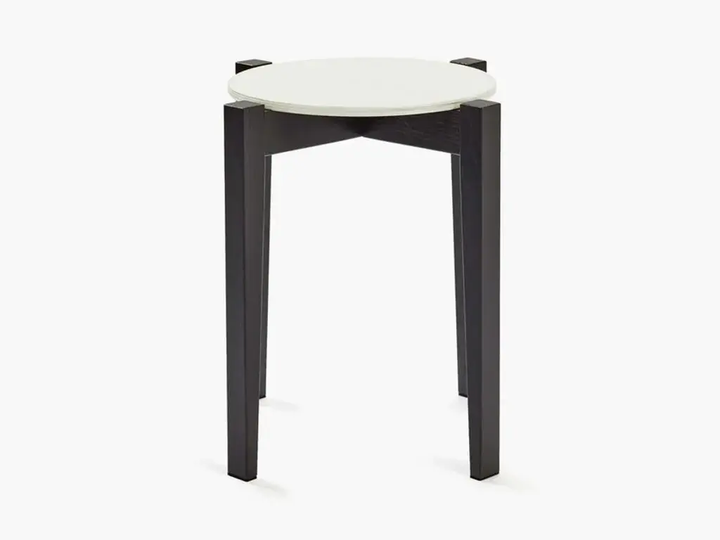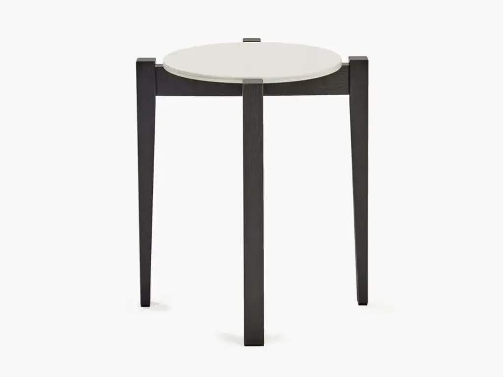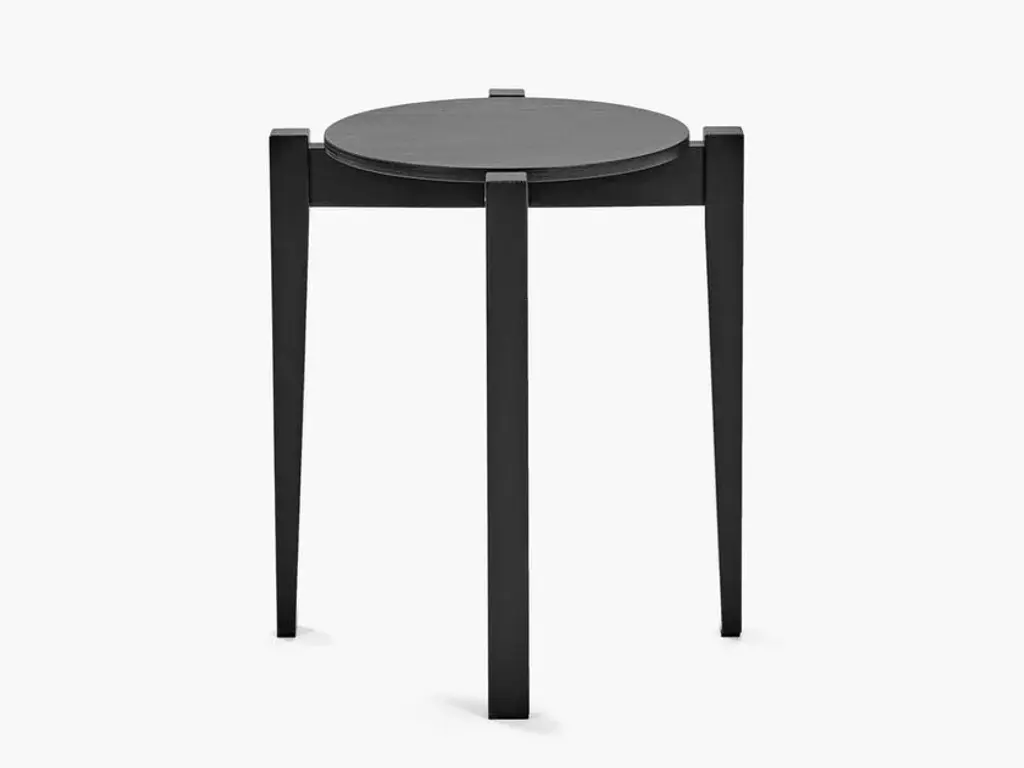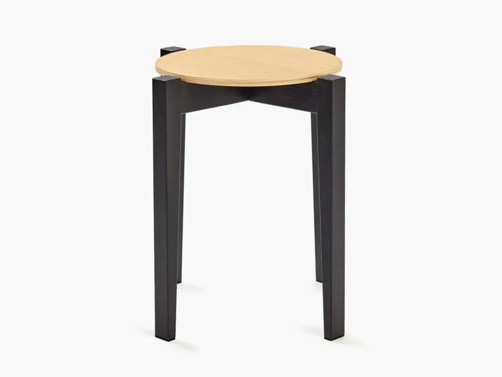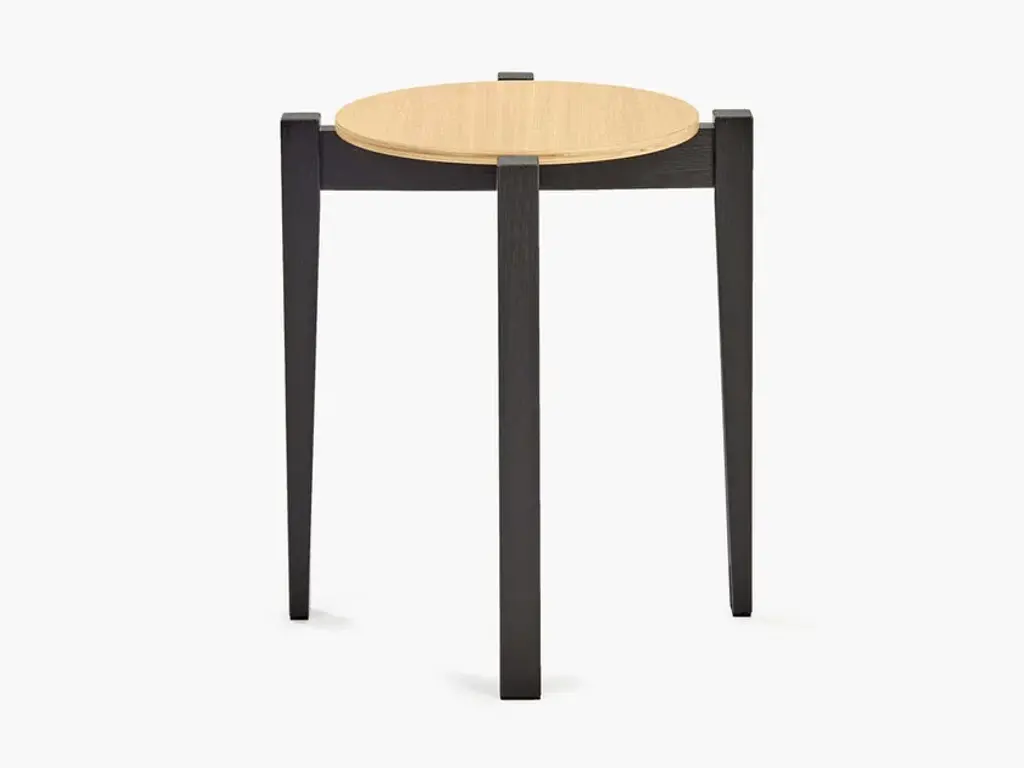 Éloïs is a stackable wood stool.The stackable Éloïs tables and stool provide a sophisticated, deft solution to various practical needs. Four tapered legs sit outside the top, foregrounding the elegantly skeletal architecture of the design. A cross-braced structure connects the legs and supports a square, rectangular or round top surface. The Éloïs Stool and Éloïs Round Table echo each other’s proportions at drastically different scales. The table offers an ample 122-centimetre-diameter surface, while the stackable stool is a discreet 44 centimetres across.It is the first time that Ann Demeulemeester and her life partner, Patrick Robyn, have designed a complete line of furniture. They have made one-off pieces, such as the Table Blanche for Bulo. As always, the starting point came from an own need or personal interest. “I make something because I’m missing it, I want it, and I can’t find it”, says Demeulemeester. The realisation developed into them wanting to translate these furniture pieces, designed for their own use, into accessible, timeless pieces that people would also want to integrate and cherish at home. Their furniture remains true to the couple’s distinctive aesthetic style. As with all their previous work, a light-hearted game between shadow and light is clearly visible, as well as a kind of refined decadence requiring an involved, intelligent owner. They don’t want to prescribe the use of these pieces but rather make suggestions for their use. At its heart, Demeulemeester’s work has always been an exploration and a celebration of contrasts - a beauty found in the interplay between strength and fragility, structure and nonchalance, the poetic and the radical, aesthetics and functionality. This is also the soul of the furniture collection and is further reflected in a dialogue between proportions and geometry. Linen, oak, wool, velvet, canvas - these materials form the heart of the collection and make you want to touch, caress and feel them. By experimenting with yarns, fibres and pigments, the designers have created a unique palette of textures and colours exclusively for the collection. There is the anticipated deep black and off-white, and also moss green, soft pale pink, a chic cream and warm roasted orange. All furniture is made of wood veneer or solid wood, FSC certified, and finished with either a lacquer or a water-based stain, which protects against dirt and allows you to clean the wood with a slightly damp cloth. The lacquers and stains are always sprayed (not applied with a brush). Customers should always be aware that wood is a natural material that can show imperfections and still undergo changes over time (shrinkage/expansion, change of colour under the influence of light). For the upholstered furniture, the fabrics are woven in Belgium and exclusively designed and confectioned for this collection.