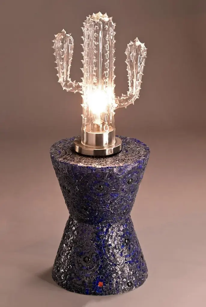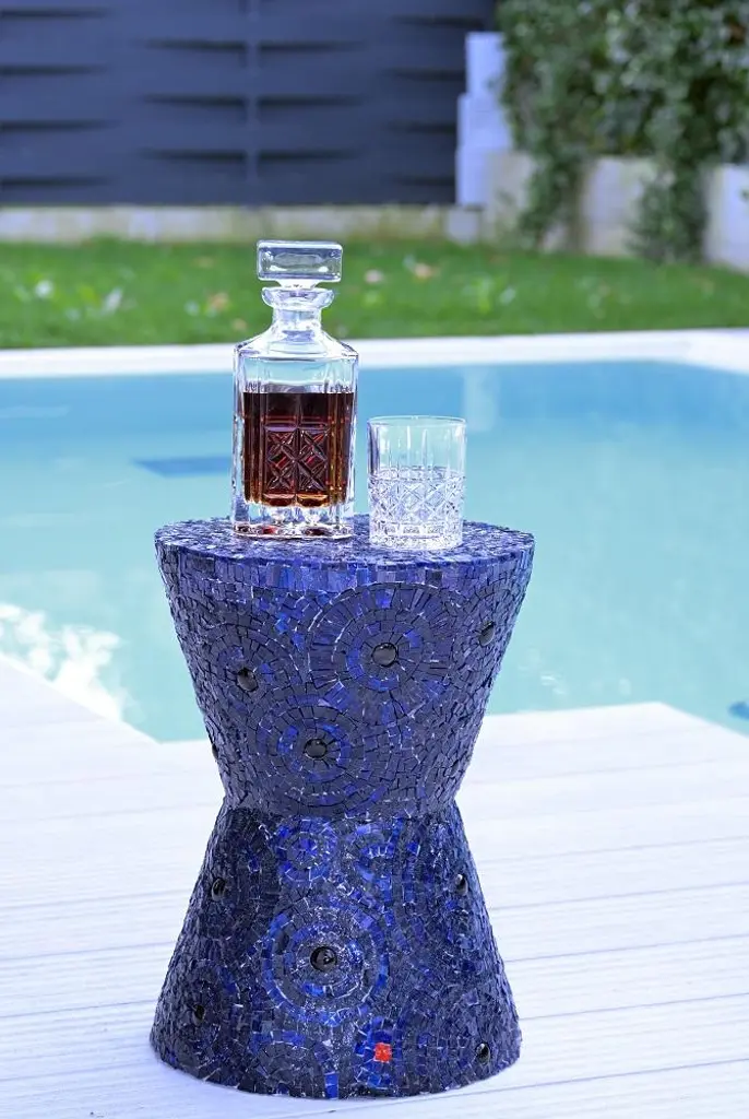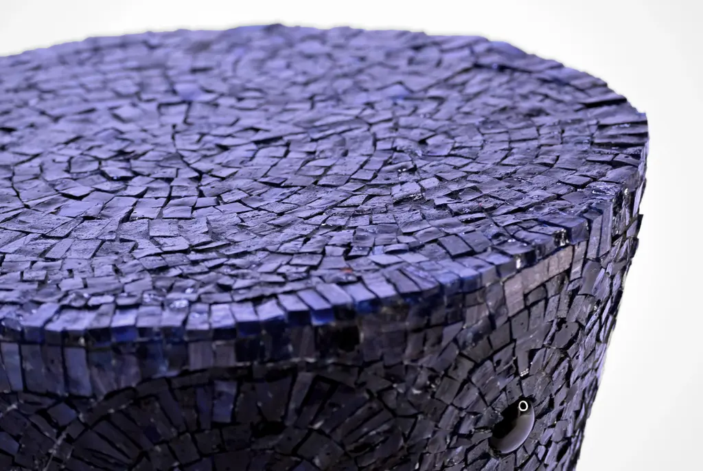Handmade mosaic stool in dark hues. A unique interpretation of Van Gogh’s Starry Night, this stool showcases dark hues inspired by the natural yet intense colors of darkness and night time, enriched with round details in matte night-blue and crystal blue shades, and marked by a central black ‘eye’. Highly versatile, it will suit any style decor. This handcrafted piece is unique. Due to their hand-cut nature, the 7000 glass mosaic tiles making up this piece may display unique and elegant irregularities. Details Size – diam 30 x 43 cm h Materials – glass and ceramic base. Number of mosaic tiles – 7000 pieces (result of 3500 hand-cut tiles, size 2x1x1 cm) Number of colors – 2 colors + black stones Working hours – 50 Mosaic weight – 6,6 kg Product weight – 12,9 kg Glass mosaic origin – Orsoni factory, since 1880 working with handmade glass tiles. Now the last furnace in Venice. The stool can be used outdoors. Labeled by Maker