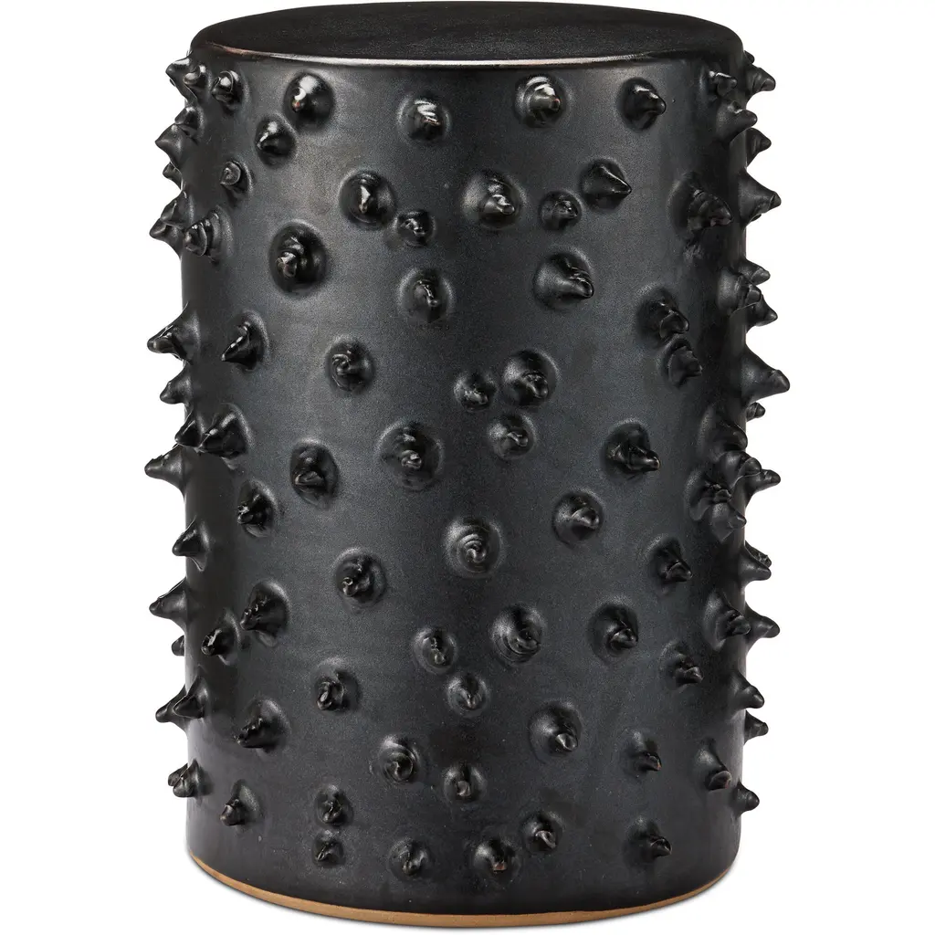This hand cast concrete studded drum stool has a matte black painted finish that accentuates its dramatic texture and silhouette. A graphic and sculptural accent piece that can serve as both a side table and stool.
