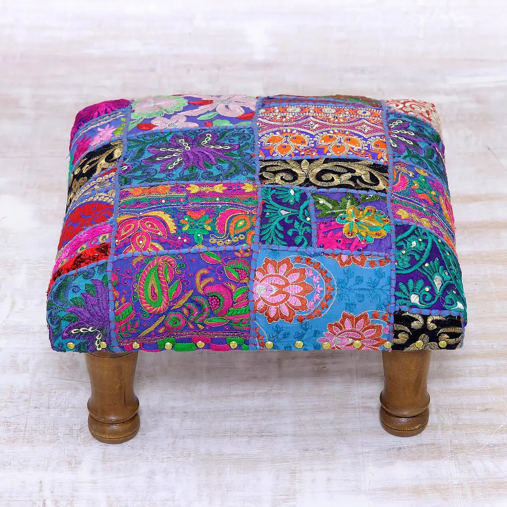Fair Trade Embellished Ottoman Foot Stool From India- Lapis Patchwork