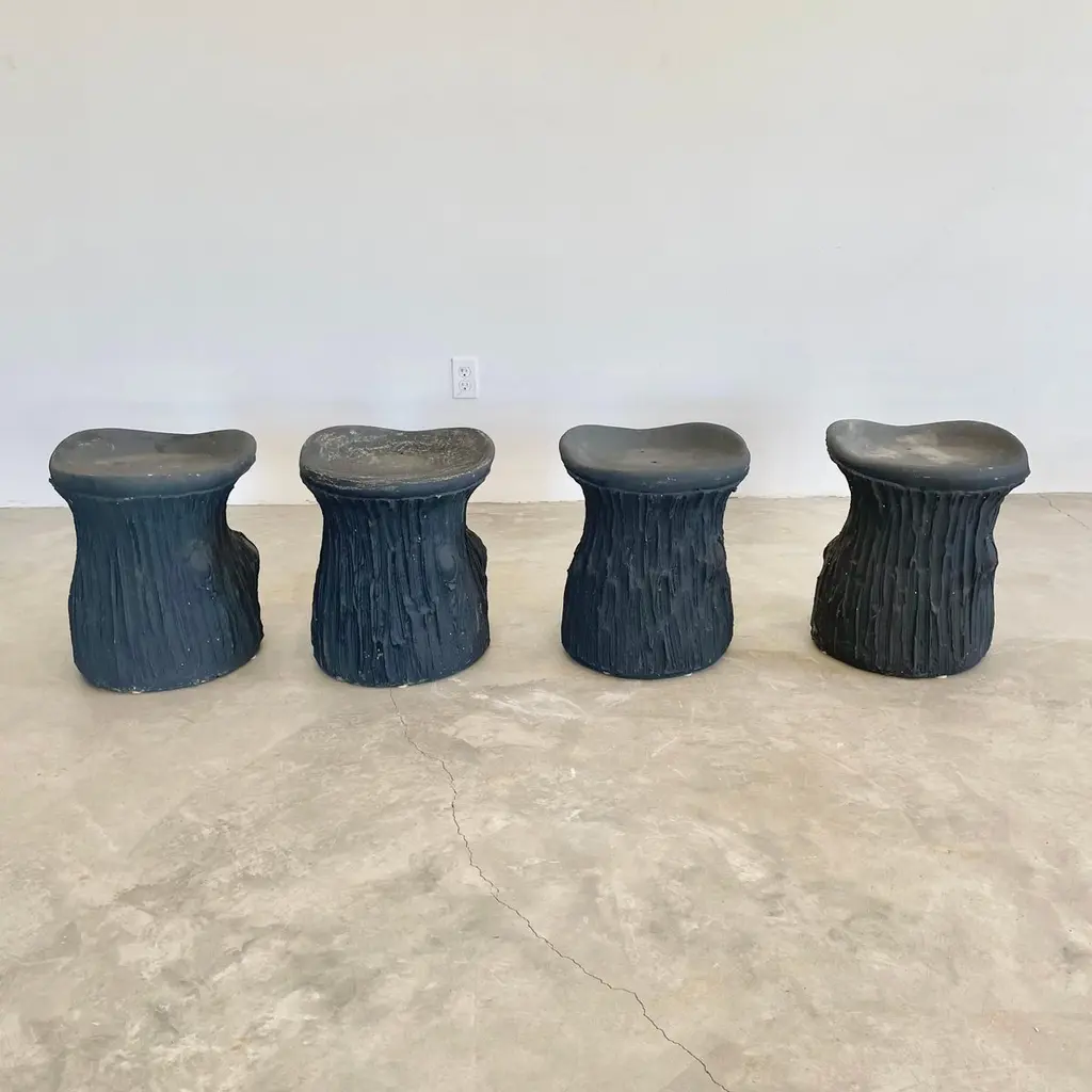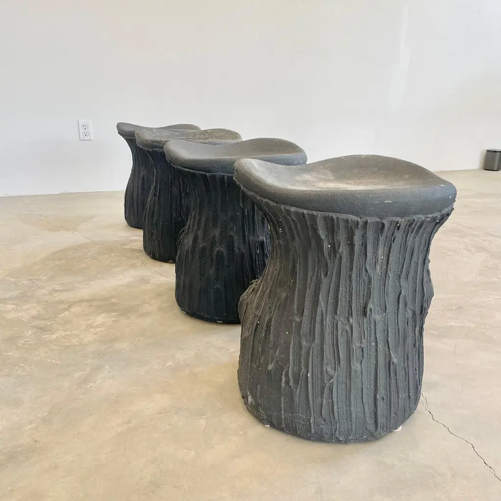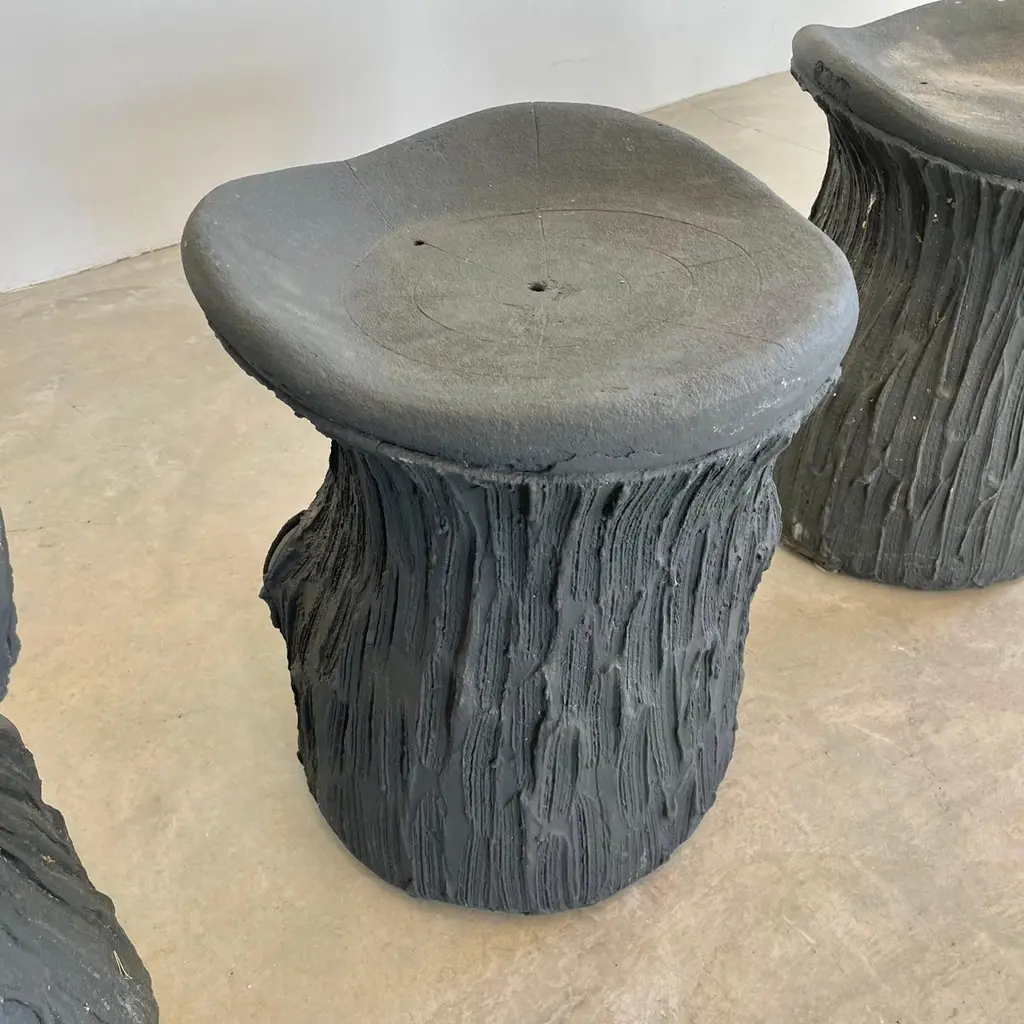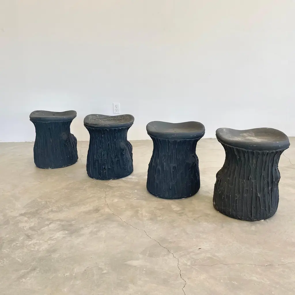 Substantial mid-century black concrete faux-bois stools, circa 1970s. Sculptural design. Great color and design details. Each stool is made of concrete which allows it to develop an incredible patina. Factory drilled drainage holes in each seat. A beautiful set with a strong presence. Very sturdy and able to hold an adult with ease. 4 available. Priced individually. Natural wear as shown.Located at our Southampton showroom.