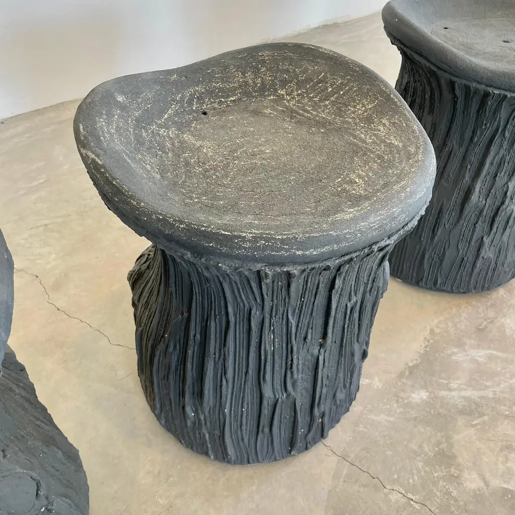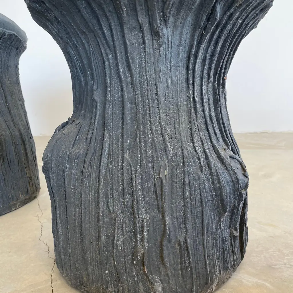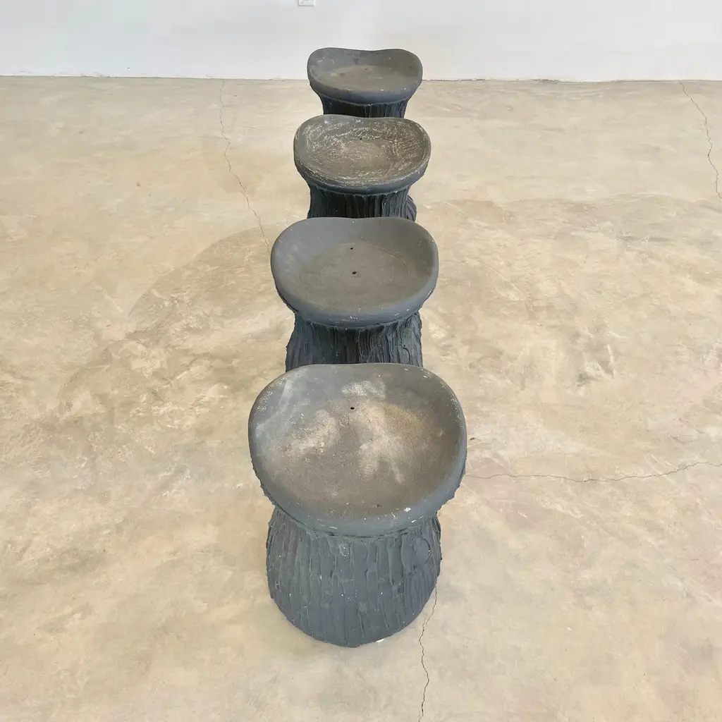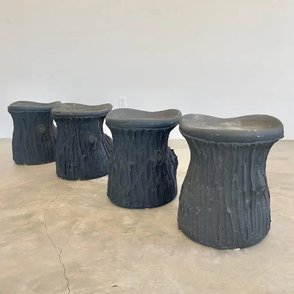 Substantial mid-century black concrete faux-bois stools, circa 1970s. Sculptural design. Great color and design details. Each stool is made of concrete which allows it to develop an incredible patina. Factory drilled drainage holes in each seat. A beautiful set with a strong presence. Very sturdy and able to hold an adult with ease. 4 available. Priced individually. Natural wear as shown.Located at our Southampton showroom.