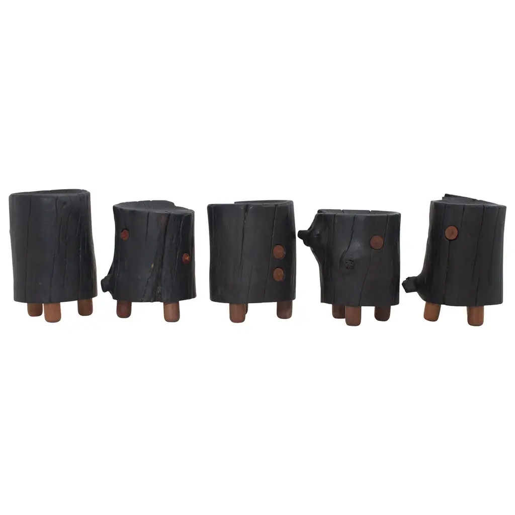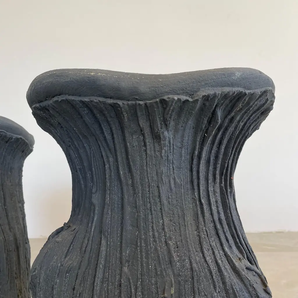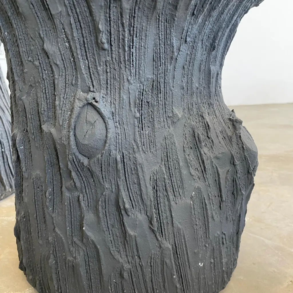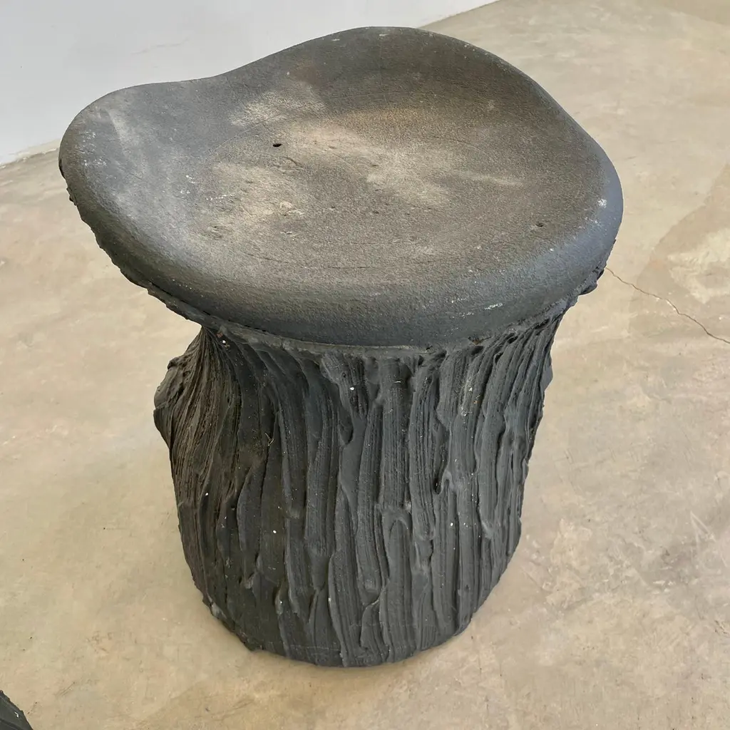 Substantial mid-century black concrete faux-bois stools, circa 1970s. Sculptural design. Great color and design details. Each stool is made of concrete which allows it to develop an incredible patina. Factory drilled drainage holes in each seat. A beautiful set with a strong presence. Very sturdy and able to hold an adult with ease. 4 available. Priced individually. Natural wear as shown.Located at our Southampton showroom.