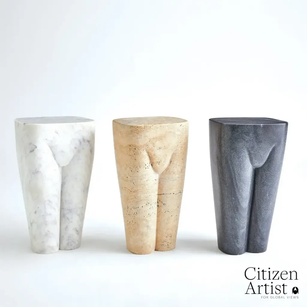 Carved from a solid piece of marble, with a beautful honed finish, this figurative stool is sophisticated, timeless, and chic. From a fashion forward perspective, Global Views offers accessories, furniture, statement lighting, and an assortment of rugs and mirrors to add beauty and joy to your home.
