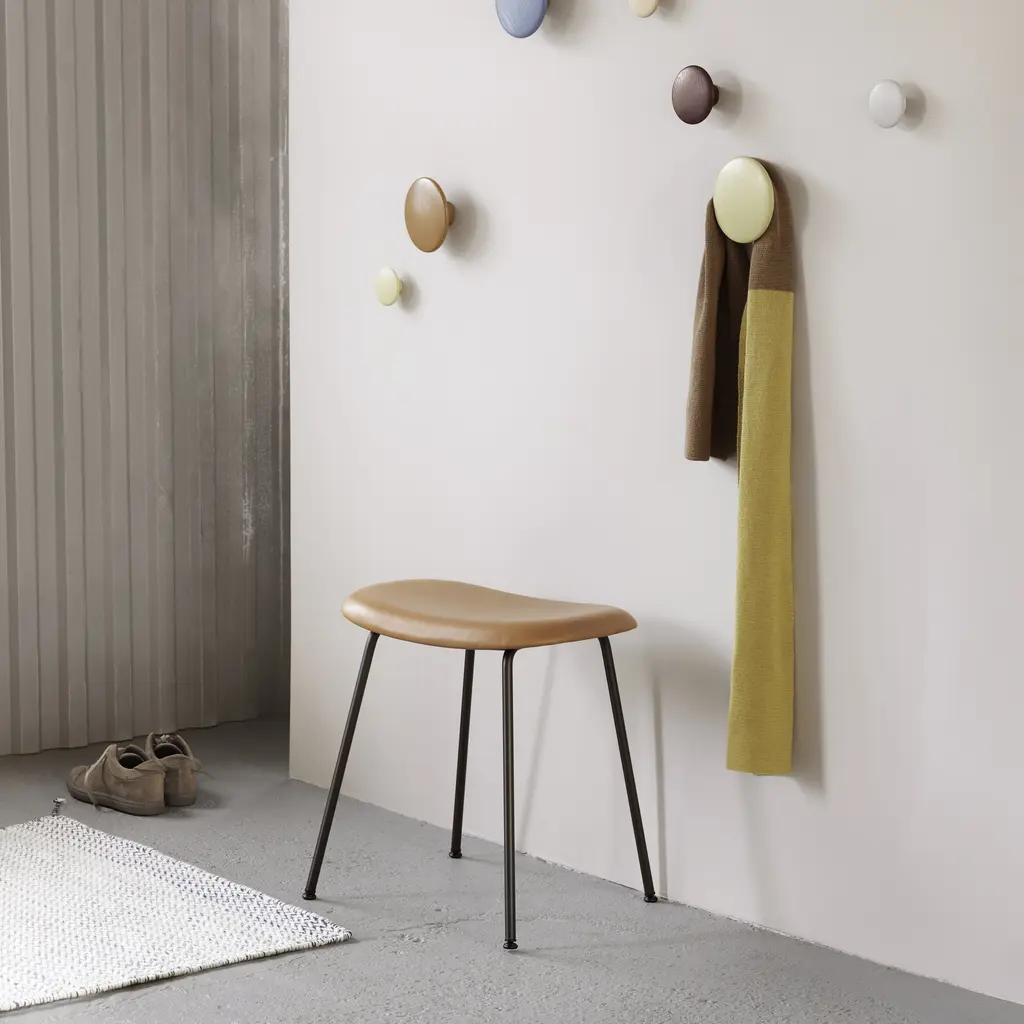 A luxurious leather overlay elevates this refined stool from the Fiber range by designers Iskos-Berlin for Danish maker Muuto. Inspired by the heritage shell chair, the underlying molded plastic seat is made from an innovative plastic composite with 25 percent wood fibers. Black tubular base in powder-coated steel imparts a crisply linear appearance that melds with a variety of interior settings.