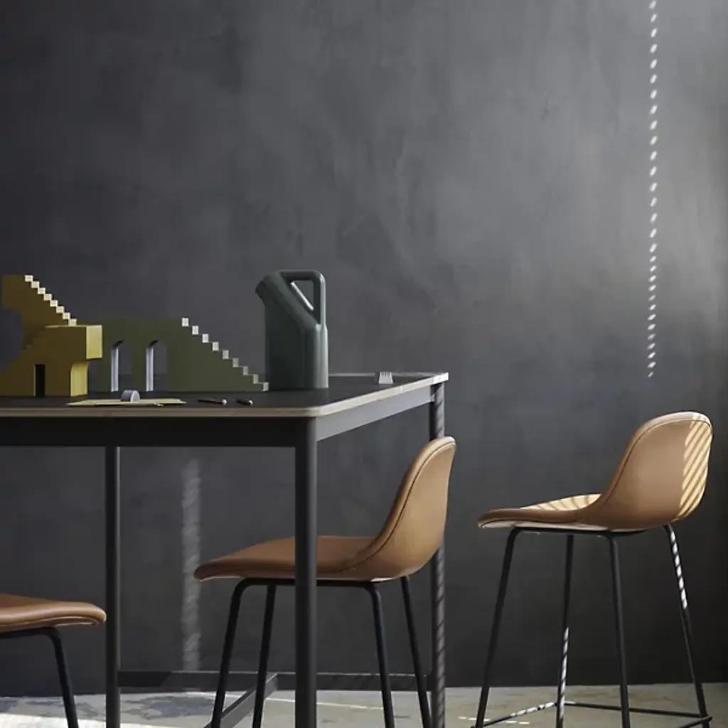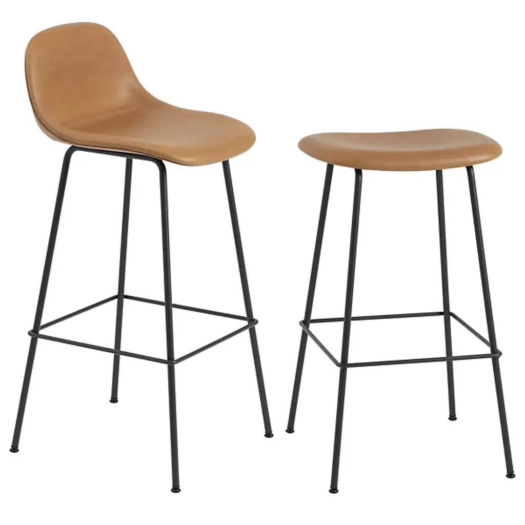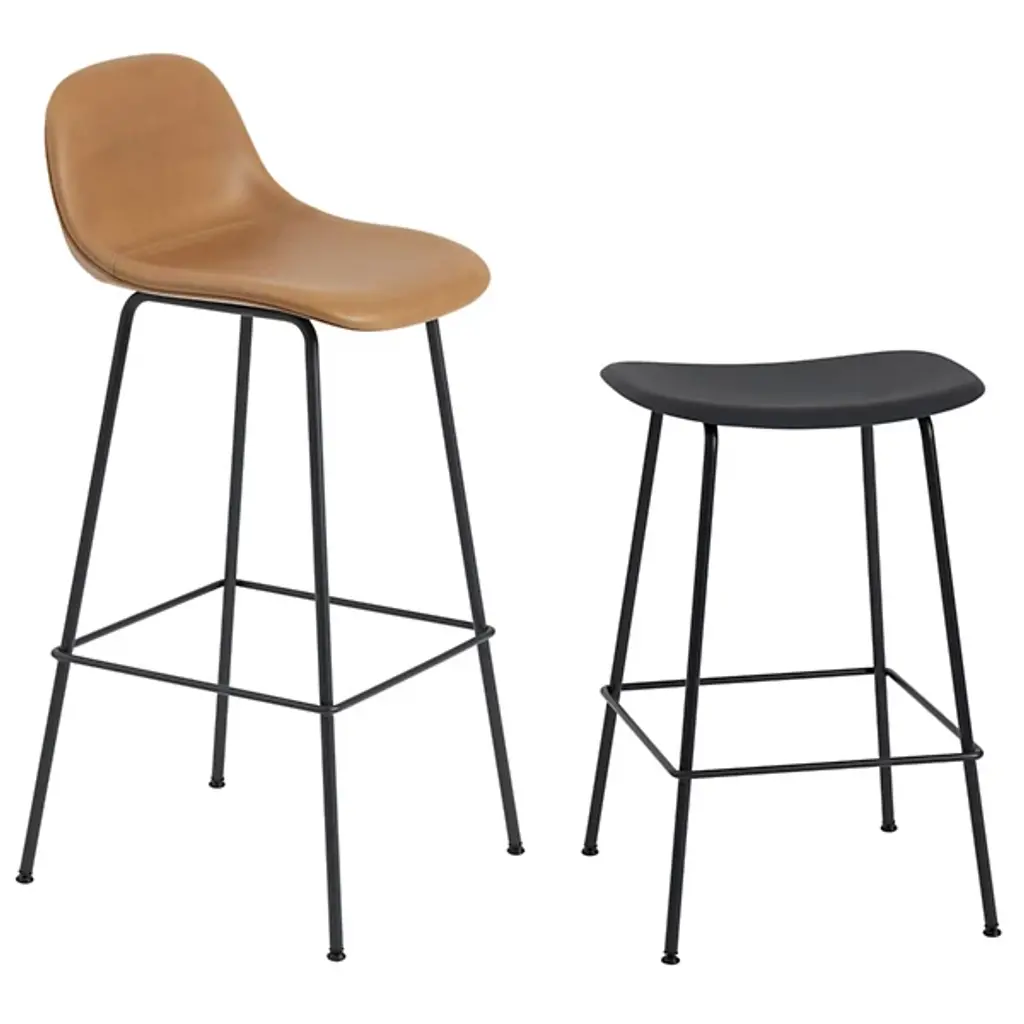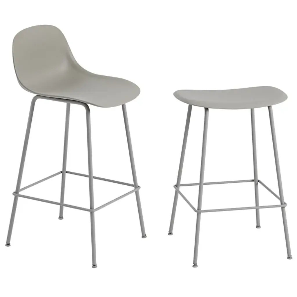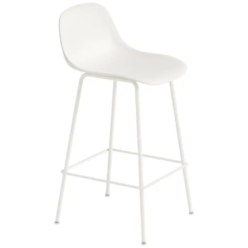Add a gentle, pleasing character to cafes, kitchen bar, and more with the Fiber Stool Tube Base with Backrest from Muuto. A stylish spin on Scandinavian minimalism with a modern edge, it uses a series of slender, lacquered oak legs joined at their tops by short horizontal beams and braced by a square footrest to support a single-piece shell seat with a short, though supportive back. The shell itself is made from a composite of recycled plastic and wood fibers that lend it an intriguing natural texture when seen up close and easing into a stately smoothness at a distance.