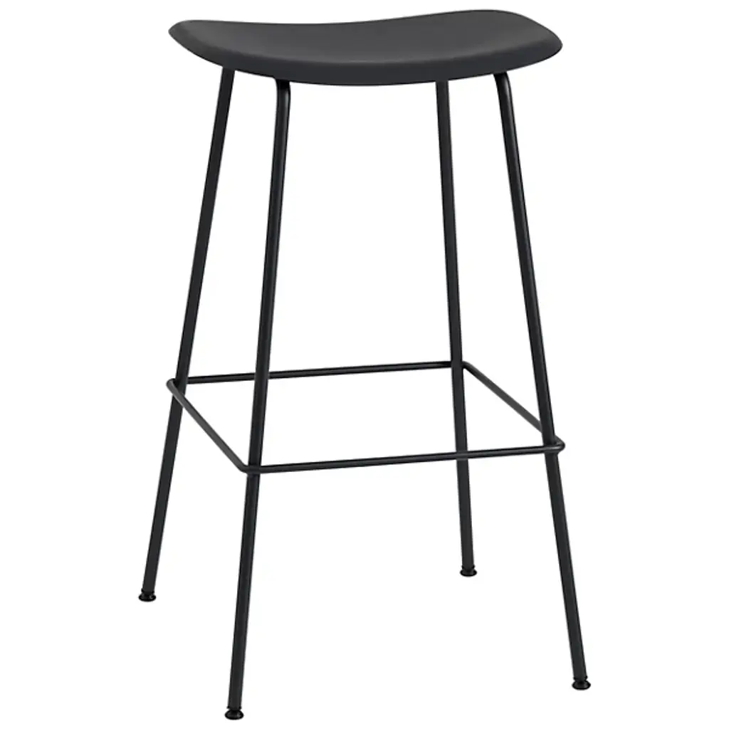 Add open minimalist seating to a bar, café counter, or at-home kitchen spaces with the Fiber Stool with Tube Base from Muuto. An airy design from Iskos-Berlin, it deploys a four-legged base of tubular, powder-coated steel legs braced by a slender square footrest midway down that contracts as it climbs to a round-cornered and concave rectangular seat. The seat itself is fashioned from a composite of recyclable plastic and up to 25% wood fiber compressed in an injection mold, creating a robust and richly textured surface that supports