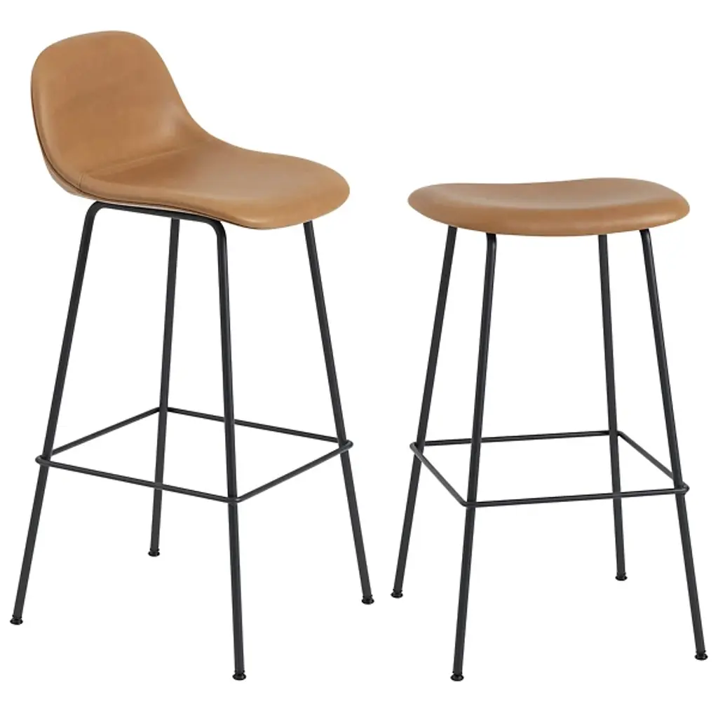 Add open minimalist seating to a bar, café counter, or at-home kitchen spaces with the Fiber Stool with Tube Base from Muuto. An airy design from Iskos-Berlin, it deploys a four-legged base of tubular, powder-coated steel legs braced by a slender square footrest midway down that contracts as it climbs to a round-cornered and concave rectangular seat. The seat itself is fashioned from a composite of recyclable plastic and up to 25% wood fiber compressed in an injection mold, creating a robust and richly textured surface that supports