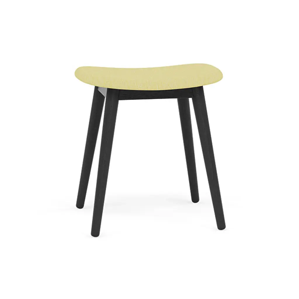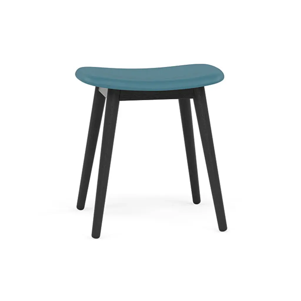 Design duo Iskos-Berlin ennoble this stool from their signature Fiber series with a silk-like leather overlay. Created for Copenhagen-based Muuto, the molded seat is inspired by the classic shell chair and given a timely update in an innovative plastic composite made with 25 percent wood fibers. Wood base crafted from solid oak, wet-lacquered in black to match black leather upholstery or in natural to harmonize with the cognac leather option.