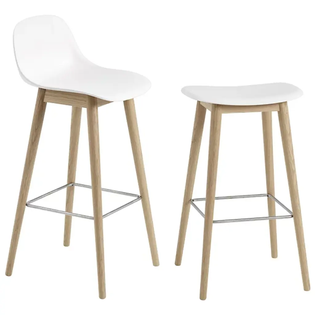 The Fiber Stool Wood Base with Backrest from Muuto is a balanced modern piece created with the idea of being low-key yet impressive. Design studio Iskos-Berlin looks at each design like a well-crafted story. A good story's essential elements of being clear, surprising, and making one smile are what Iskos-Berlin factors into this piece. Clarity and openness are displayed in the tall linear legs of the design. The wood construction of the legs charms with rich organic texture. This texture surprises in contrast to the cozy seat shell. The shell's soft curves caress the lower body and support the back for a smile-worthy seating experience.