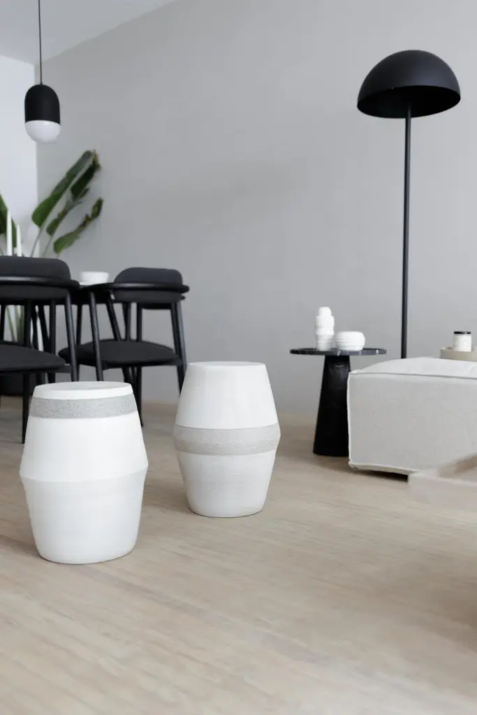 Handmade ceramic stool with matte white enamel and silk thread details. Production time: 6-8 weeks for items without marble / 13-14 weeks for marble pieces. Shipping +10 additional business days. Casa Quieta uses natural materials such as woods, stones, fabrics etc. These materials may vary in tone, veining, and cavities due to their natural origin. This is part of the inherent beauty of materials and is not considered a flaw. Due to the artisan nature of our production process, there is a +/- 3mm measurement tolerance.