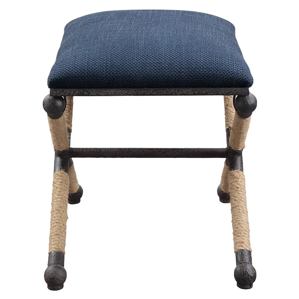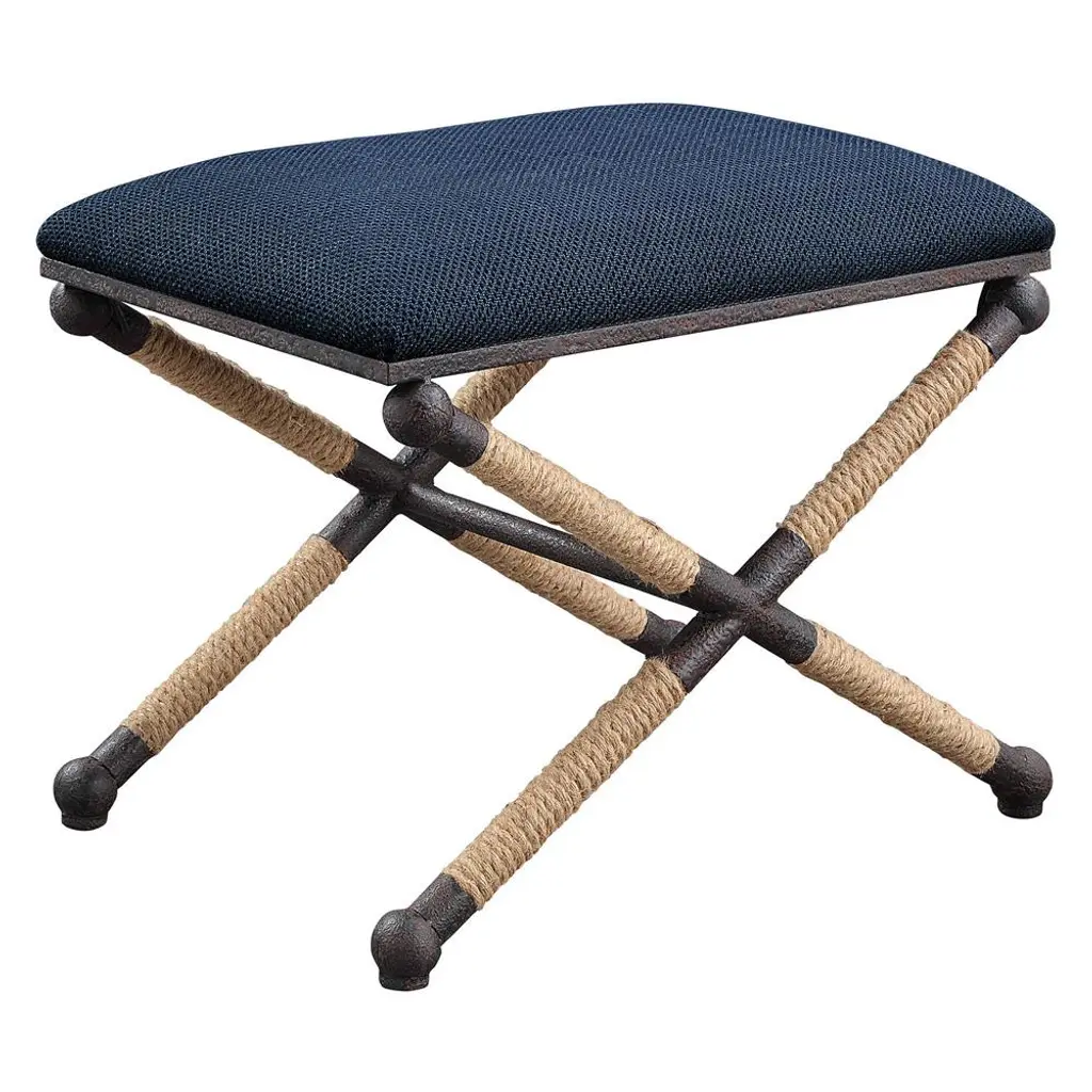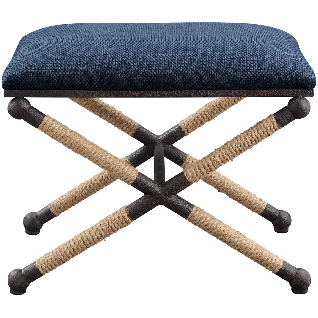 With a compact size and dynamic design, our Finley Coastal Beach Black Iron Frame Rope Accent Blue Cushion Top Stool provides extra seating without compromising on space. Formed in a classic X shape and accented with natural fiber rope, its iron base features a rustic, textural finish. The cushioned seat is upholstered in navy blue cotton-blend fabric.