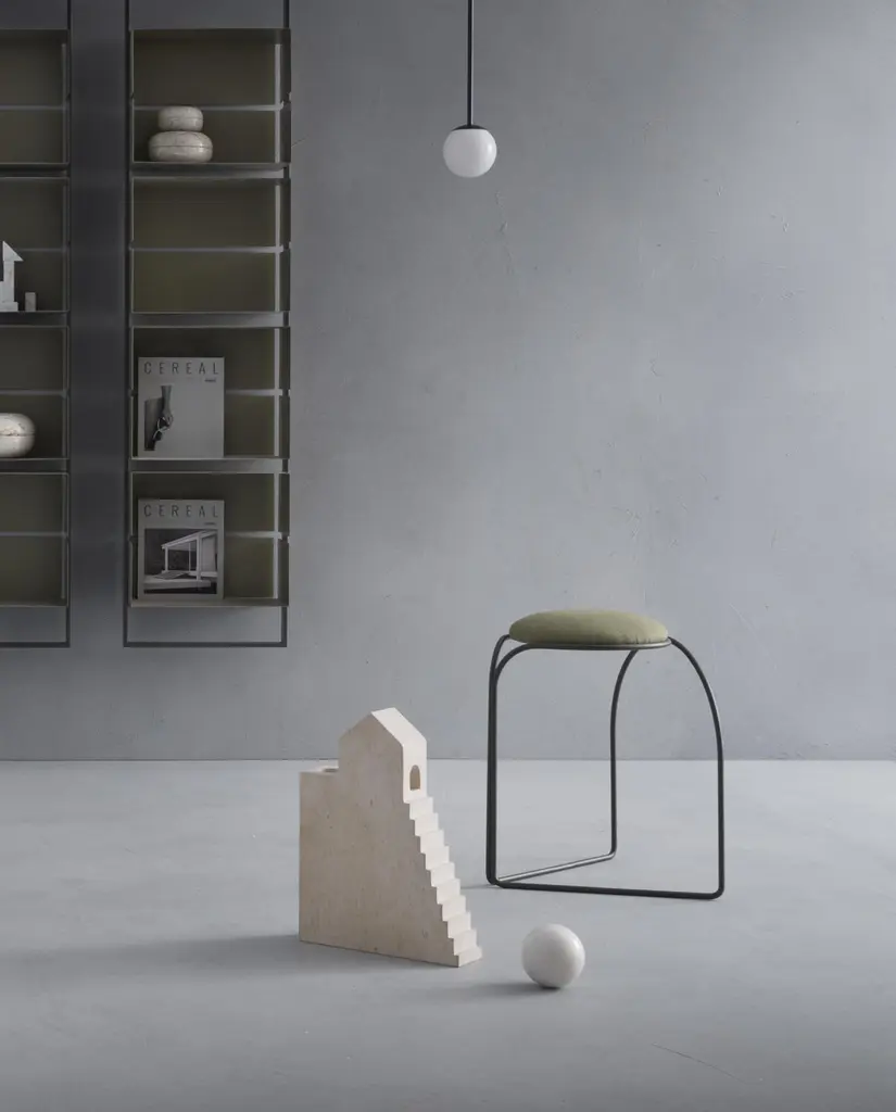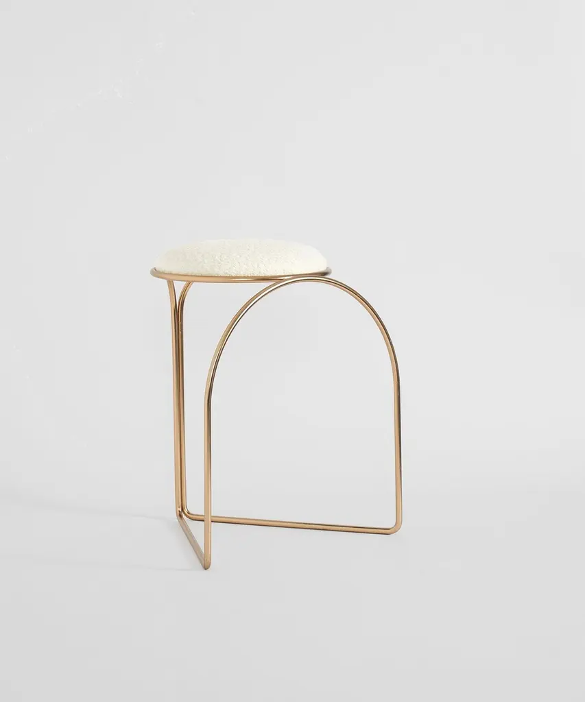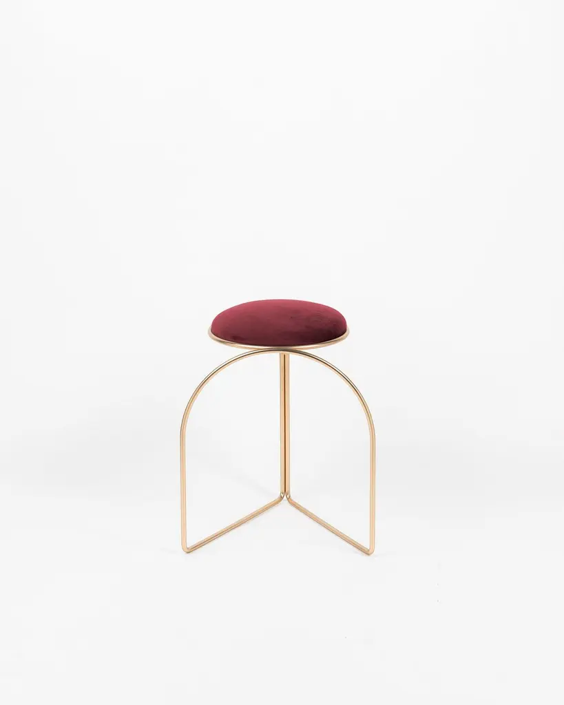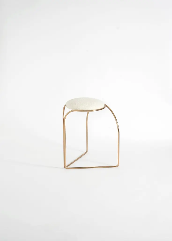 Flow low stool matt or light gold are made by an element, a continuous wire drawing geometries born from the projection of a circle on a triangle, in which the rigour of the continuous lines plays with the circular shapes that embrace the padding creating a support for the back.Flow low, stool or sculpture, design by Enrico Girotti, is characterized by elasticity and flexibility of design that uses wire, solid, durable and resistant, bent into shape with care and precision, completely made in Italy.More fabric and COM available and Hi Customizable.