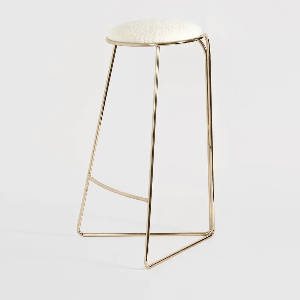 An element, a continuous and unique metal wire that draws geometries born from the projection of a circle on a triangle, in which the rigor of the continuous lines plays with the circular shapes that embrace the padding. Flow hi stool by Enrico Girotti is made in steel galvanized in polished gold and painted. It is also suitable for outdoor use with metal seat. Please, ask the Concierge for customization options.
