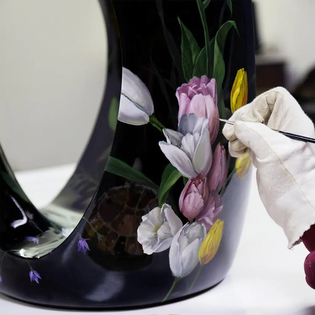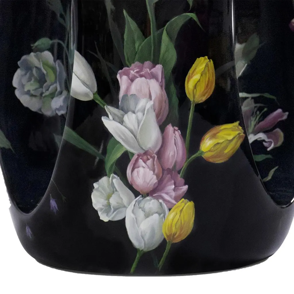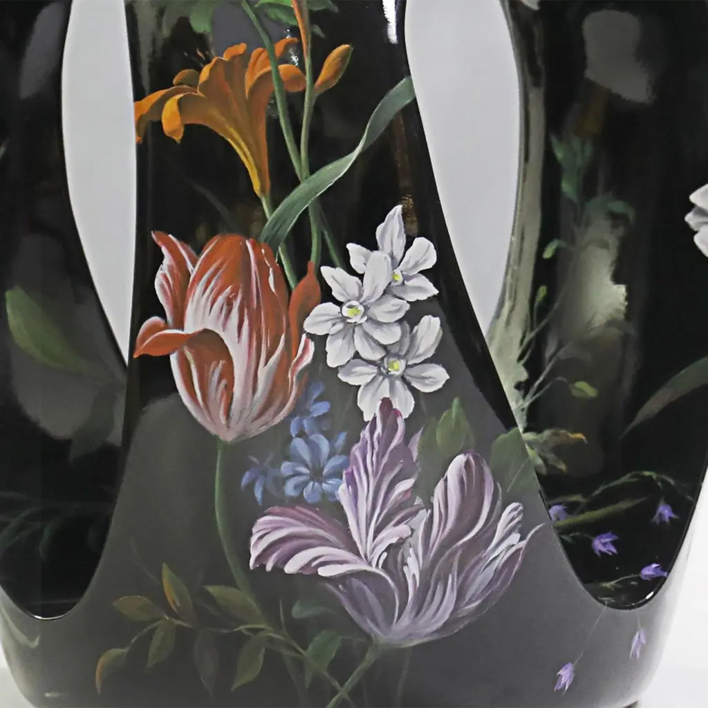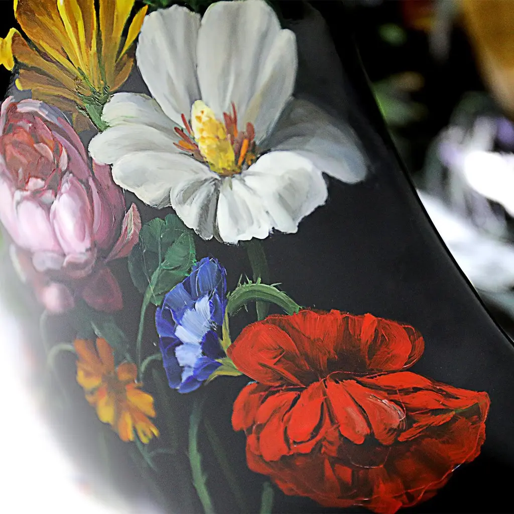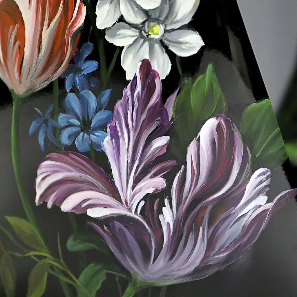 Stool Flowers with structure in resin in black lacquered finish, with hand-painted flowers.