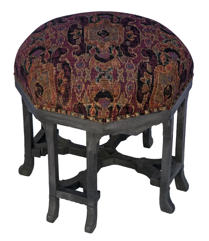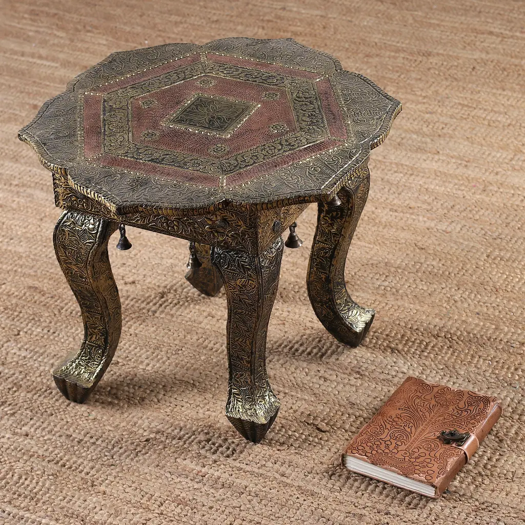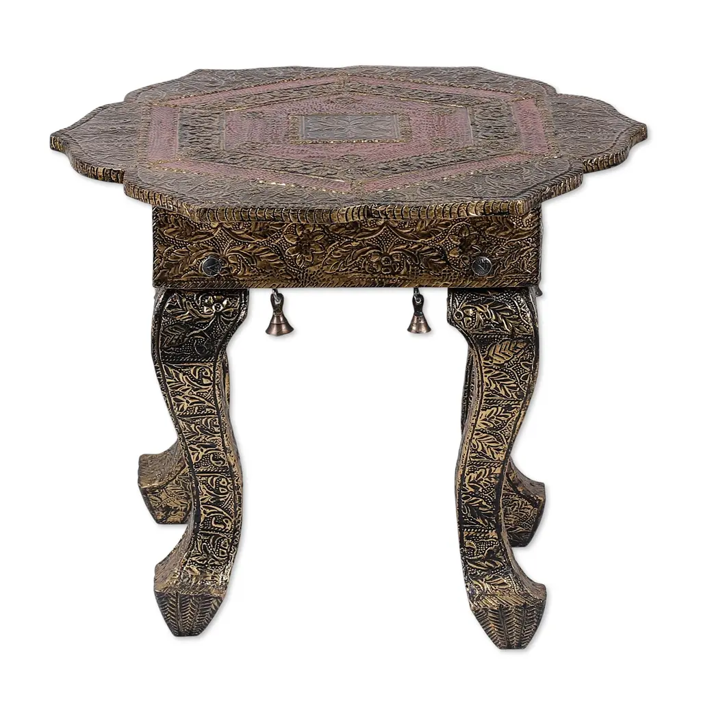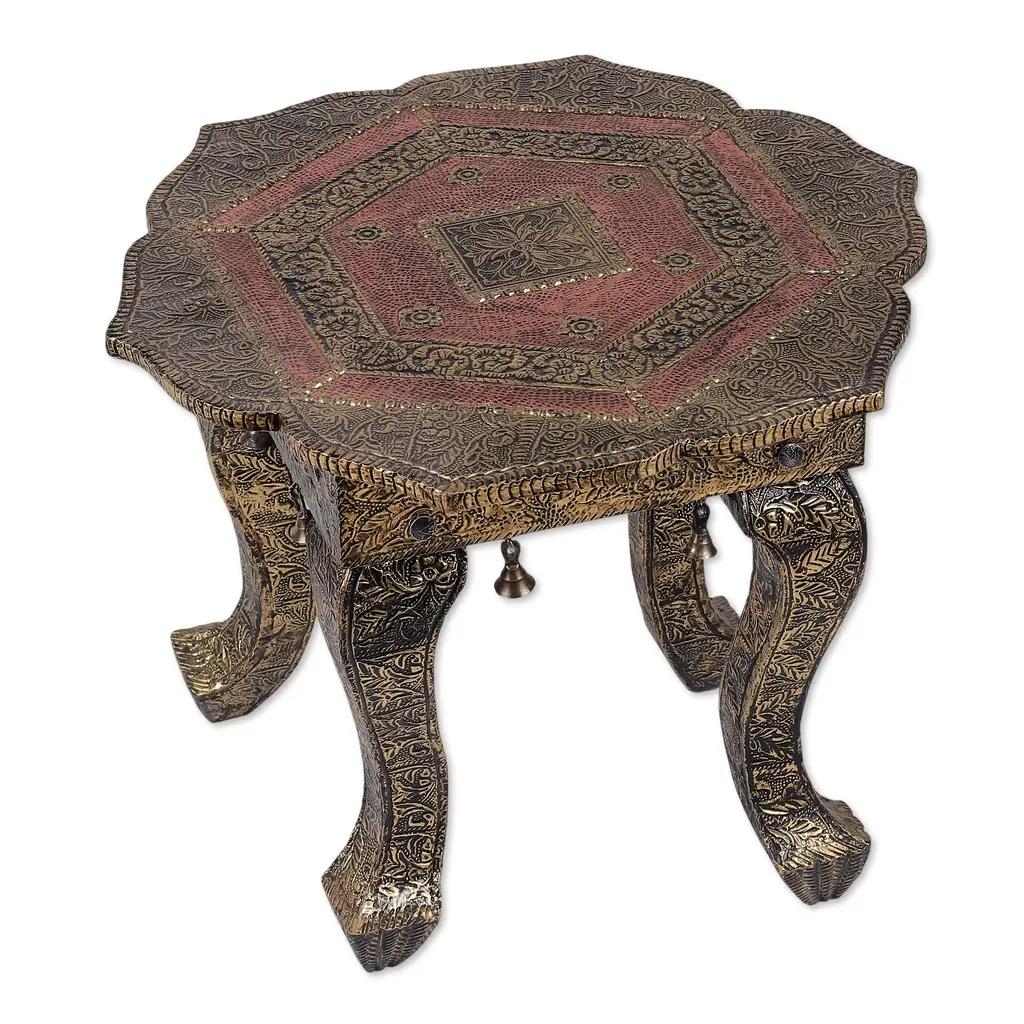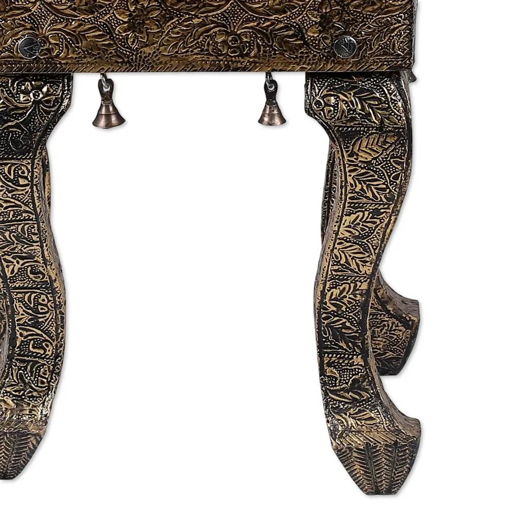 The magnificence of the ancient Hindu dynasty returns in the details that decorate this mango wood stool from India. Presented by Khalid Ali, this exquisite piece merges classic lotus details with intricate embossed work made on copper and brass sheets. Tiny bells finish the piece with a touch of enigmatic beauty.