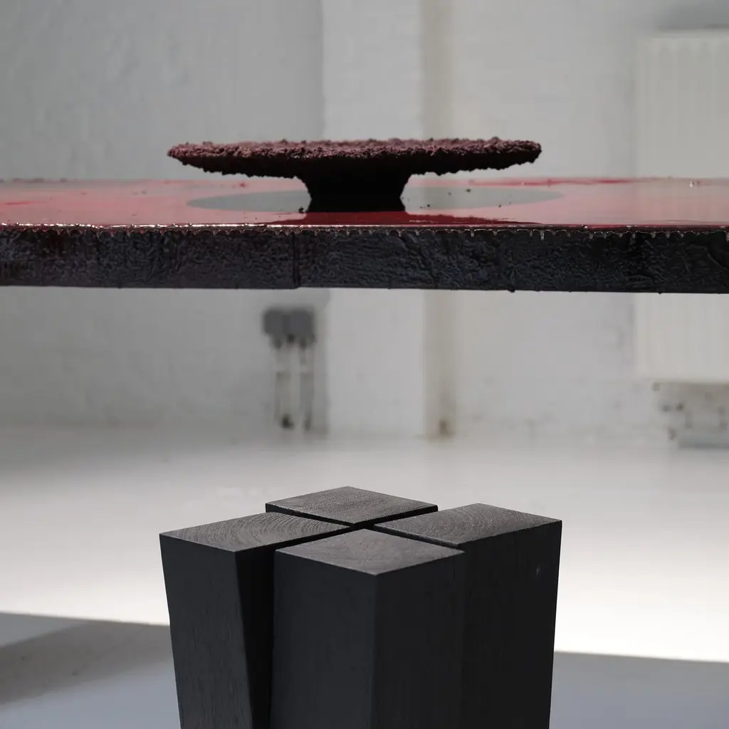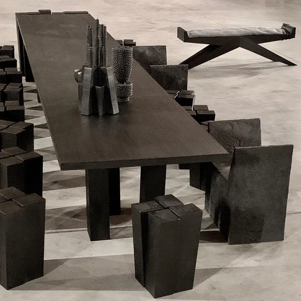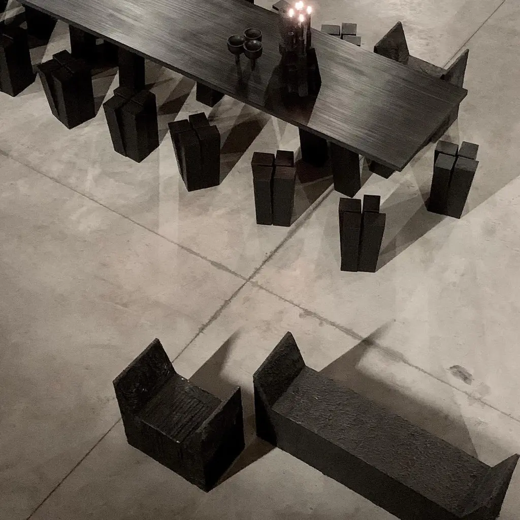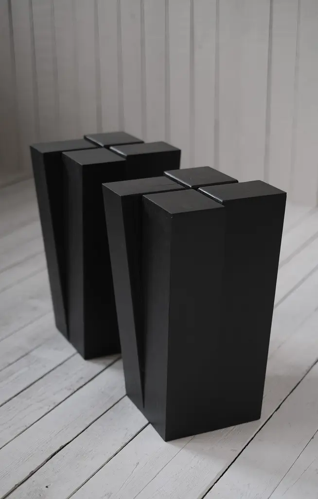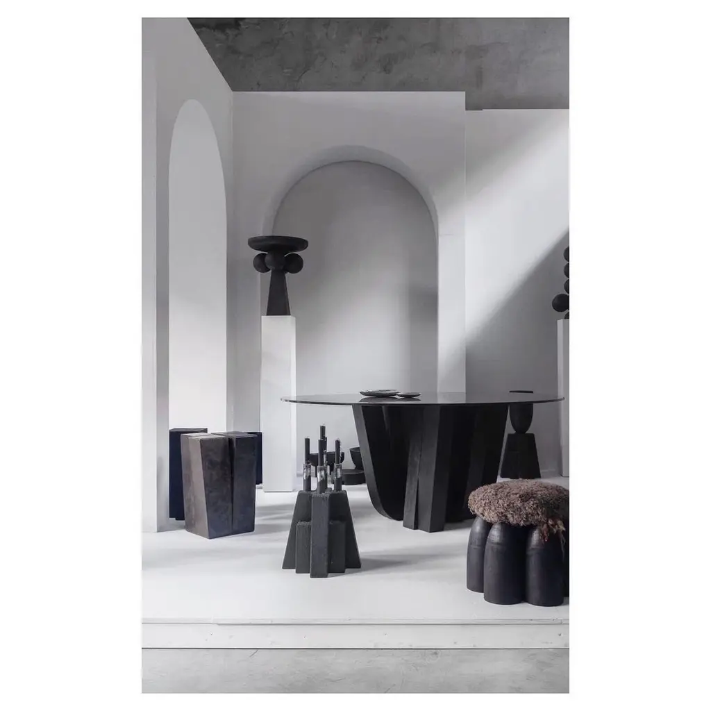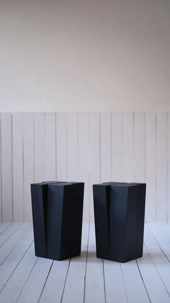 Four legs stool by Arno DeclercqDimensions: D 32 x W 32 x H 50 cmMaterials: Burned and waxed Iroko woodSigned by Arno DeclercqArno DeclercqBelgian designer and art dealer who makes bespoke objects with passion for design, atmosphere, history and craft. Arno grew up in a family with parents who like to work with beautiful brands and objects.His father studied at the Royal Academy of Arts Fashion Department, he worked for Bikkembergs and made his own fashion brands, but has also collected tribal arts for more than 20 years. His mother, who worked with his father from the beginning, bought a shoe store in 2010 where they sold brands as Rick Owens, Ann Demeulemeester, Maison Martin Margiela, ... With the interest in beauty he learned from his parents, Arno studied interior design, after learning a lot about materials and with great knowledge of history he designed interiors and opened his own gallery for ethnographic art and design.The collection has come to the idea that there are too few interiors where they no longer have the big and static vases and candlesticks that the people had in big houses over 100 years ago. By focusing on architecture, ancient arts and design, after war buildings, defence buildings (bunkers and fortresses) and tribal arts, he created a collection that became a Classic.Each piece is unique because it is entirely handcrafted by him. Made of tropical hardwood called Iroko this he discovered after one of his many trips to West Africa interested in voodoo arts.In these strange tribal arts, the wood "Iroko" is used in many objects, according to their culture, the ancestors lives in these trees, and they also call this tree "the king of the forest".Arno also combines this with Belgian oak, that dried for more than 30 years, wood that was provided for the many furniture makers in Mechelen.By treating these objects through the Yakusugi technique or another mentioned "Shou Sugi Ban" an ancient Japanese technique where the objects are burned to protect the wood from weathering and subsequently fixed to get a patina look as long as possible. This gives each object a unique texture.