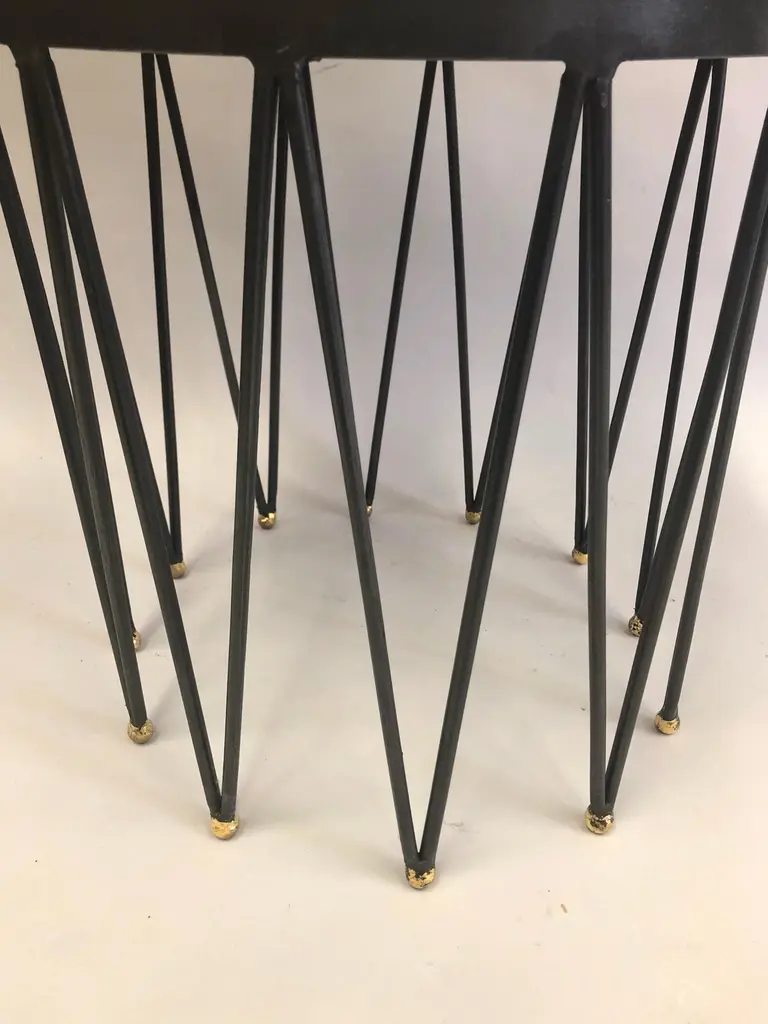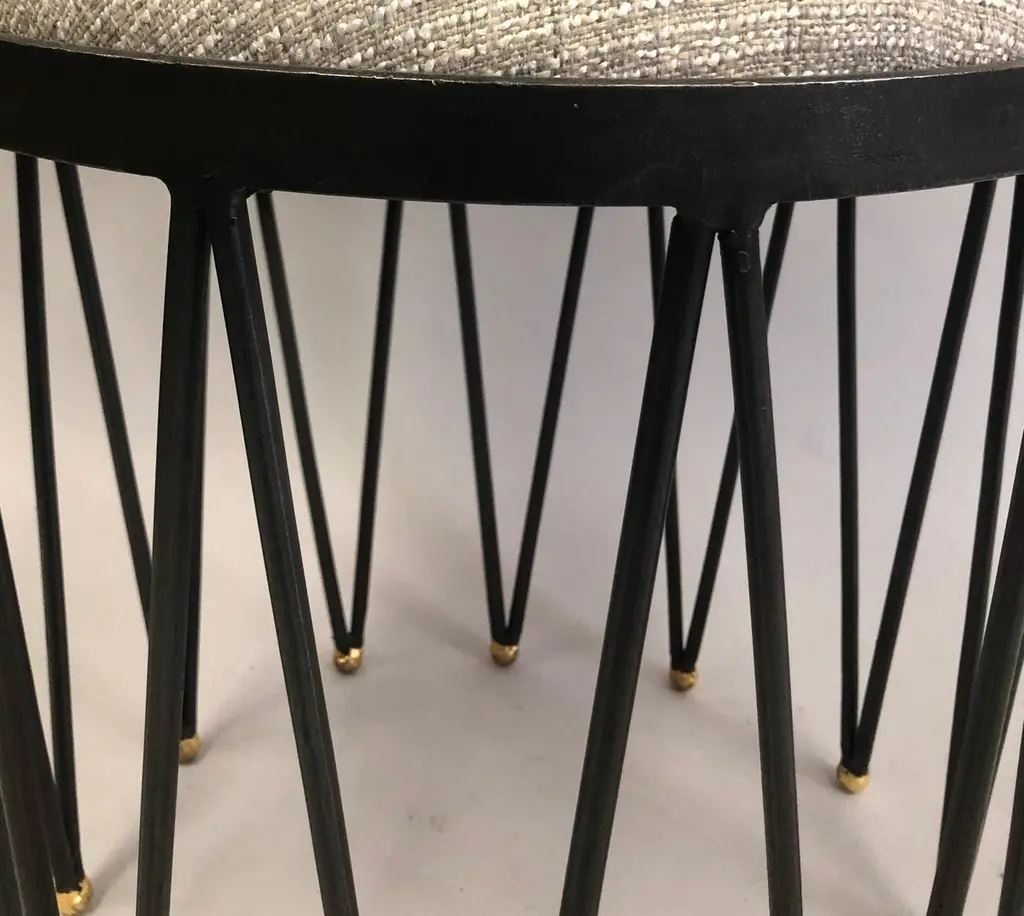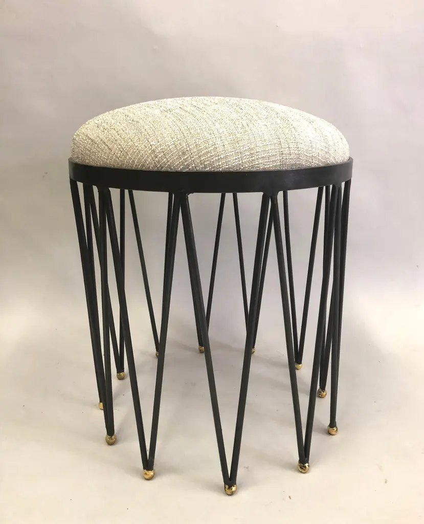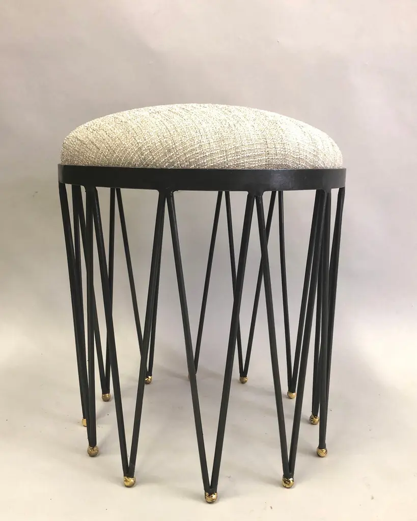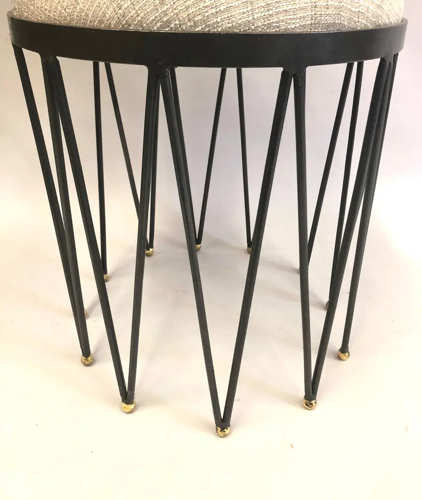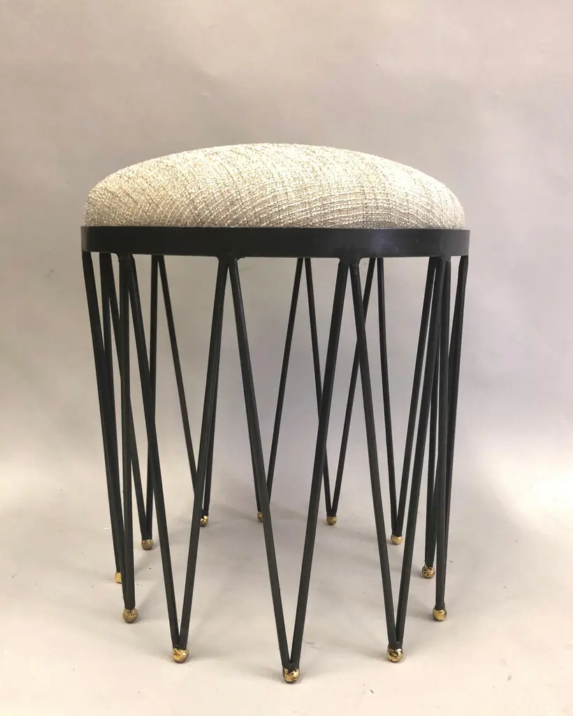 An Elegant, Rare and Timeless French Modern Neoclassical gilt iron stool or bench attributed to Gilbert Poillerat. The round form of the stool is complimented by the exquisite ironwork design in a lozenge pattern. The piece has an upholstery seat set into this unique hand wrought iron frame. Round ball feet and hand gilding complete the piece. Priced and sold as individual pieces.