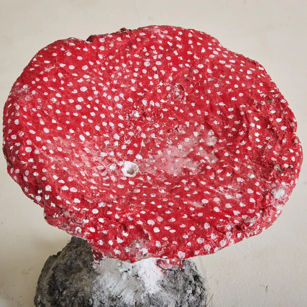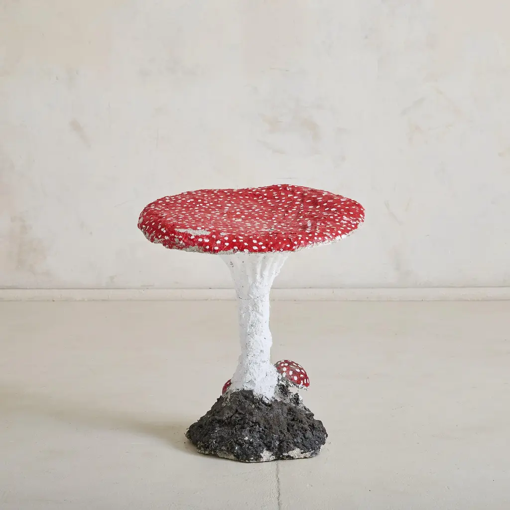 A 1960s French hand-painted concrete mushroom stool or garden sculpture featuring a red and white spotted top and small decorative mushrooms along the base. This garden decor could be used indoors or outdoors; it’s playful, whimsical, and has beautifully endured the test of time. Sold and priced individually. Condition: Good vintage condition. This piece shows signs of age that align with outdoor use, including paint chipping. While our vintage garden furniture, decor, and lighting were originally used as indoor/outdoor, prolonged exposure to direct sunlight, rain, extreme humidity, heat, cold, or wet climates can lead to natural aging, fading, and potential deterioration. We recommend using protective covers when not in use and storing items indoors during adverse weather or cold winters. Stone and other durable materials will develop a unique patina and character but may also weather and change color when left outdoors for extended periods. Some wear and tear is expected and adds to the vintage charm of your garden decor. The seller is not liable for cracks and fissures that occur on natural stone, either vintage or contemporary, in freeze/thaw environments or environments with excessive heat or moisture. By purchasing this item, you acknowledge that our Garden products require appropriate care to ensure longevity and optimal performance across different climates.
