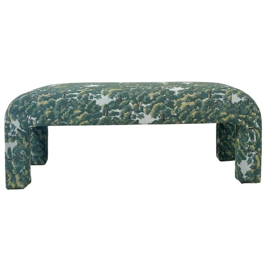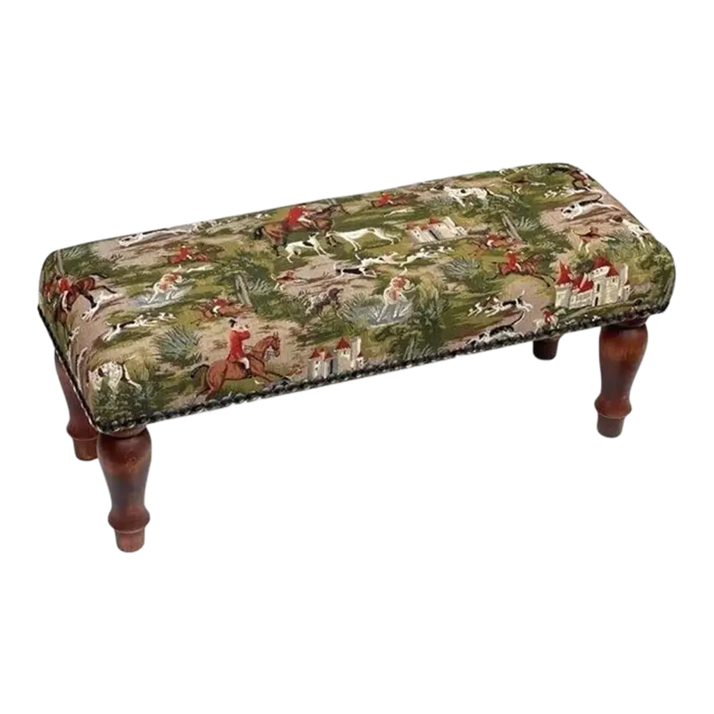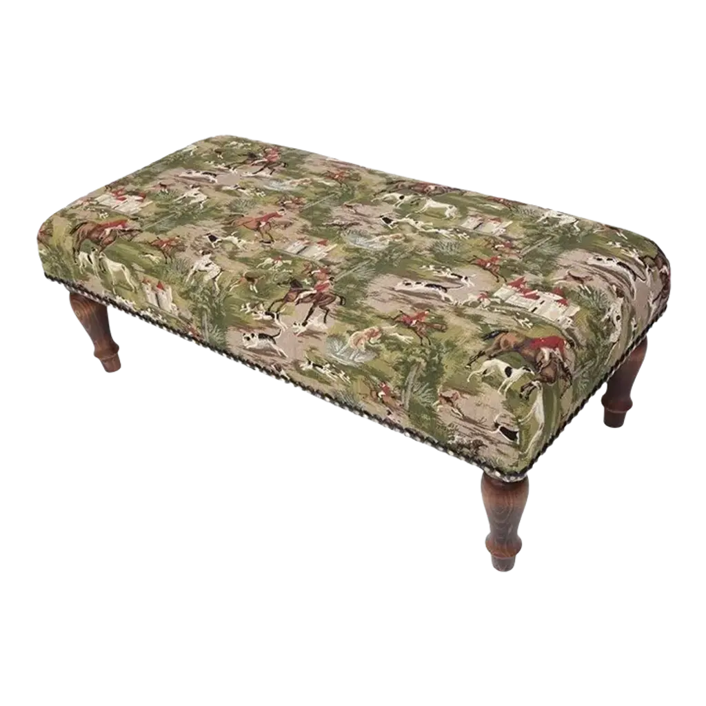 Hand upholstered in the UK with classical studding and hand polished solid beech legs, ideal for an extra seat or a centre piece in a living room.